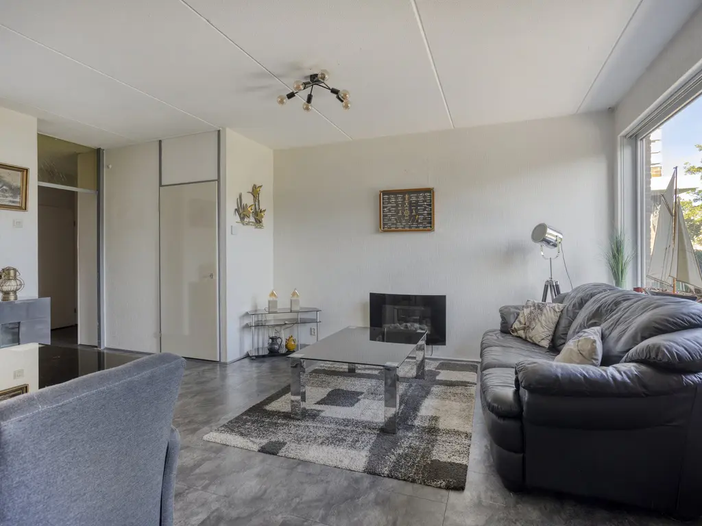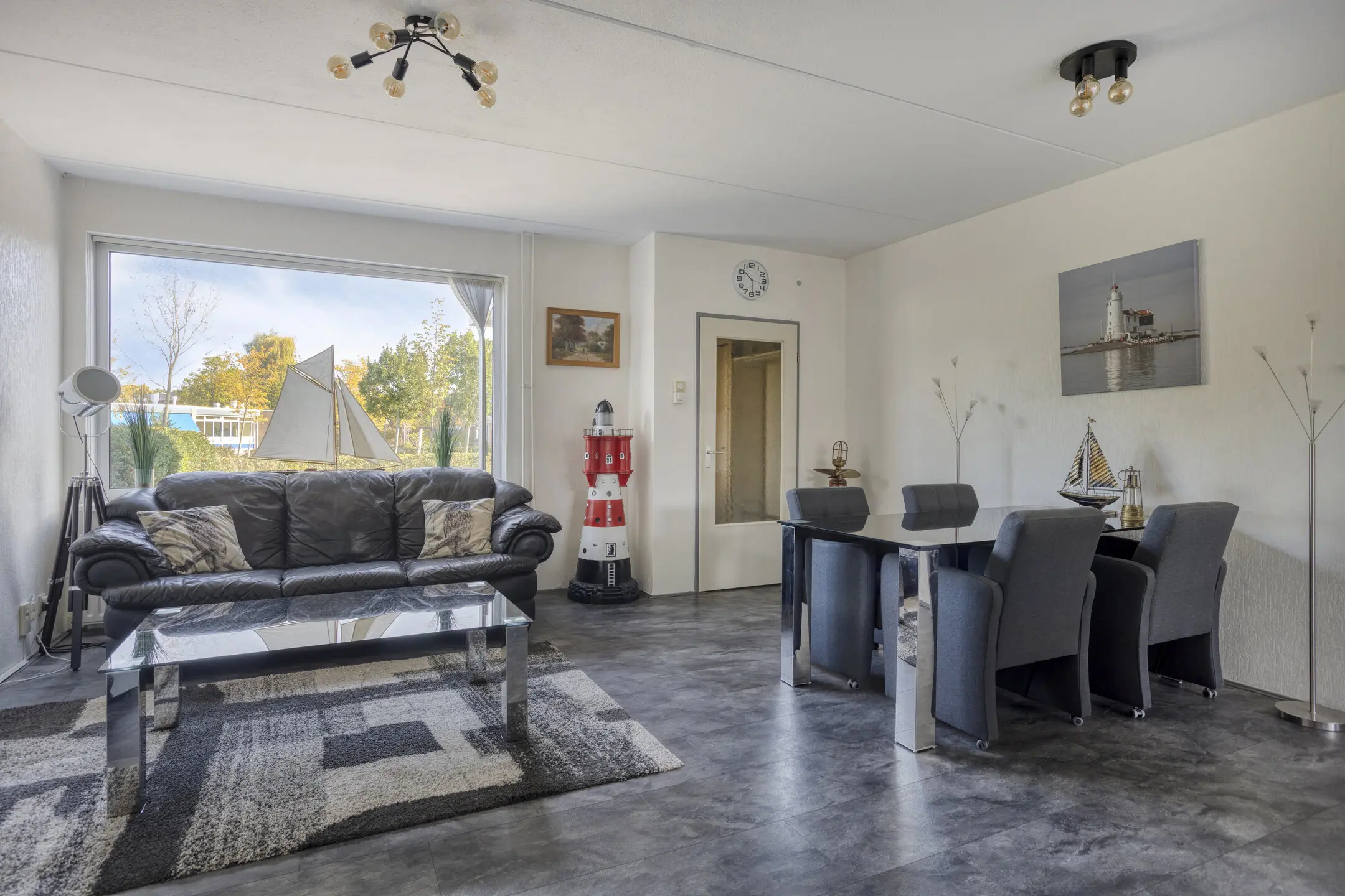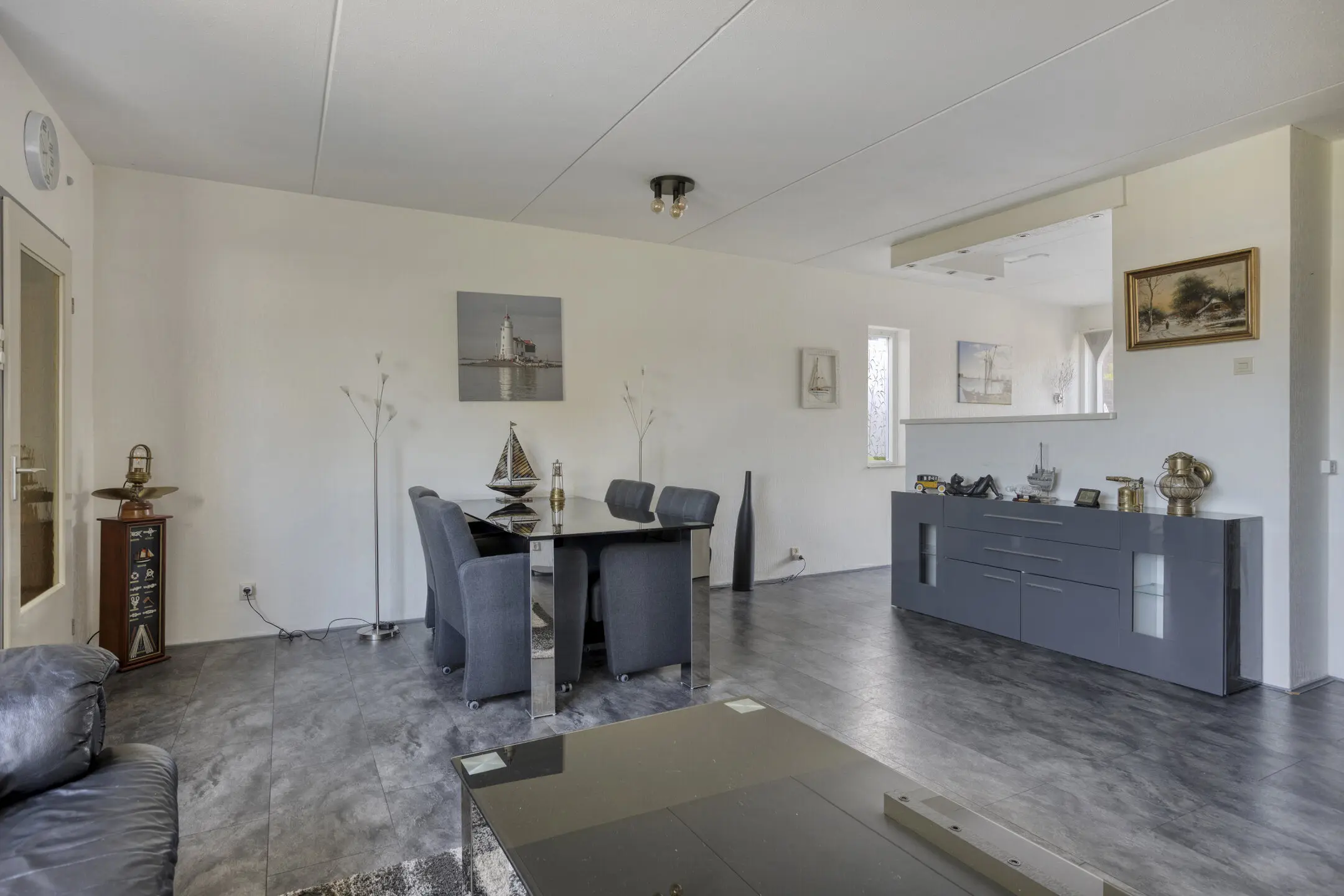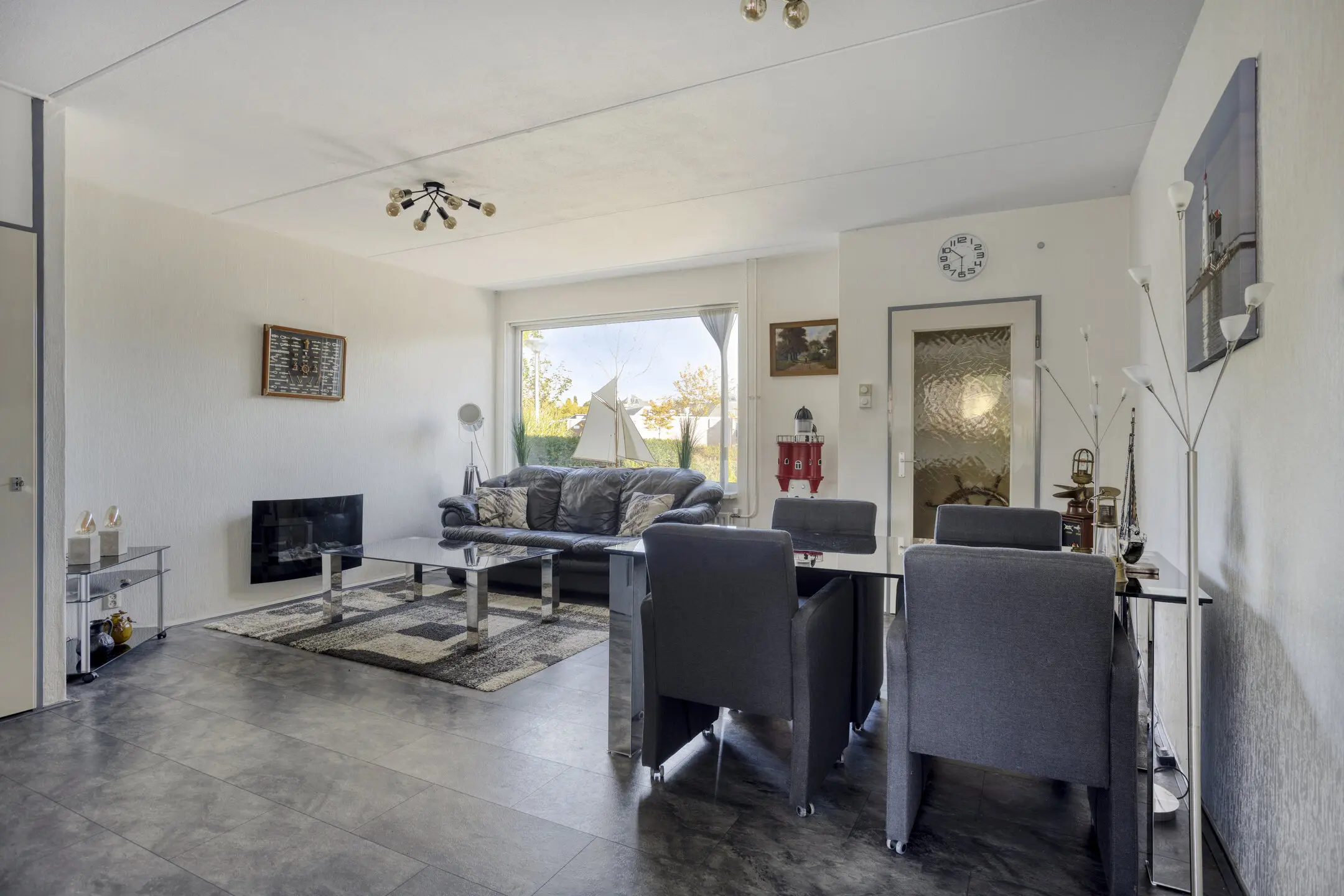 De ruime en lichte woonkamer (ca. 30 m2) is gelegen aan de voorzijde van de woning en is voorzien van een lichte laminaatvloer en een praktische trapkast.