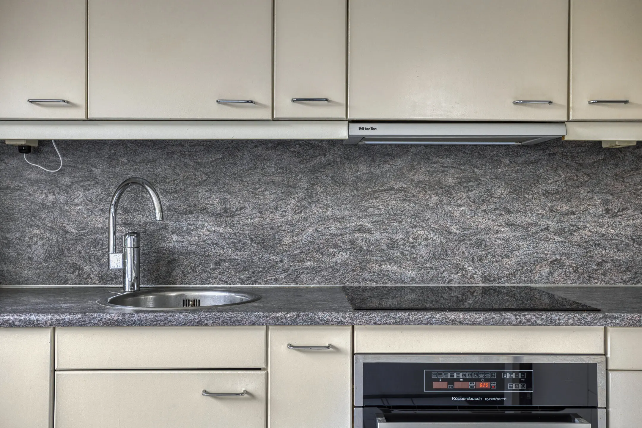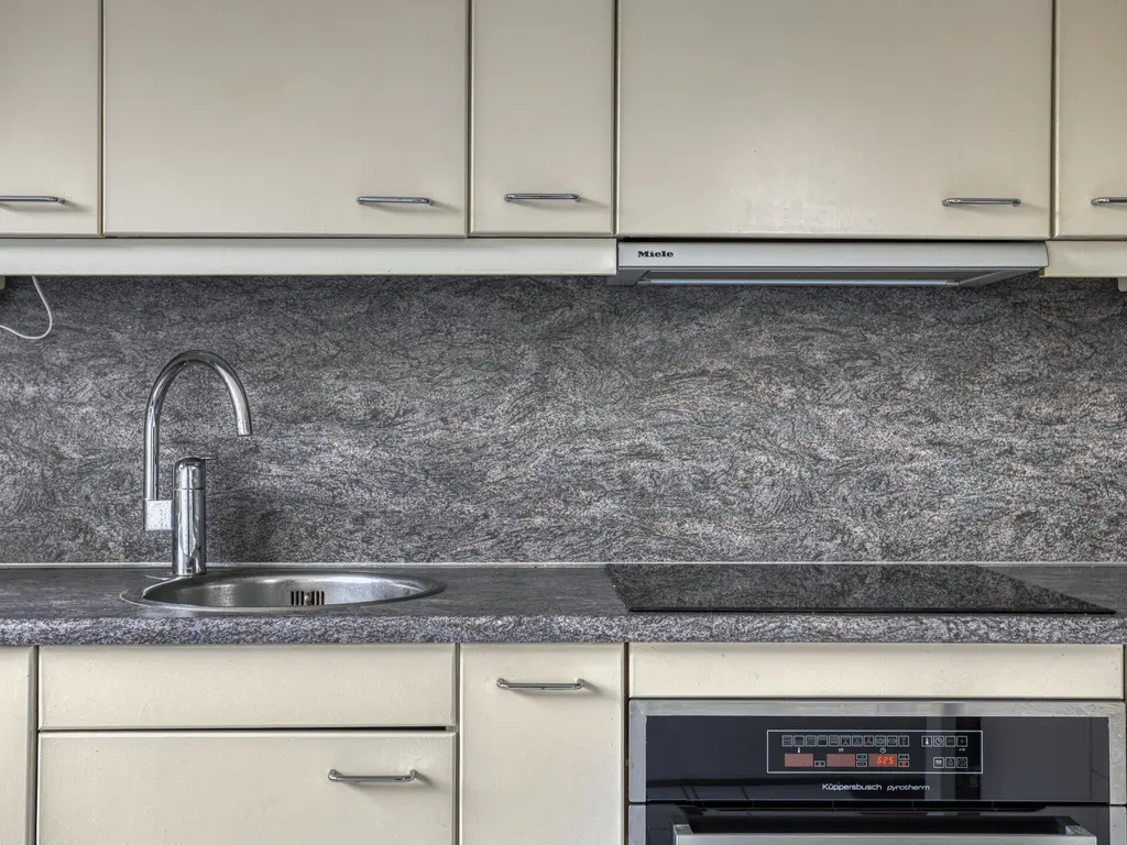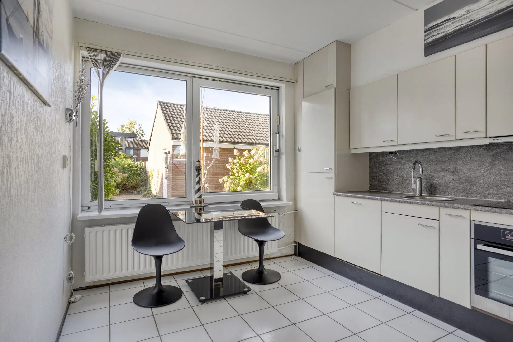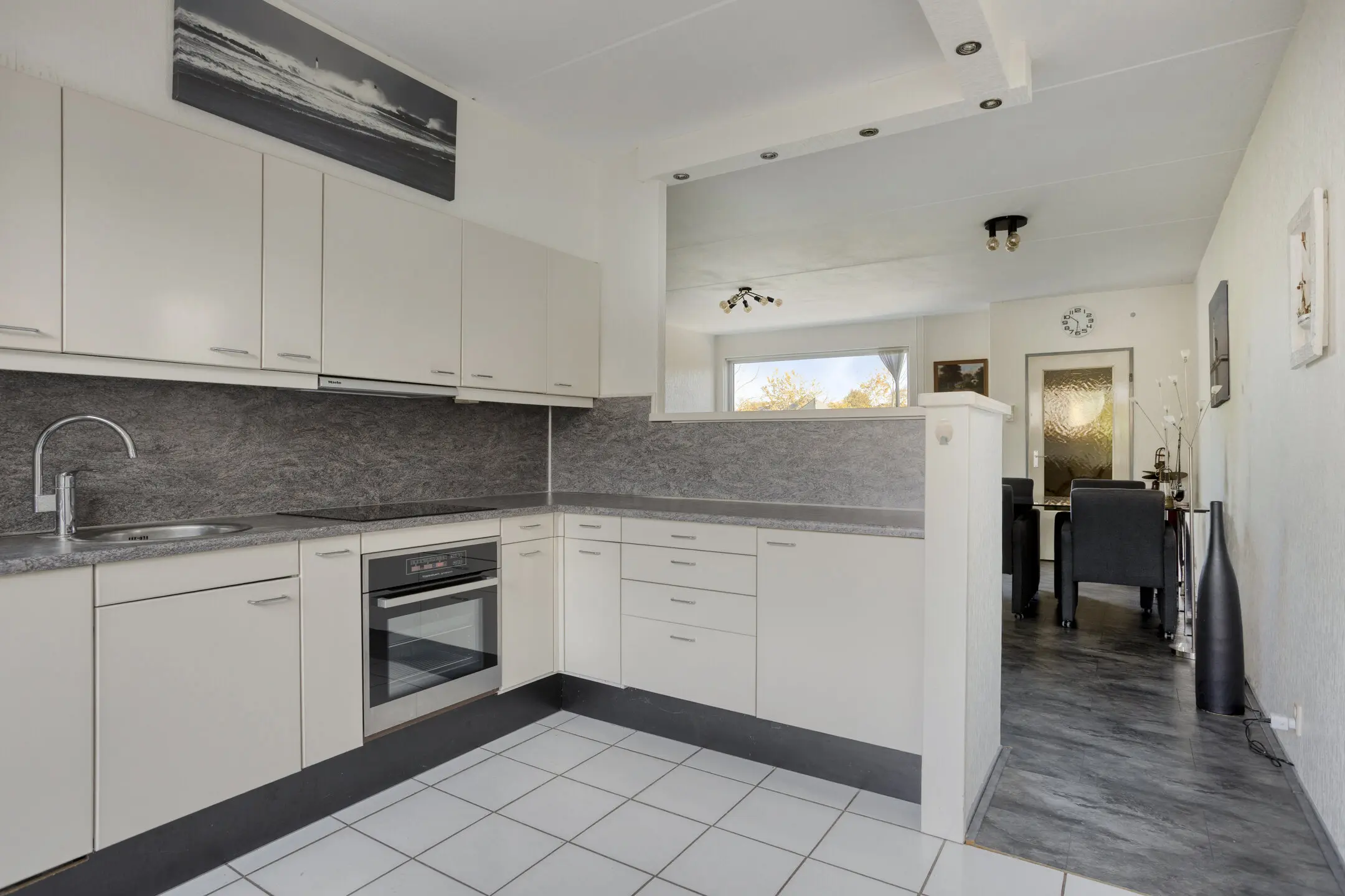 De moderne open keuken (ca. 11 m2) is gelegen aan de achterzijde van de woning en is uitgevoerd in een L-opstelling. Deze complete keuken is voorzien van een koelkast, vrieskast, inductie kookplaat, afzuigkap, oven en een vaatwasser. Tevens beschikt de keuken over een enkele spoelbak en kastruimte.