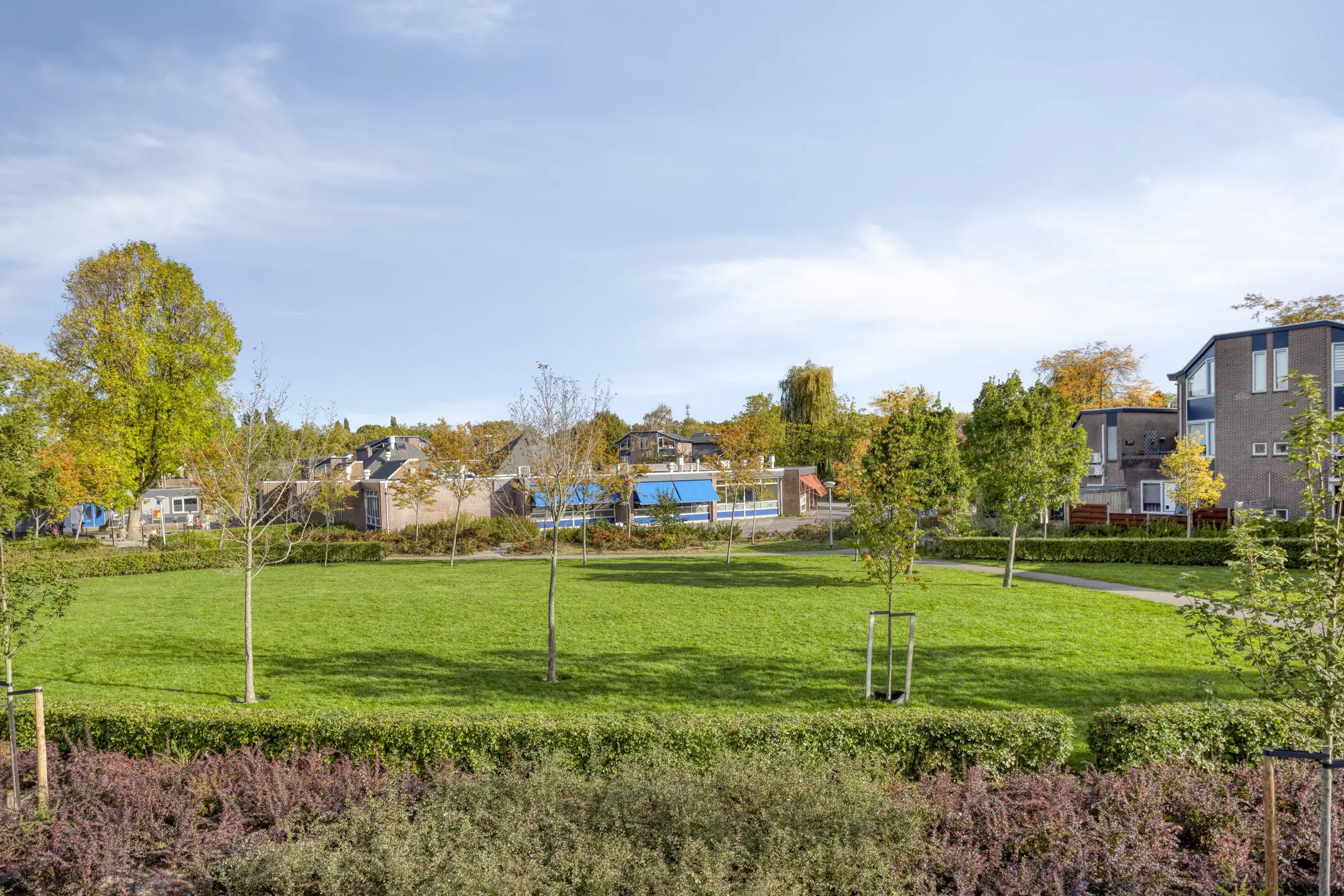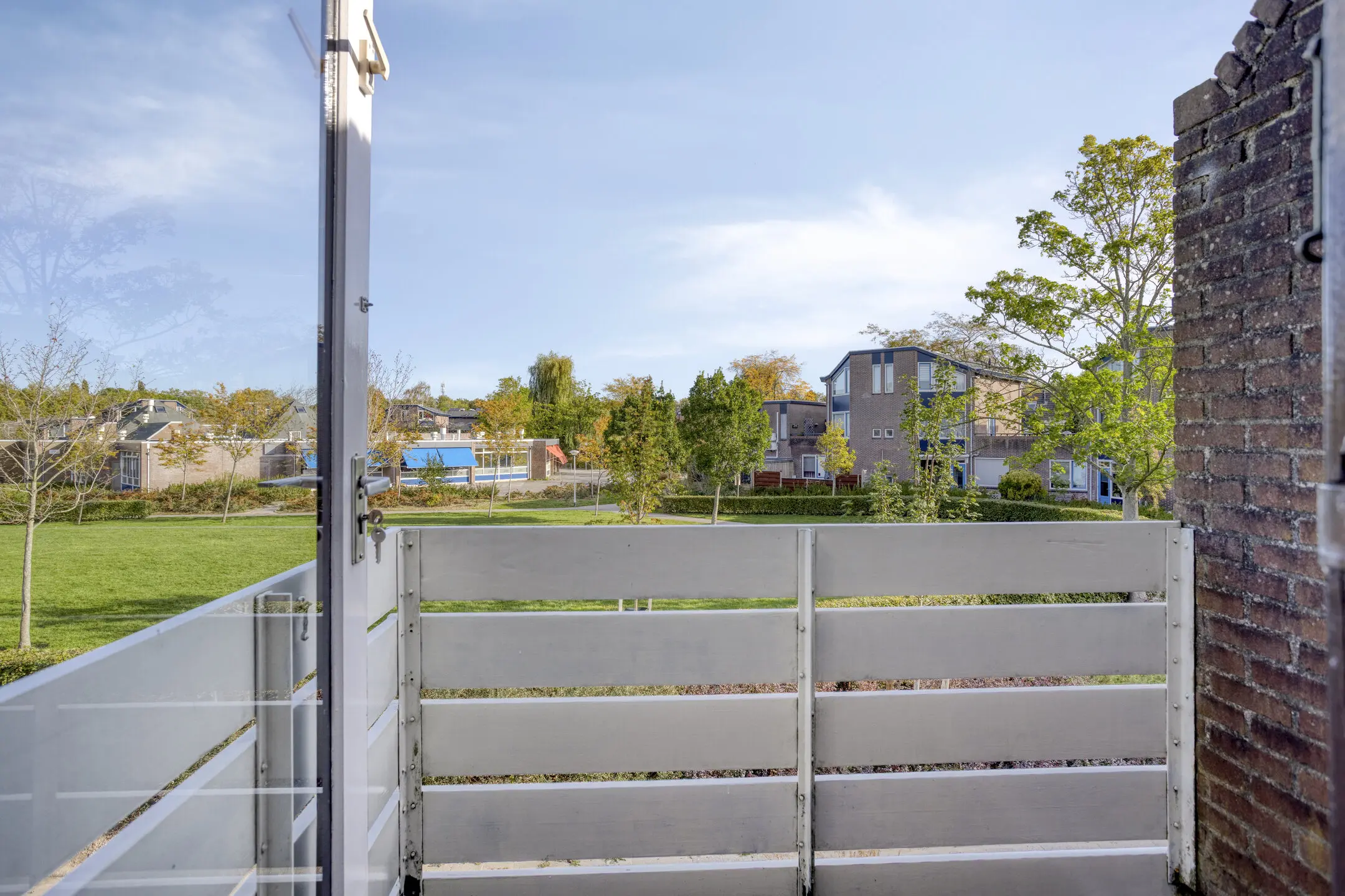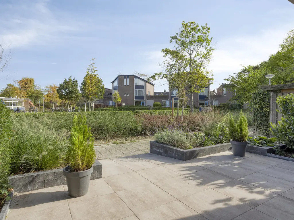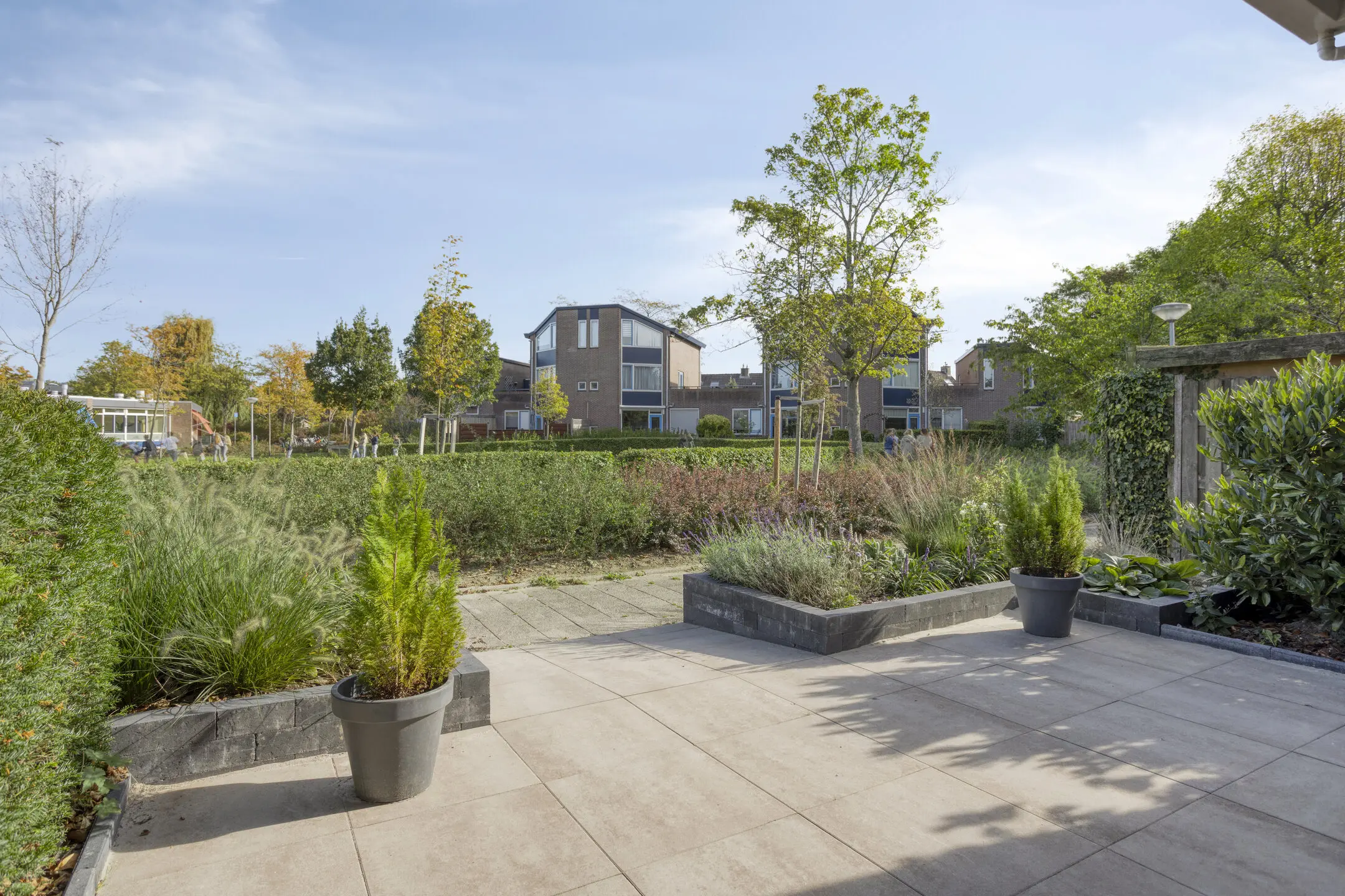 De woning ligt aan een autovrij plein, direct aan de voorkant van het huis. Op dit plein bevinden zich speeltoestellen, waardoor kinderen veilig en zorgeloos buiten kunnen spelen zonder verkeer van auto’s. De voortuin is gelegen op het noordoosten en is vrij aangelegd met sierbeplantingen en bestrating. Verder beschikt de voortuin over een handige buitenkraan.
