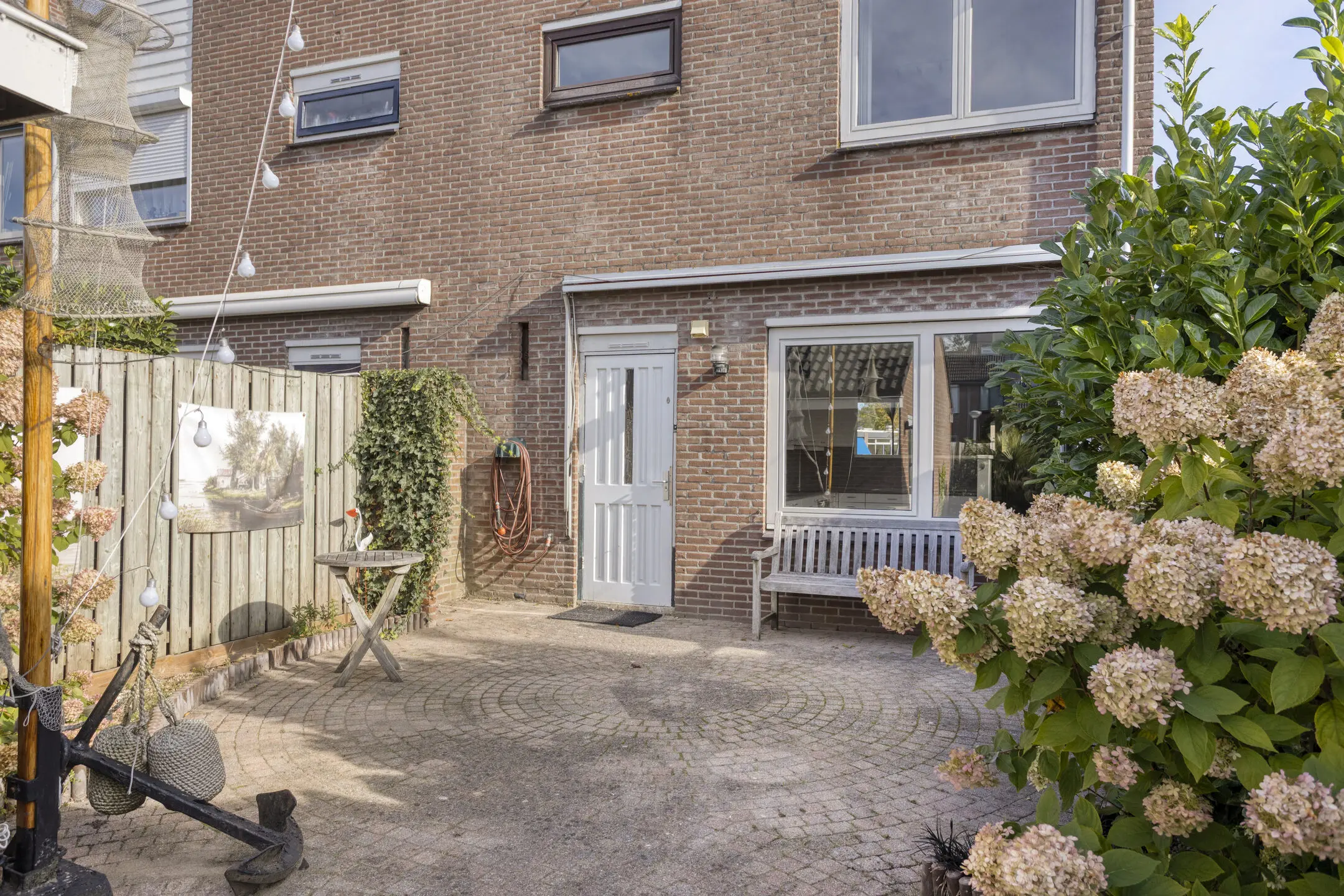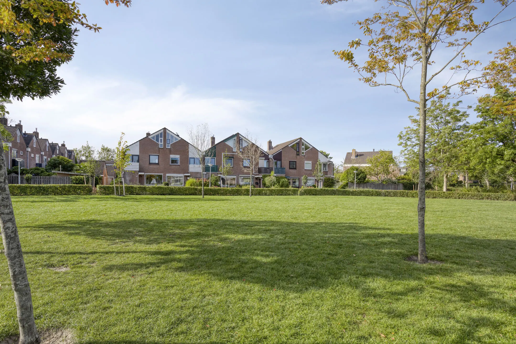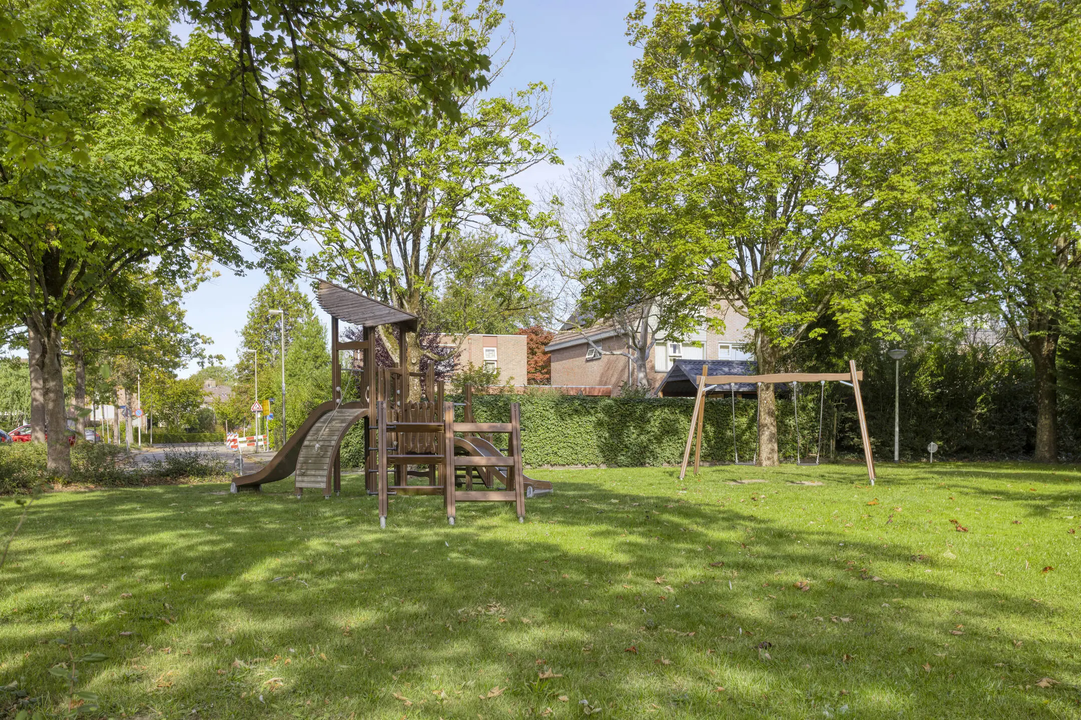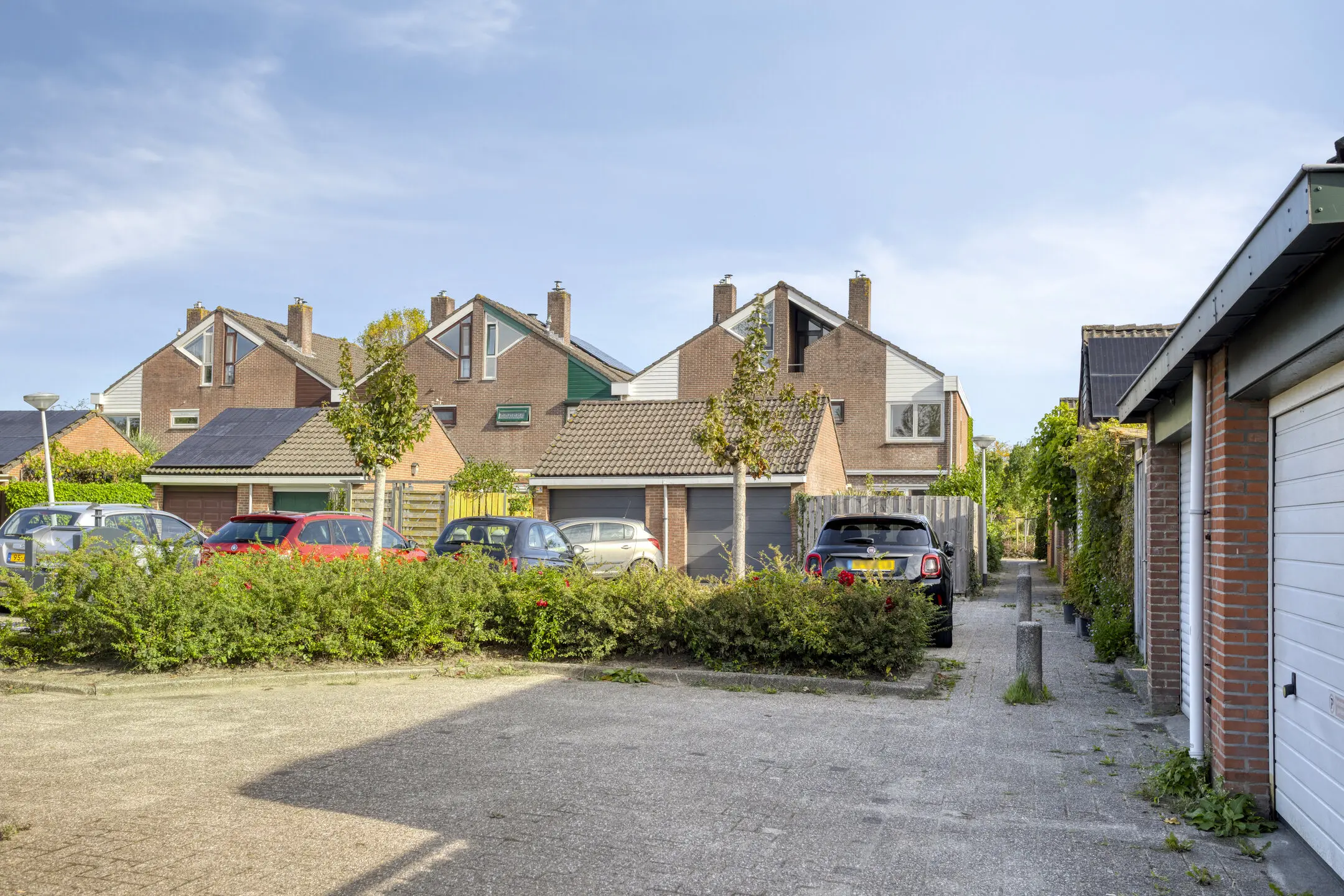 De woning ligt aan een autovrij plein, direct aan de voorkant van het huis. Op dit plein bevinden zich speeltoestellen, waardoor kinderen veilig en zorgeloos buiten kunnen spelen zonder verkeer van auto’s. De voortuin is gelegen op het noordoosten en is vrij aangelegd met sierbeplantingen en bestrating. Verder beschikt de voortuin over een handige buitenkraan.