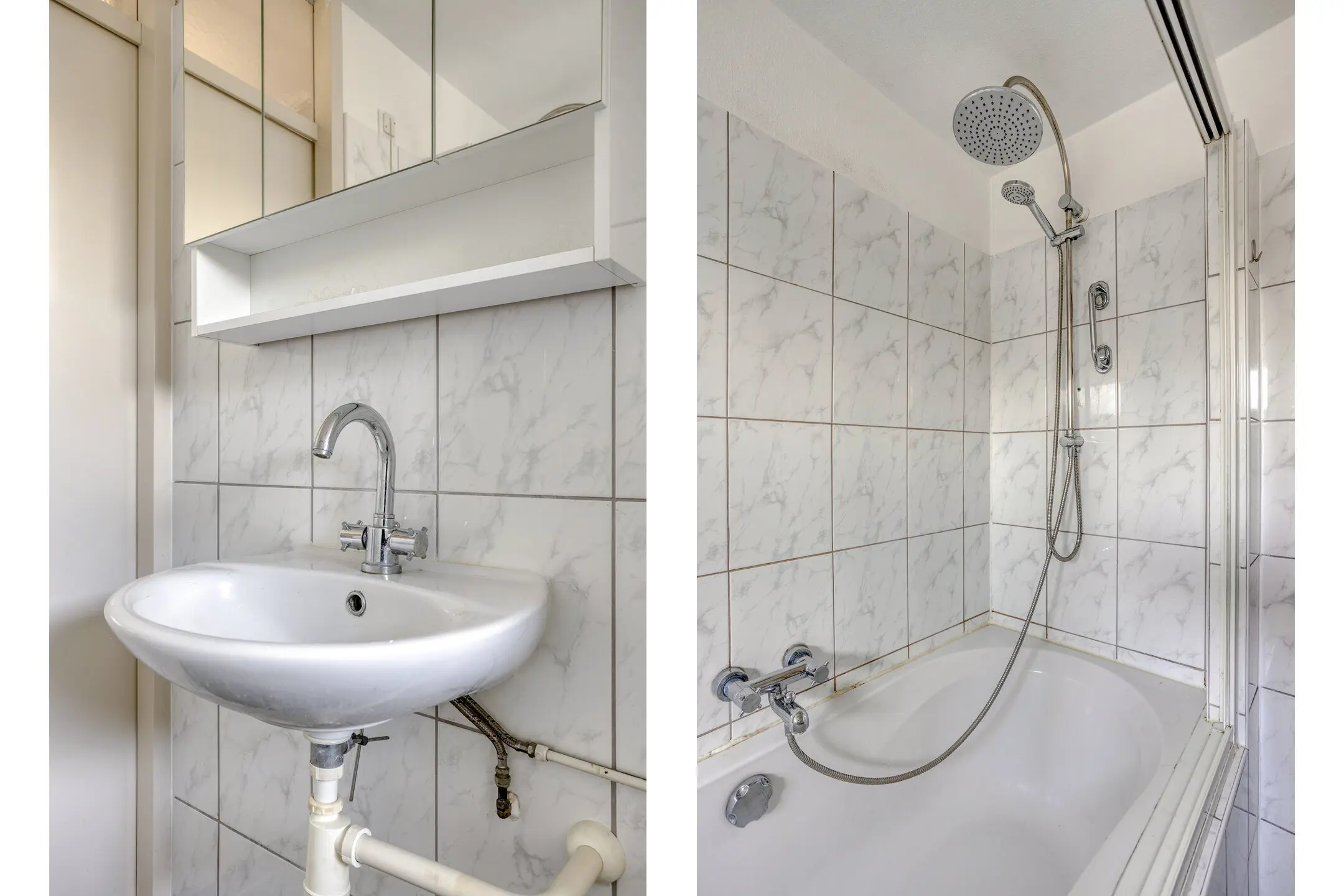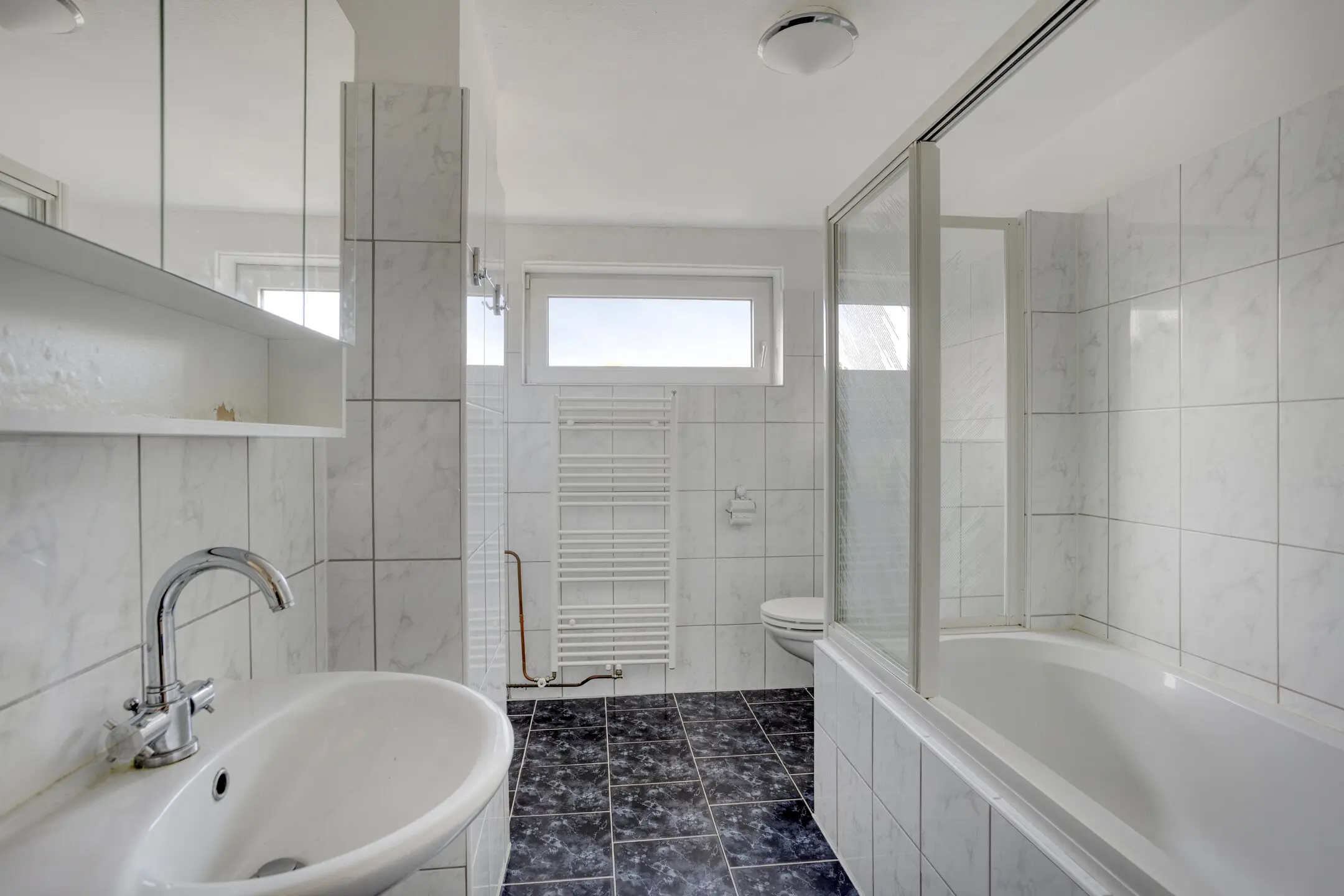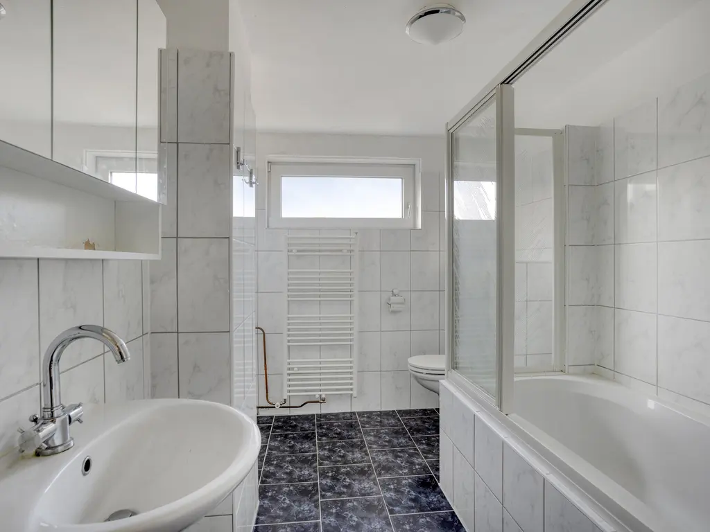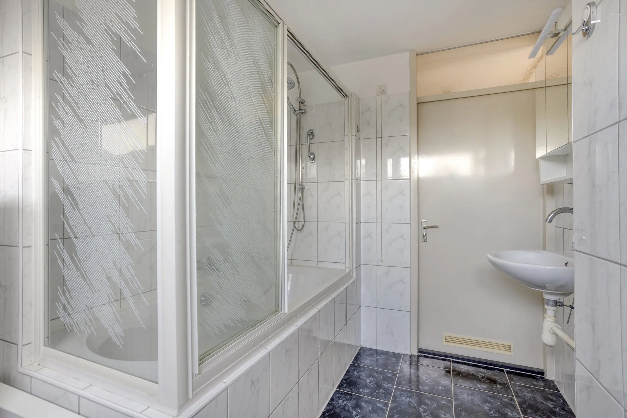 De badkamer (ca. 7 m2) heeft sanitaire voorzieningen zoals een ligbad met douchescherm en douche, wastafel, spiegel met spiegelkast, verlichting, hangend tweede toilet en de wasmachine- en drogeraansluiting. De badkamer is geheel betegeld in een lichte kleurstelling.