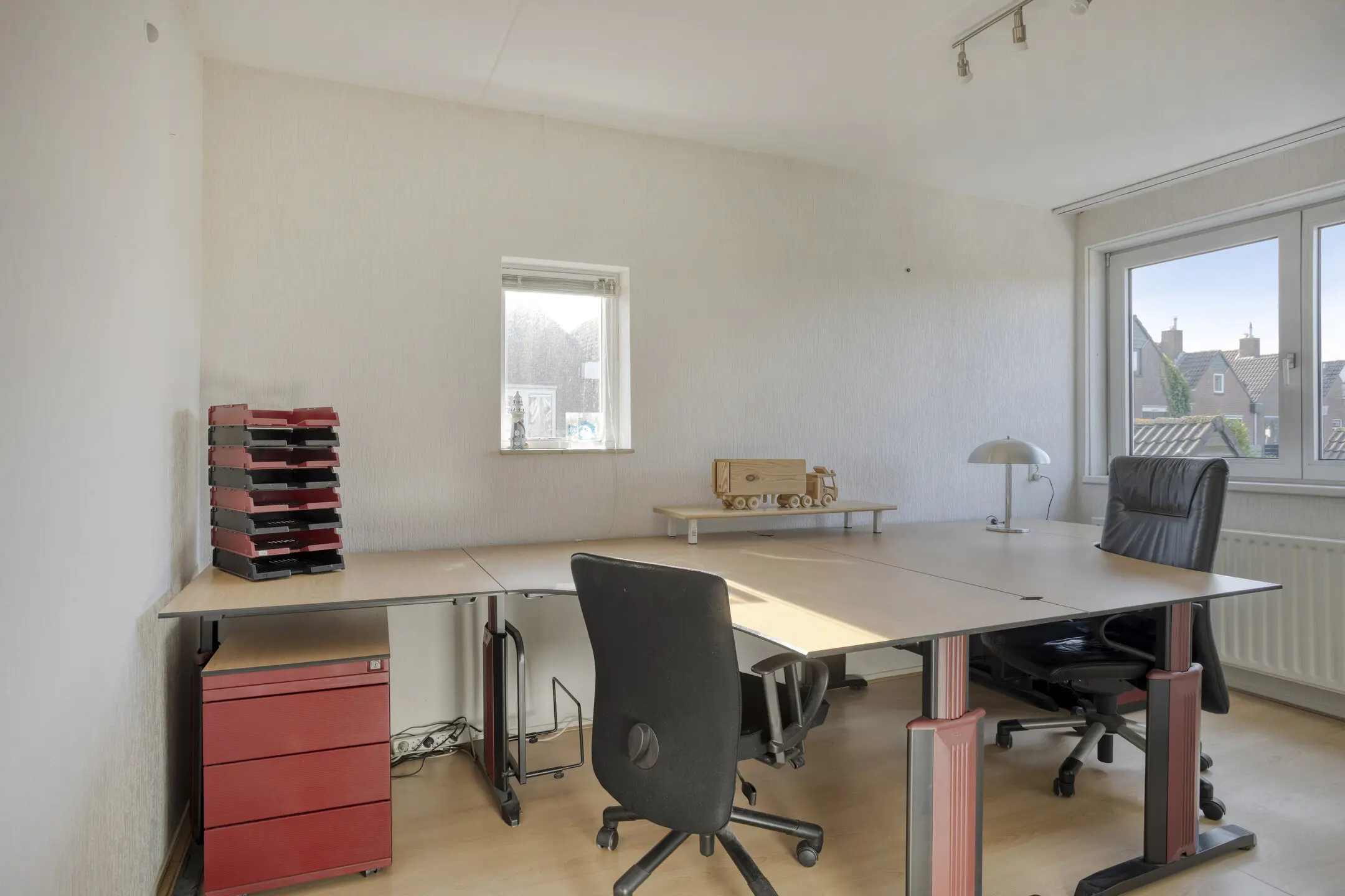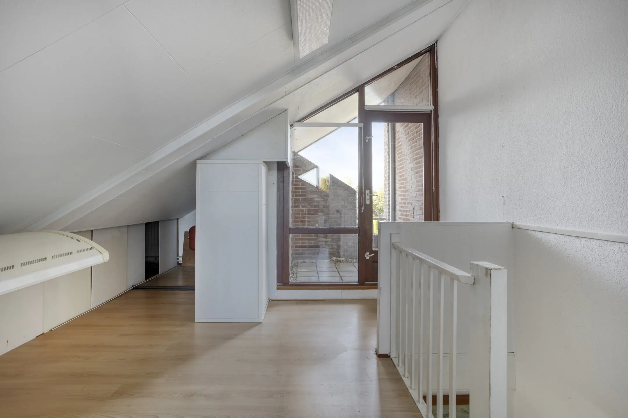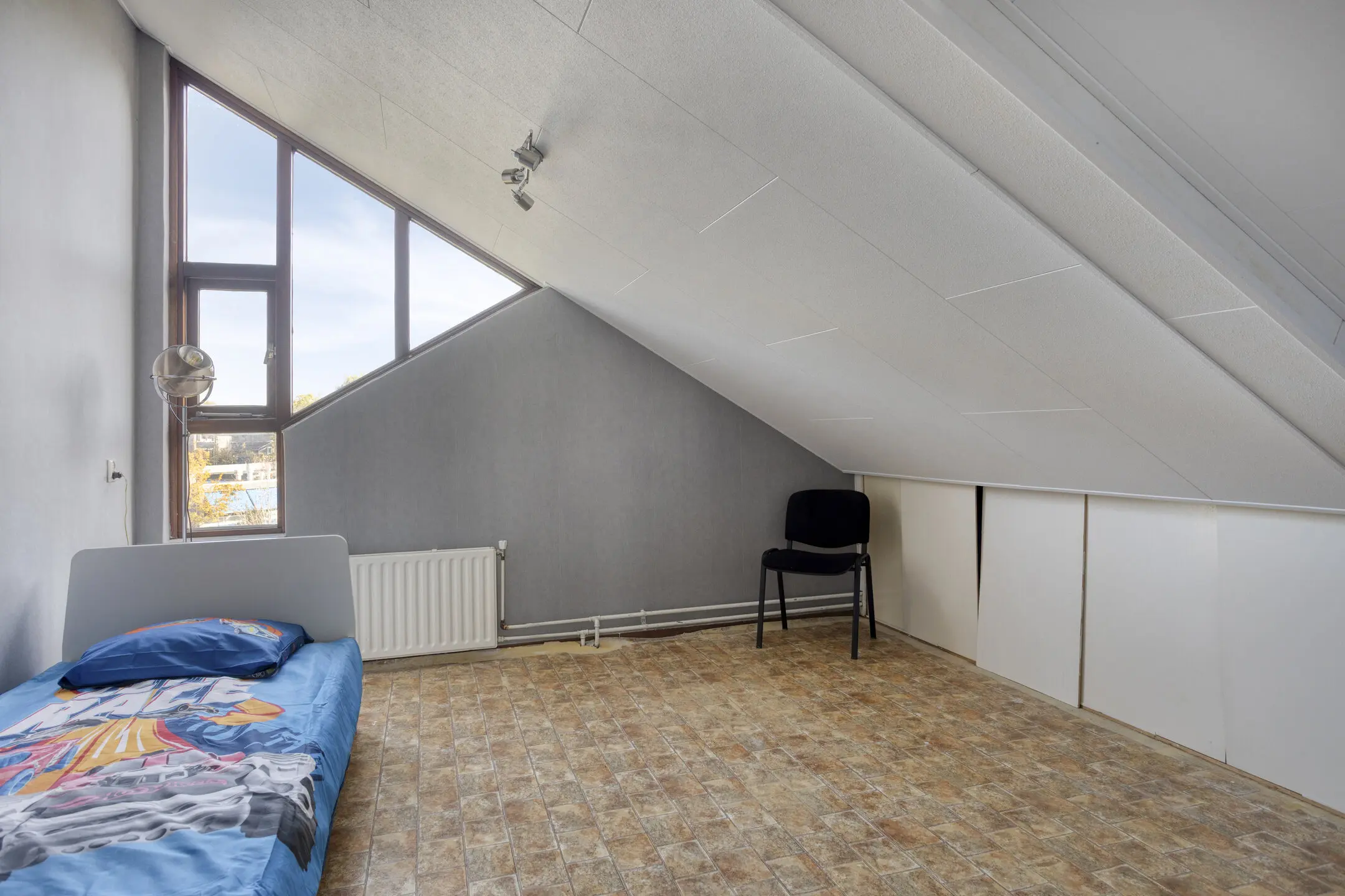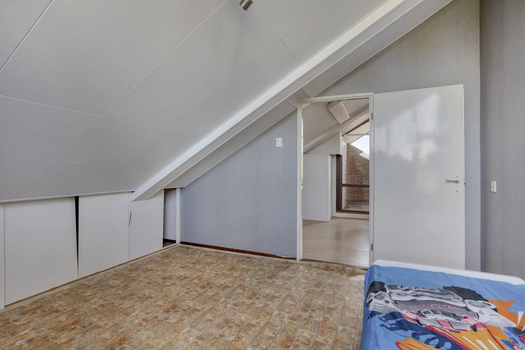 Slaapkamer 3 (ca. 10 m2) is gelegen aan de voorzijde van de woning en is voorzien van linoleum vloer en bergruimte achter het knieschot. Deze slaapkamer biedt een aangename natuurlijke lichtinval door de grote raampartij.