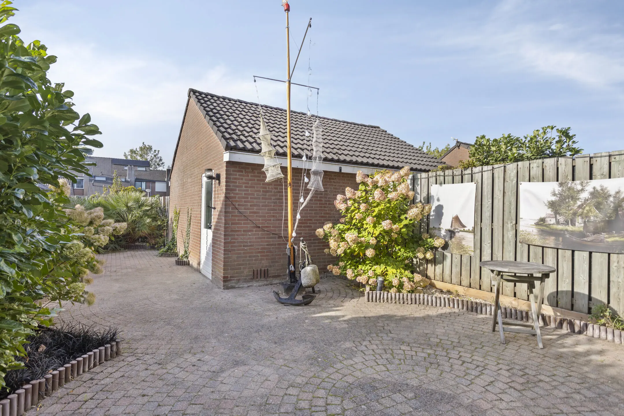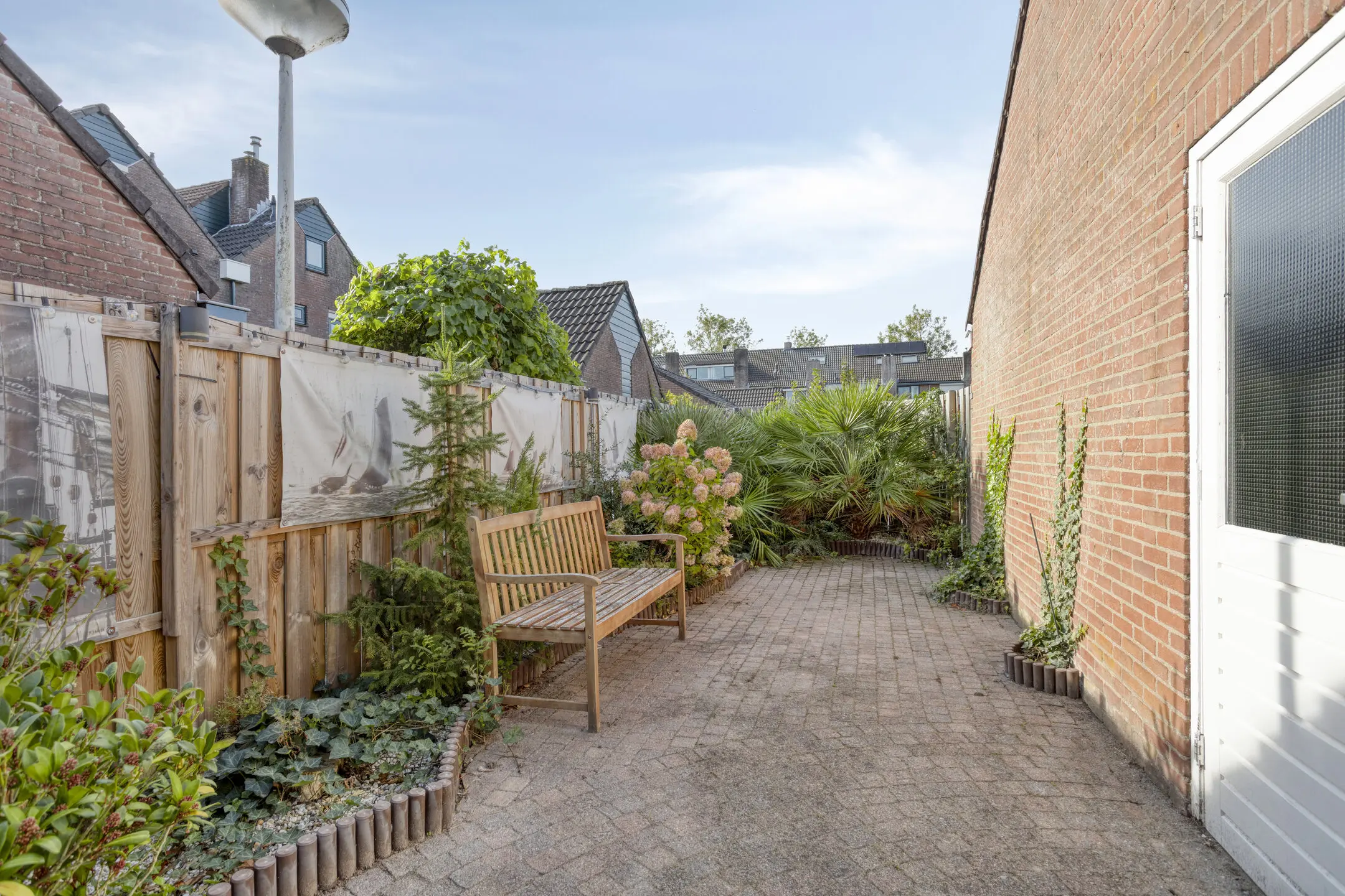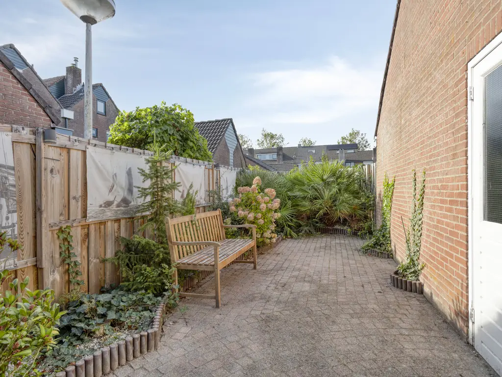 De achtertuin is gelegen op het zonnige zuidwesten en grenst aan een hof met vele parkeergelegenheid. De achtertuin beschikt over achterom, bestrating, beplanting, handmatig bedienbaar zonnescherm, buitenkraan en toegang tot de garage.