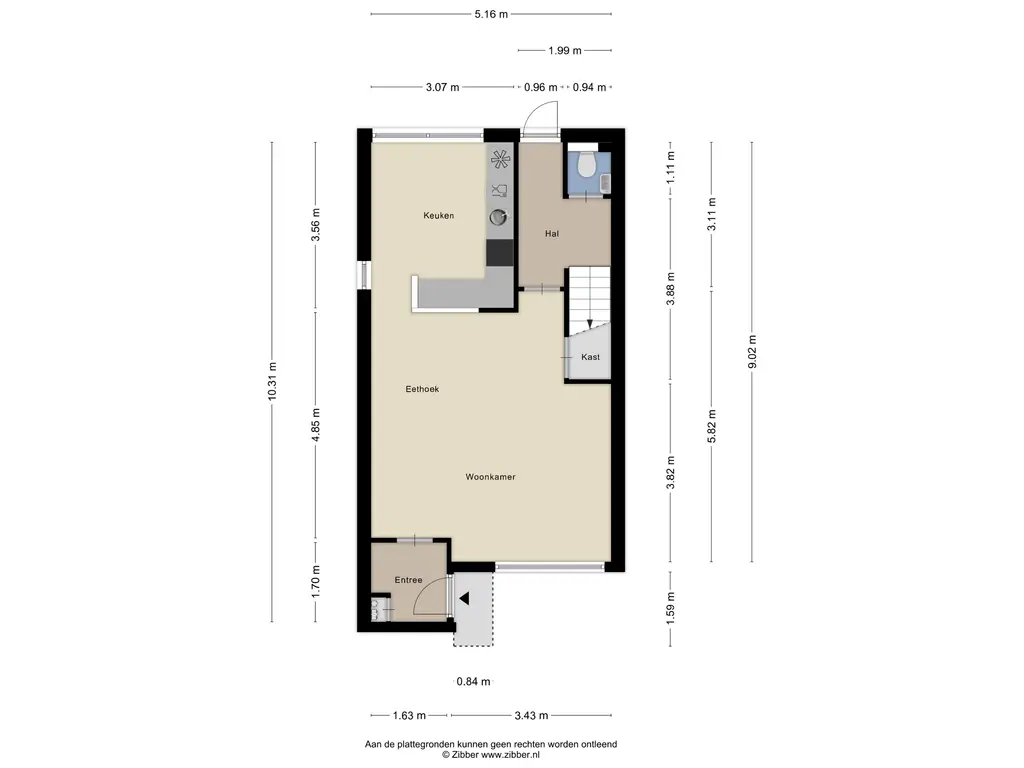 Binnenhal met trap naar de 1e verdieping, toegang tot de achtertuin en een toiletruimte voorzien van een hangend toilet en fonteintje. De toiletruimte is geheel betegeld en afgewerkt met spotjes.