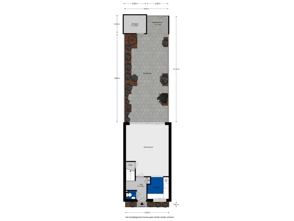 Achter (en een klein strookje aan de voorzijde) heb je buitenruimte, met als highlight de achtertuin van ca. 63 m² op het zuidwesten: middag- en avondzon, dus na werk nog even buiten zitten is hier echt een ding. Er is ook een vrijstaande stenen berging voor fietsen en opslag.