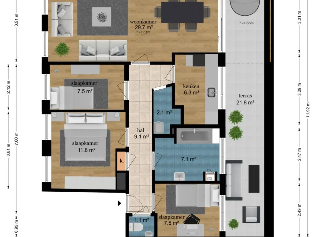 • Drie volwaardige slaapkamers