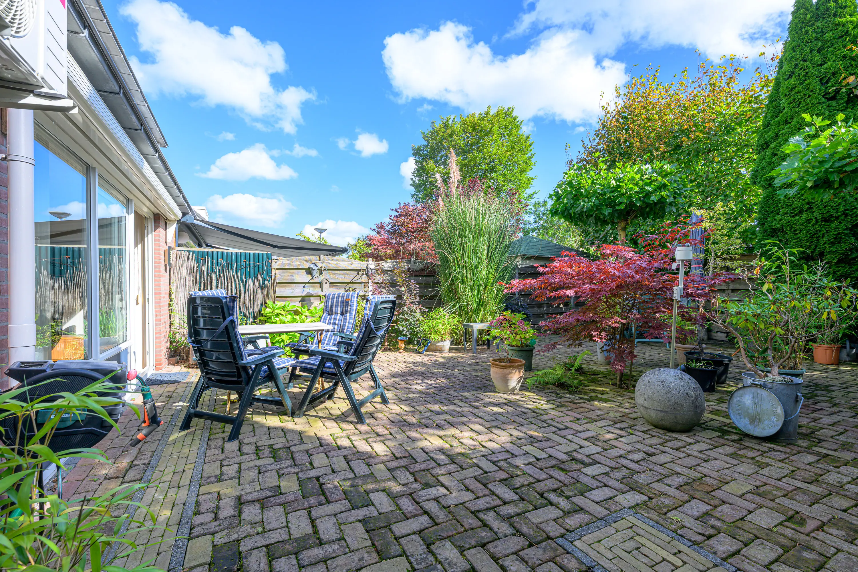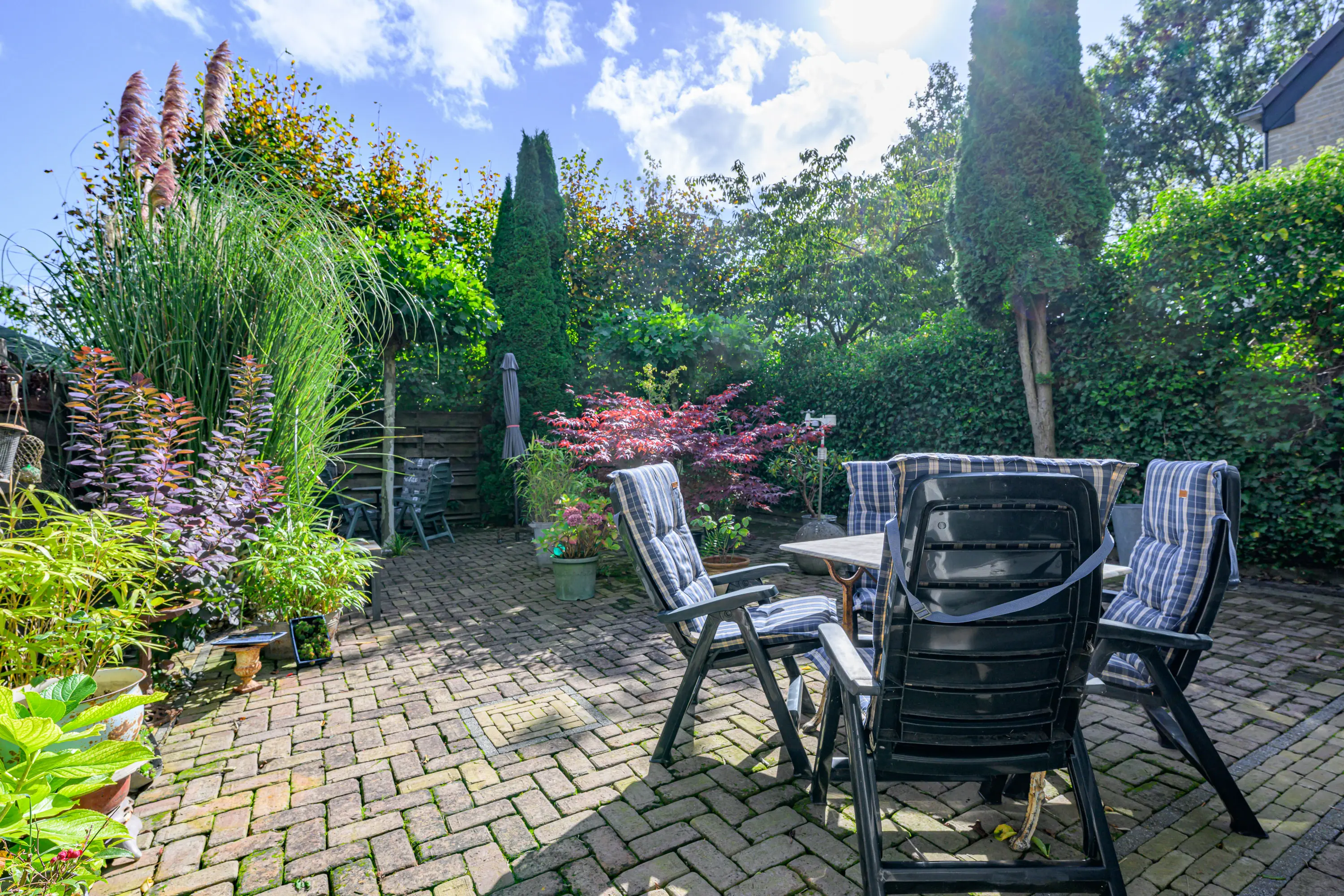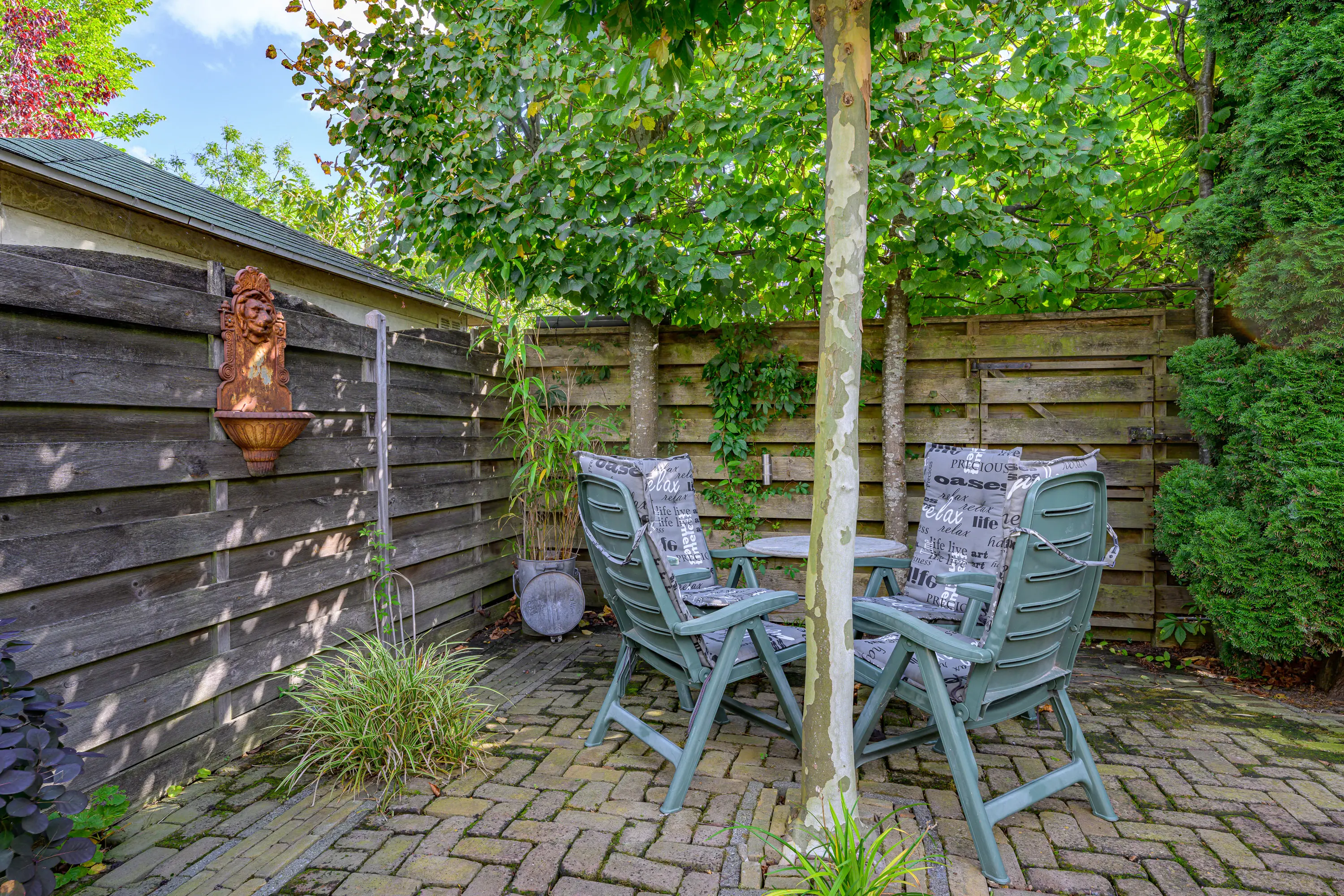 De achtertuin is gelegen op het oosten, voorzien van sierbestrating en heeft door de aanwezige bomen en struiken een prettig en groen karakter. Door de vrije ligging van de tuin heeft de tuin veel zonuren en zo geniet u dus lang van het zonnetje. Ook zorgt het niet hebben van direct achterburen voor veel privacy. Het betreft dus echt een tuin waar u kunt tuinieren en tot rust kunt komen.