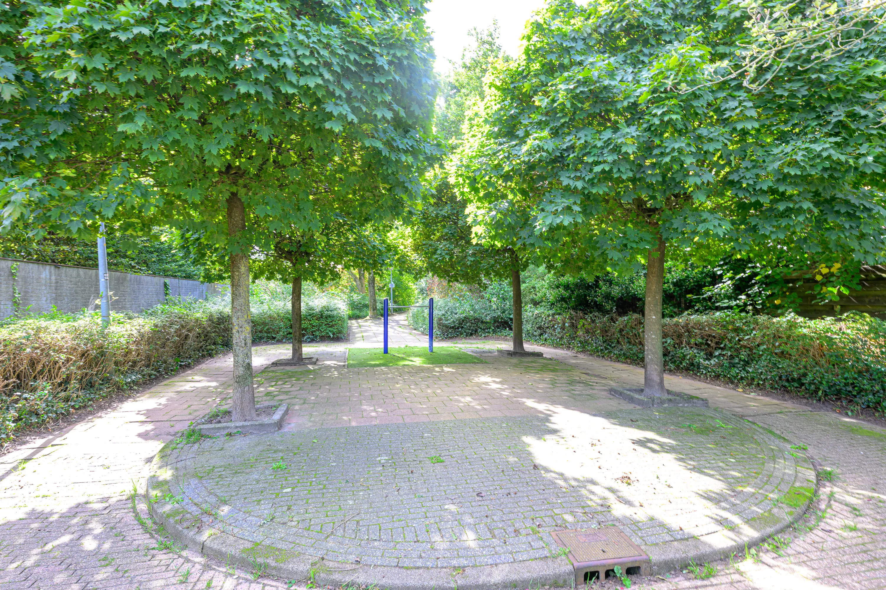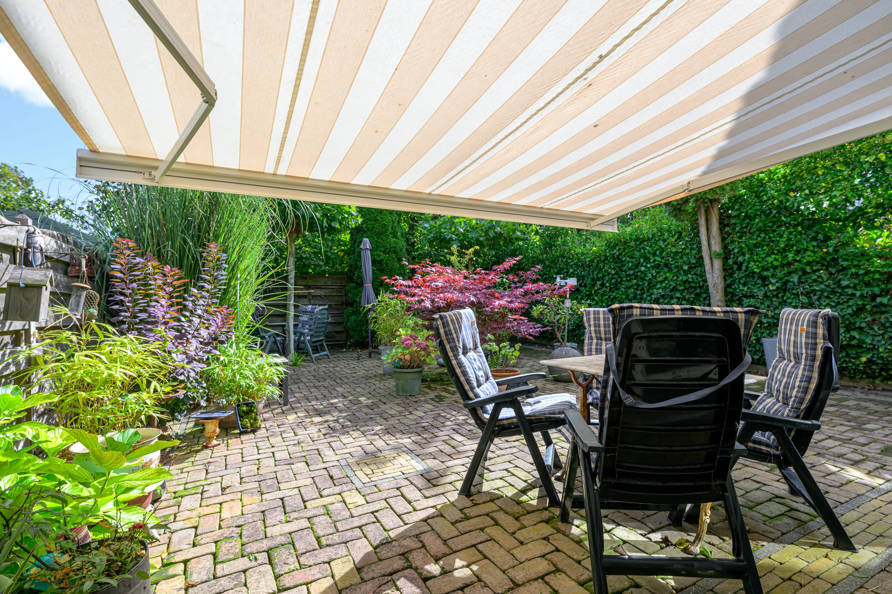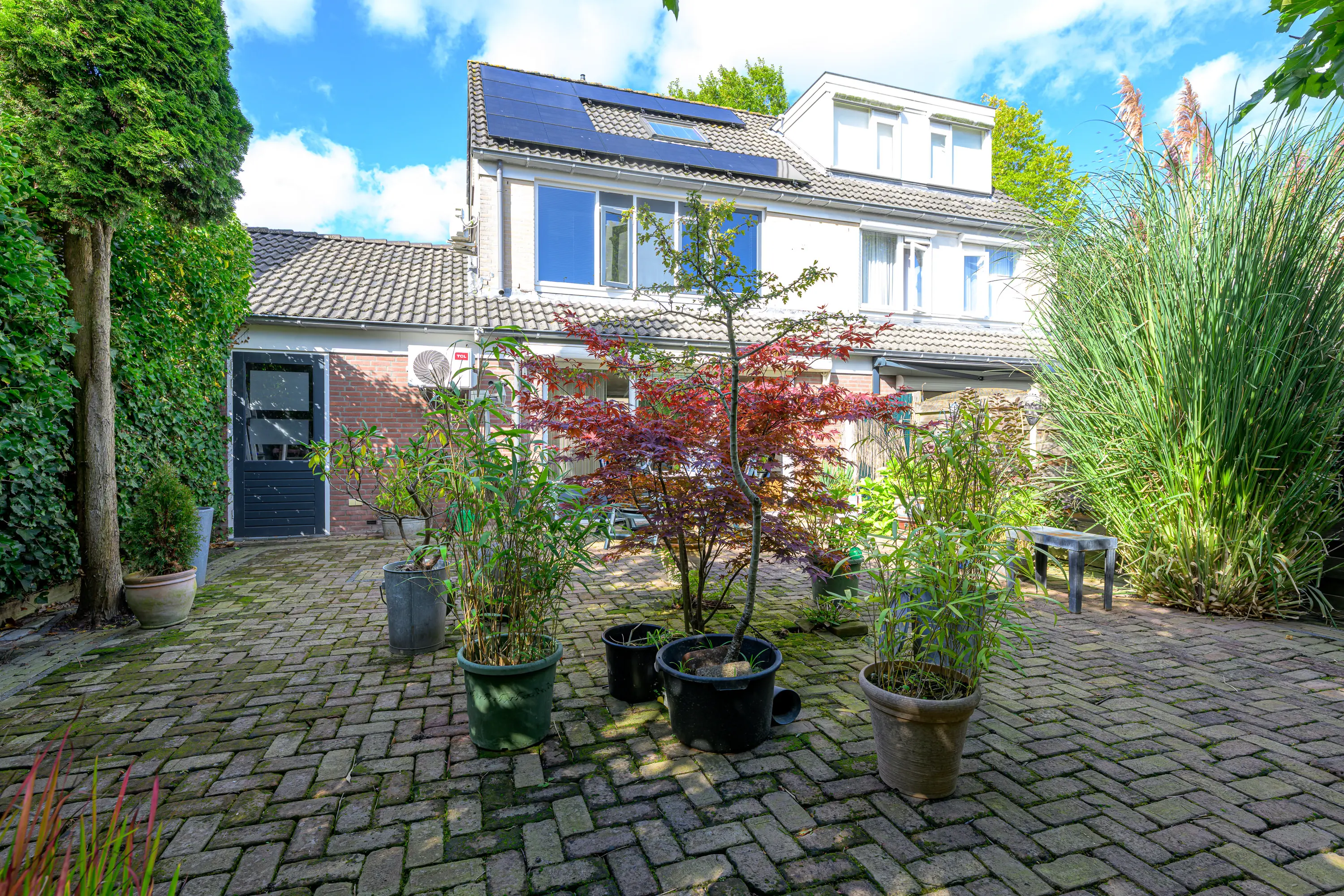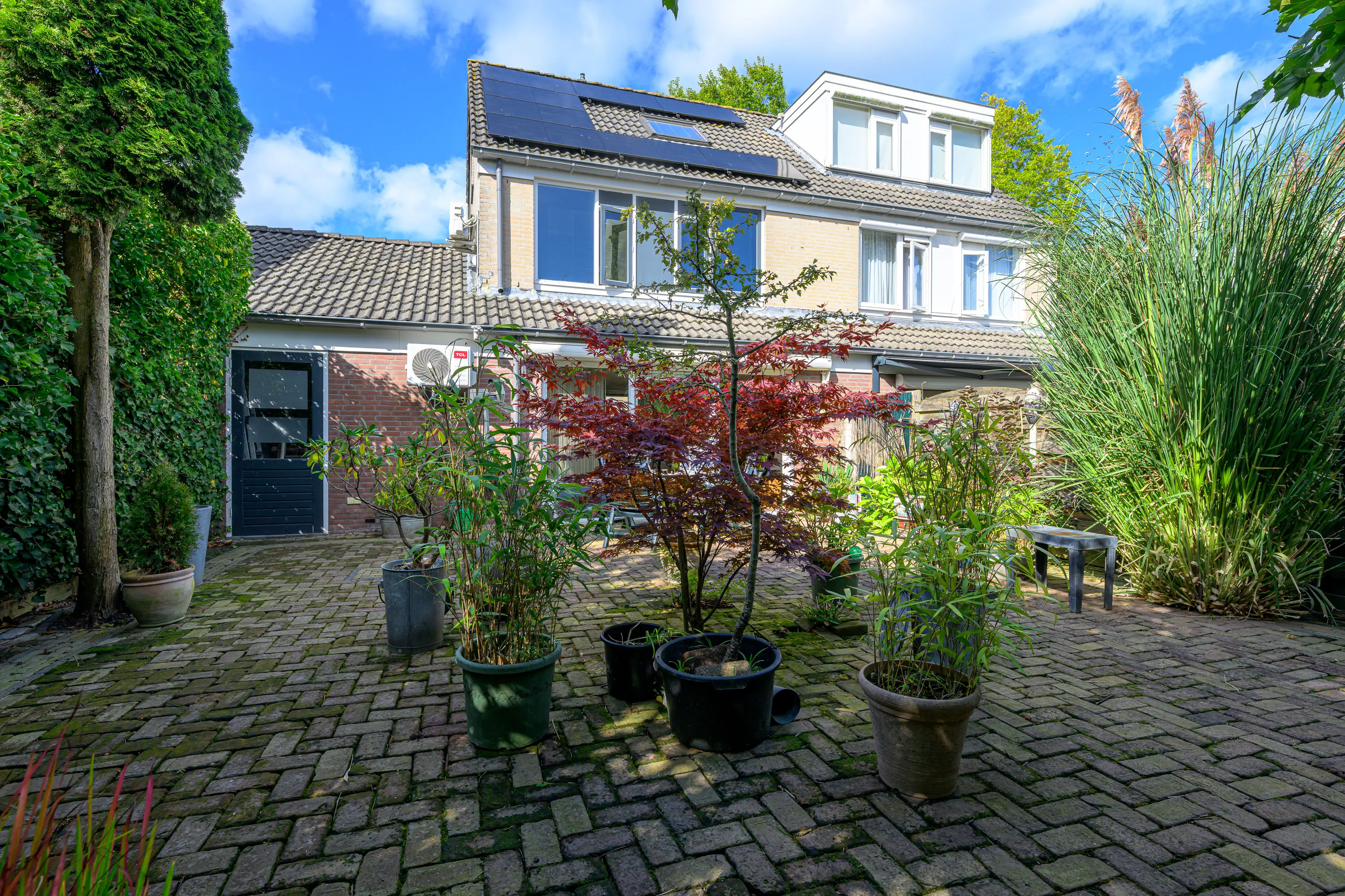 De achtertuin is gelegen op het oosten, voorzien van sierbestrating en heeft door de aanwezige bomen en struiken een prettig en groen karakter. Door de vrije ligging van de tuin heeft de tuin veel zonuren en zo geniet u dus lang van het zonnetje. Ook zorgt het niet hebben van direct achterburen voor veel privacy. Het betreft dus echt een tuin waar u kunt tuinieren en tot rust kunt komen.