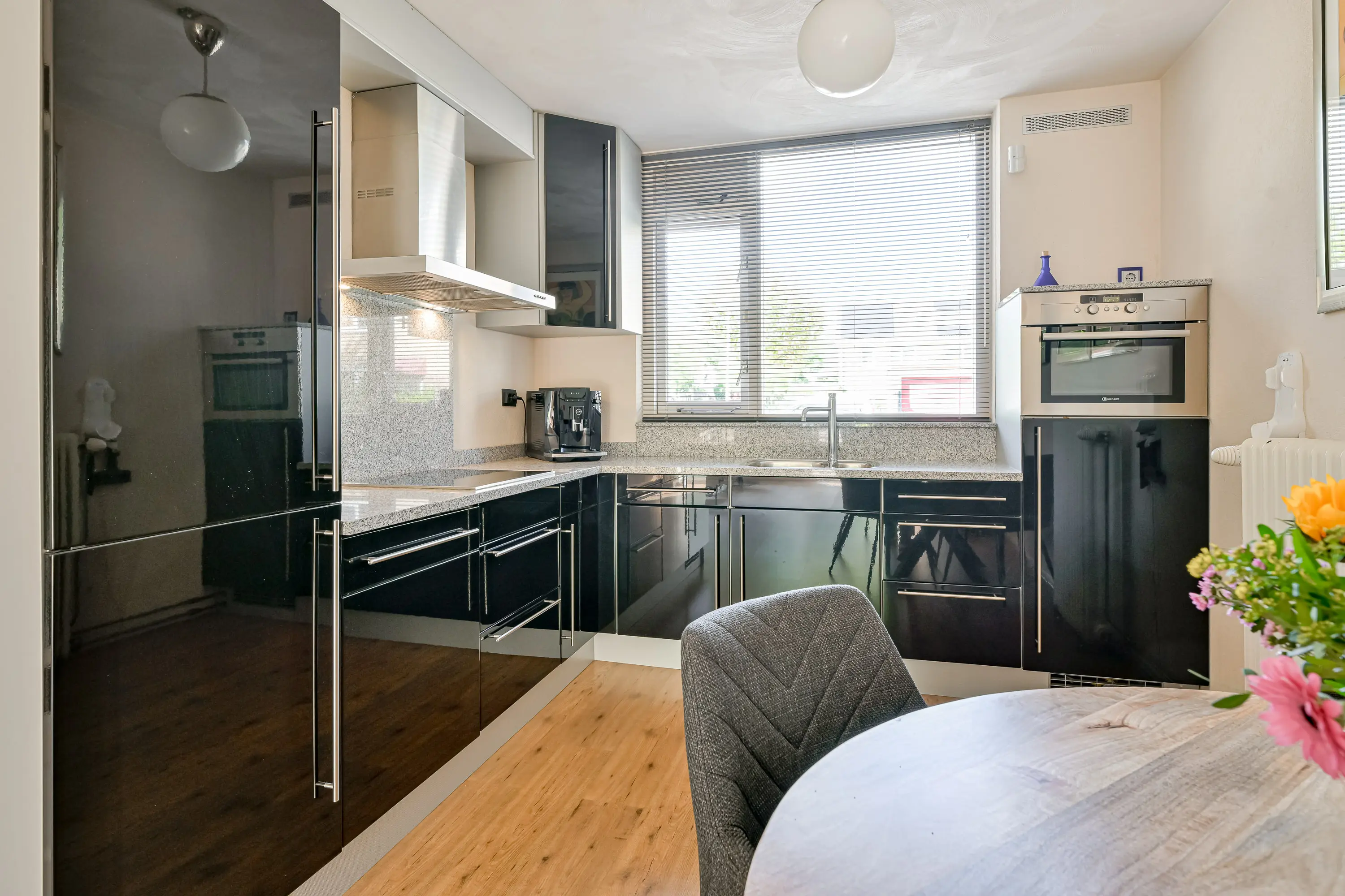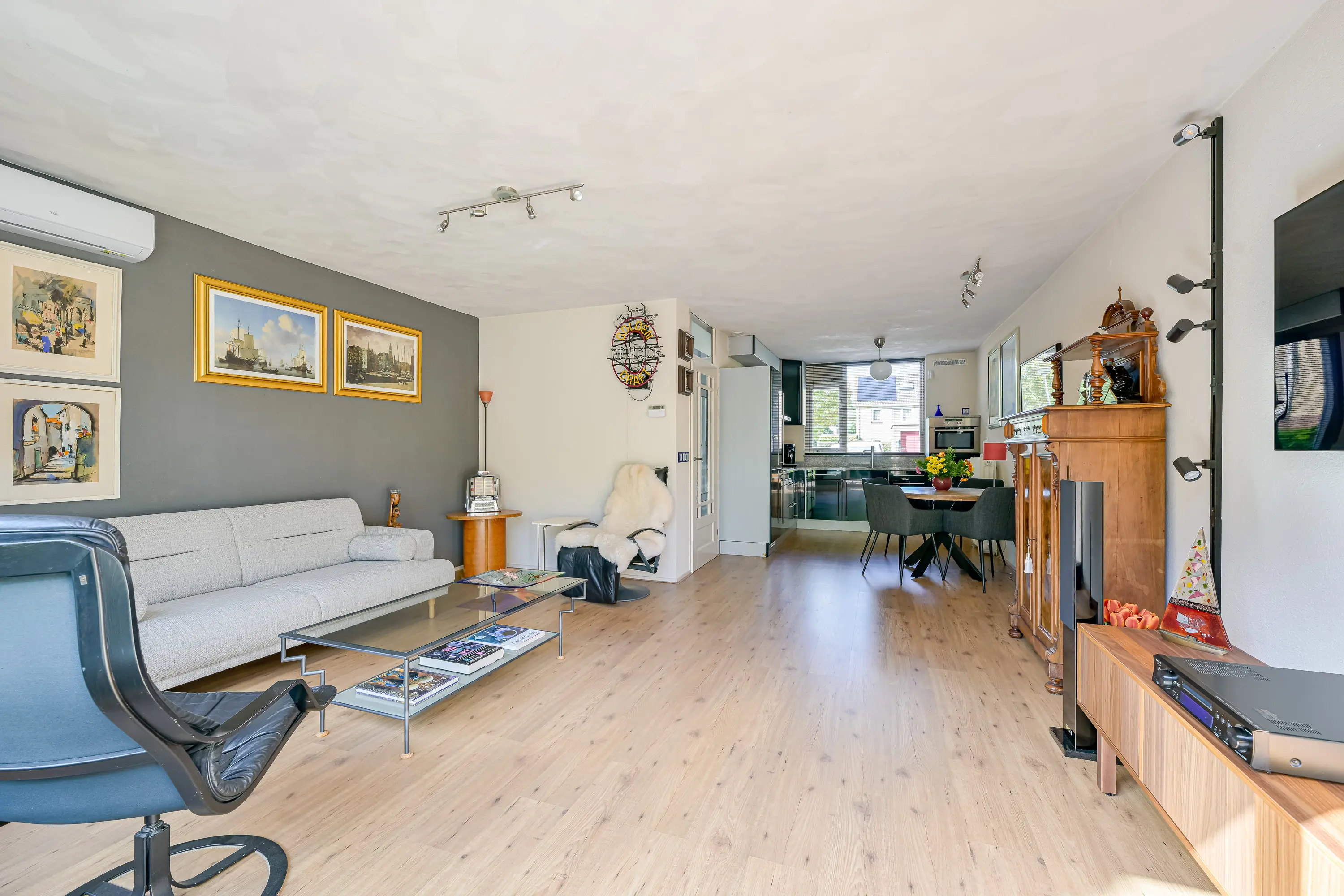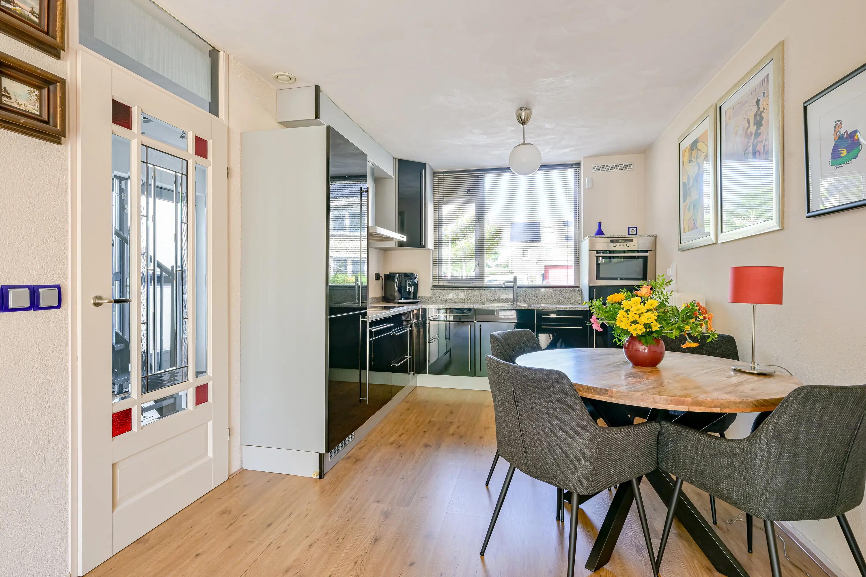 Begane grond: De entree/hal geeft toegang tot de trap naar boven, meterkast, toilet en de deur naar de woonkamer. De woonkamer is ruim, aan de achterzijde van de woning gelegen en voorzien van radiatoren en een airco welke kan koelen en verwarmen. Vanuit de woonkamer heeft u zicht op de goed onderhouden en groene achtertuin. Omdat de woning aan de achterzijde aan openbaar groen is gelegen heeft u geen directe achterburen wat zorgt voor een groen karakter en veel privacy. Via de schuifpui aan de achterzijde van de woning kunt u de tuin betreden. De open keuken is keurig en van alle gemakken voorzien. Denk hierbij aan een koel-vriescombinatie, extra koelkast, vaatwasser, en een combioven. Verder is er voldoende kastruimte om al uw keukengerei op te bergen. De gehele benedenverdieping is voorzien van een mooie laminaatvloer, strak plafond en afgewerkte wanden.