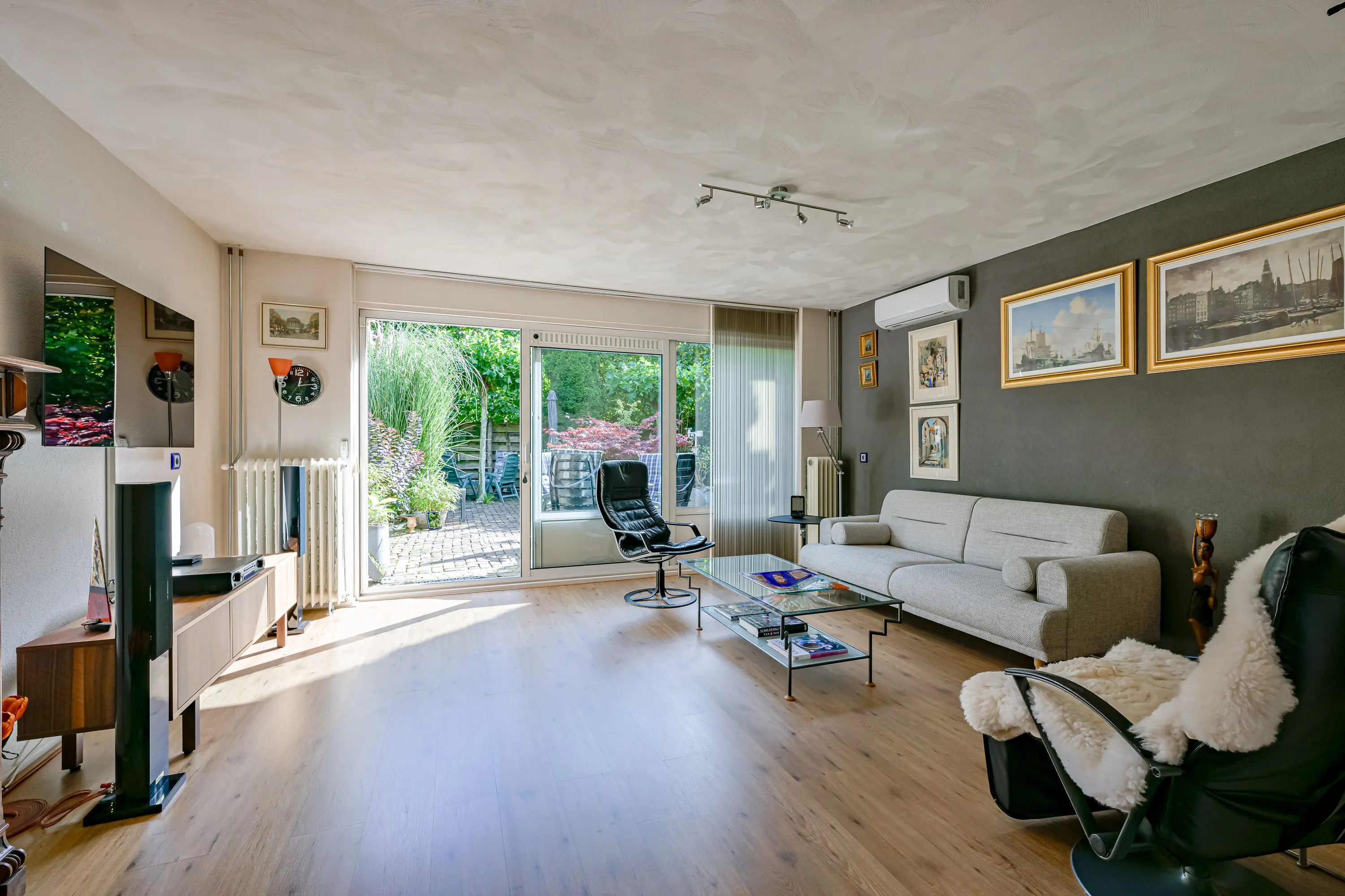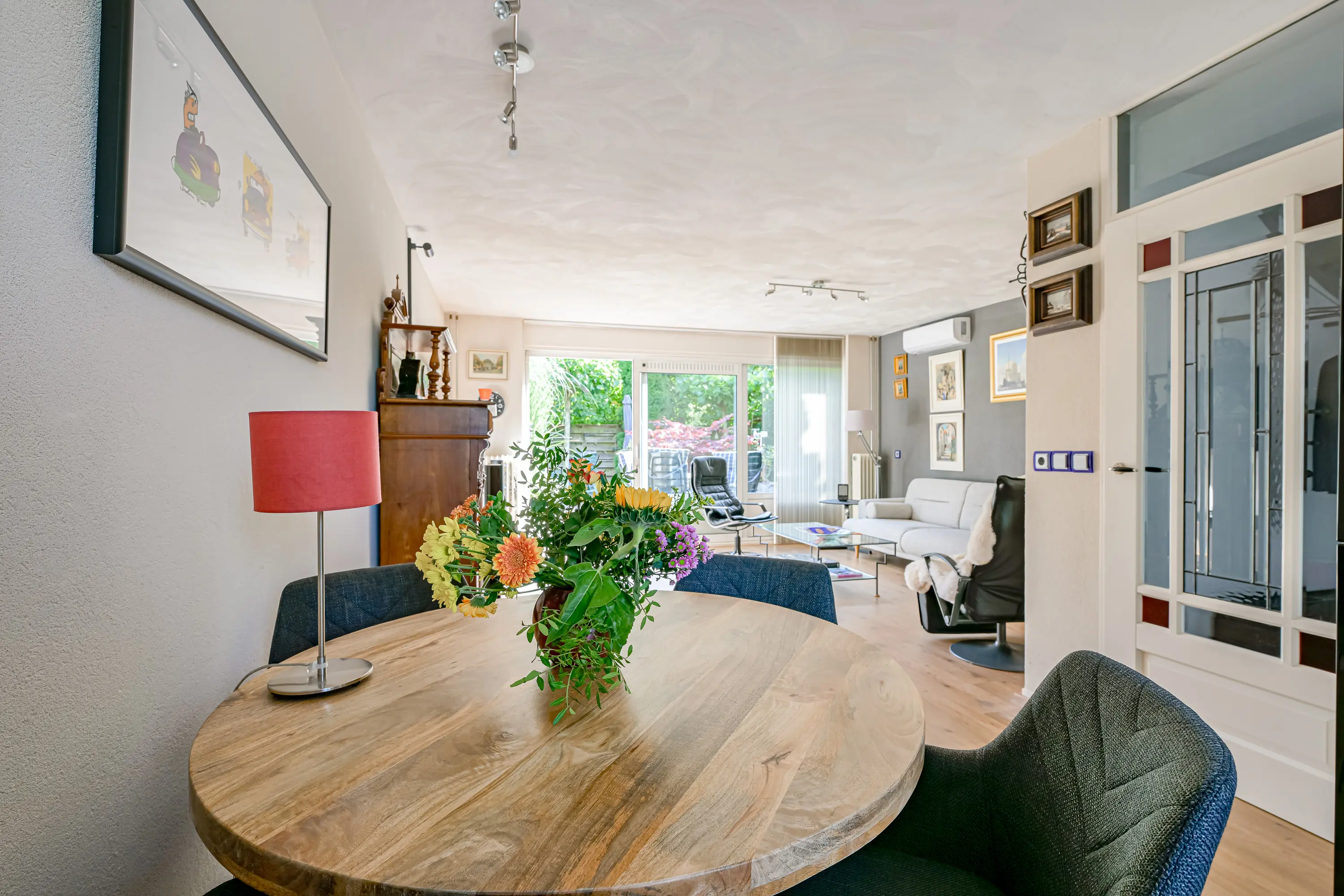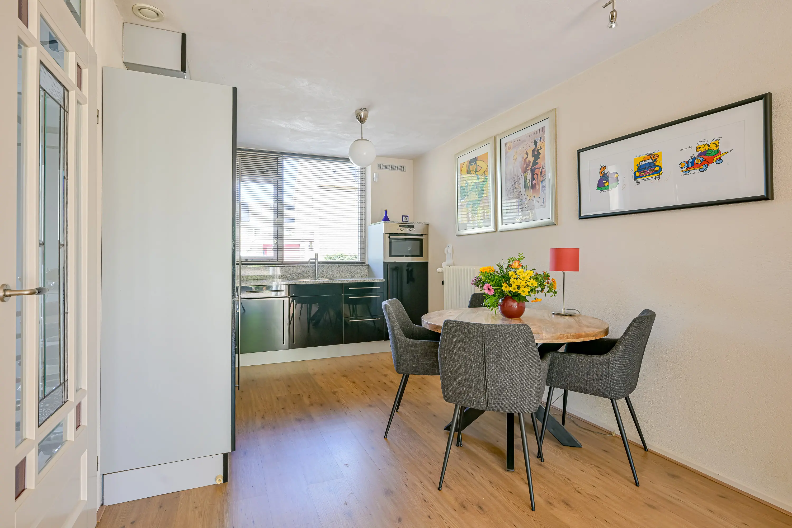 Begane grond: De entree/hal geeft toegang tot de trap naar boven, meterkast, toilet en de deur naar de woonkamer. De woonkamer is ruim, aan de achterzijde van de woning gelegen en voorzien van radiatoren en een airco welke kan koelen en verwarmen. Vanuit de woonkamer heeft u zicht op de goed onderhouden en groene achtertuin. Omdat de woning aan de achterzijde aan openbaar groen is gelegen heeft u geen directe achterburen wat zorgt voor een groen karakter en veel privacy. Via de schuifpui aan de achterzijde van de woning kunt u de tuin betreden. De open keuken is keurig en van alle gemakken voorzien. Denk hierbij aan een koel-vriescombinatie, extra koelkast, vaatwasser, en een combioven. Verder is er voldoende kastruimte om al uw keukengerei op te bergen. De gehele benedenverdieping is voorzien van een mooie laminaatvloer, strak plafond en afgewerkte wanden.