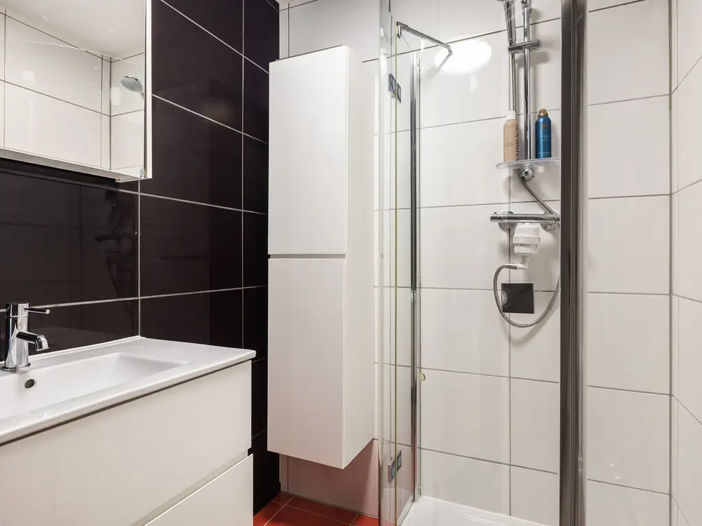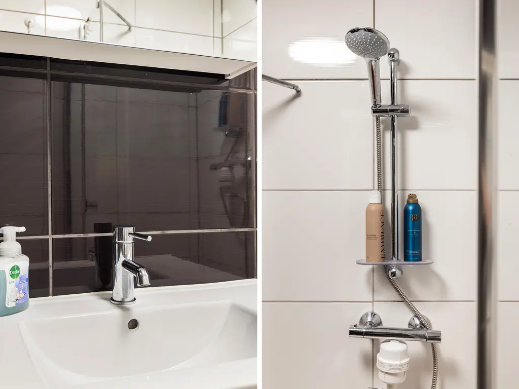 De badkamer is geheel betegeld en uitgerust met een douchecabine en een wastafelmeubel. Ook beschikt het appartement over een eigen grote berging in de onderbouw.