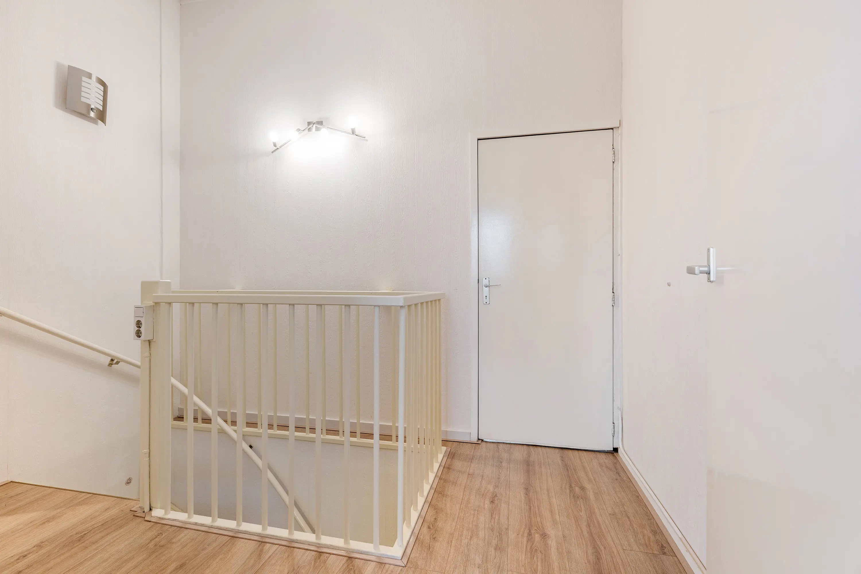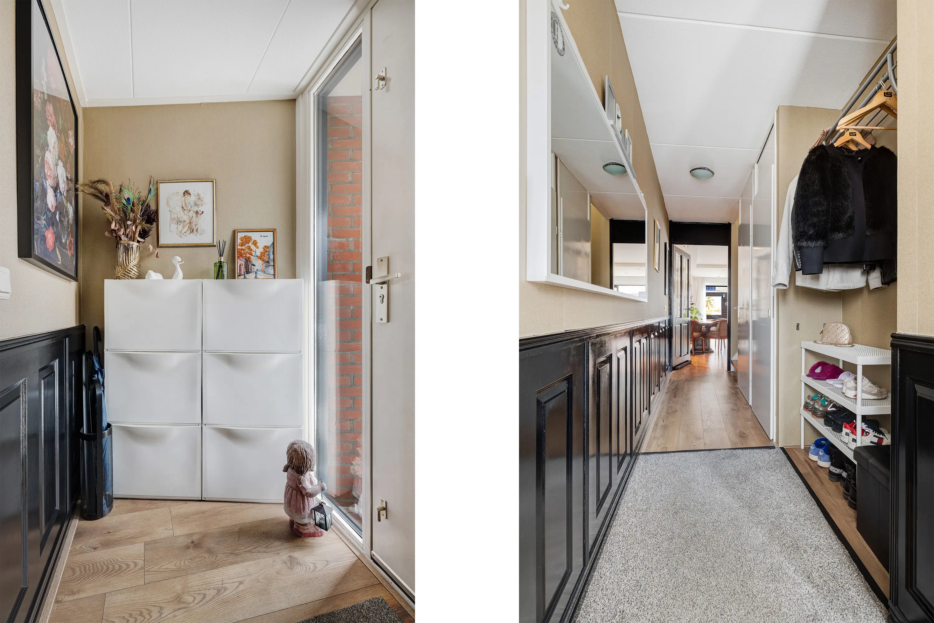 Een ruime, lichte entree verwelkomt u direct. De hal is voorzien van garderoberuimte, meterkast en een modern afgewerkte toiletruimte met stijlvolle lichte wandpanelen.