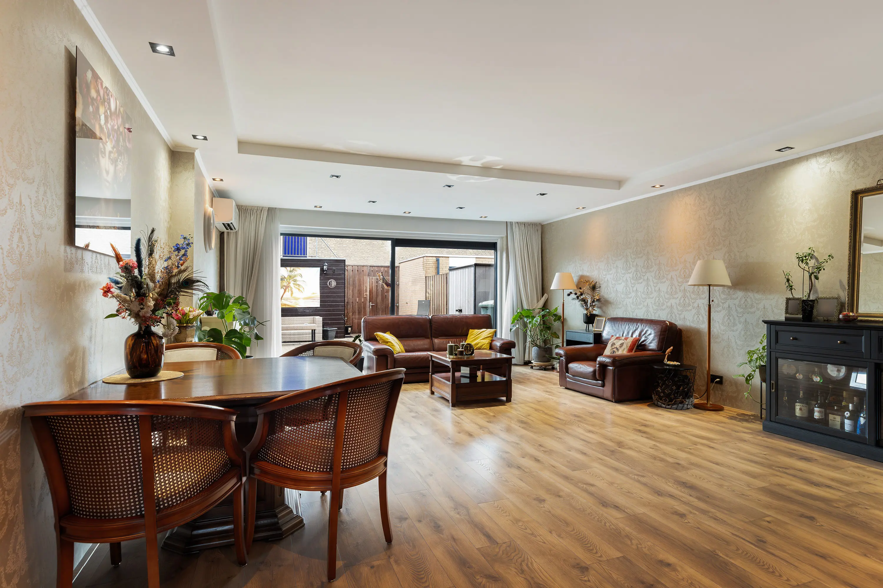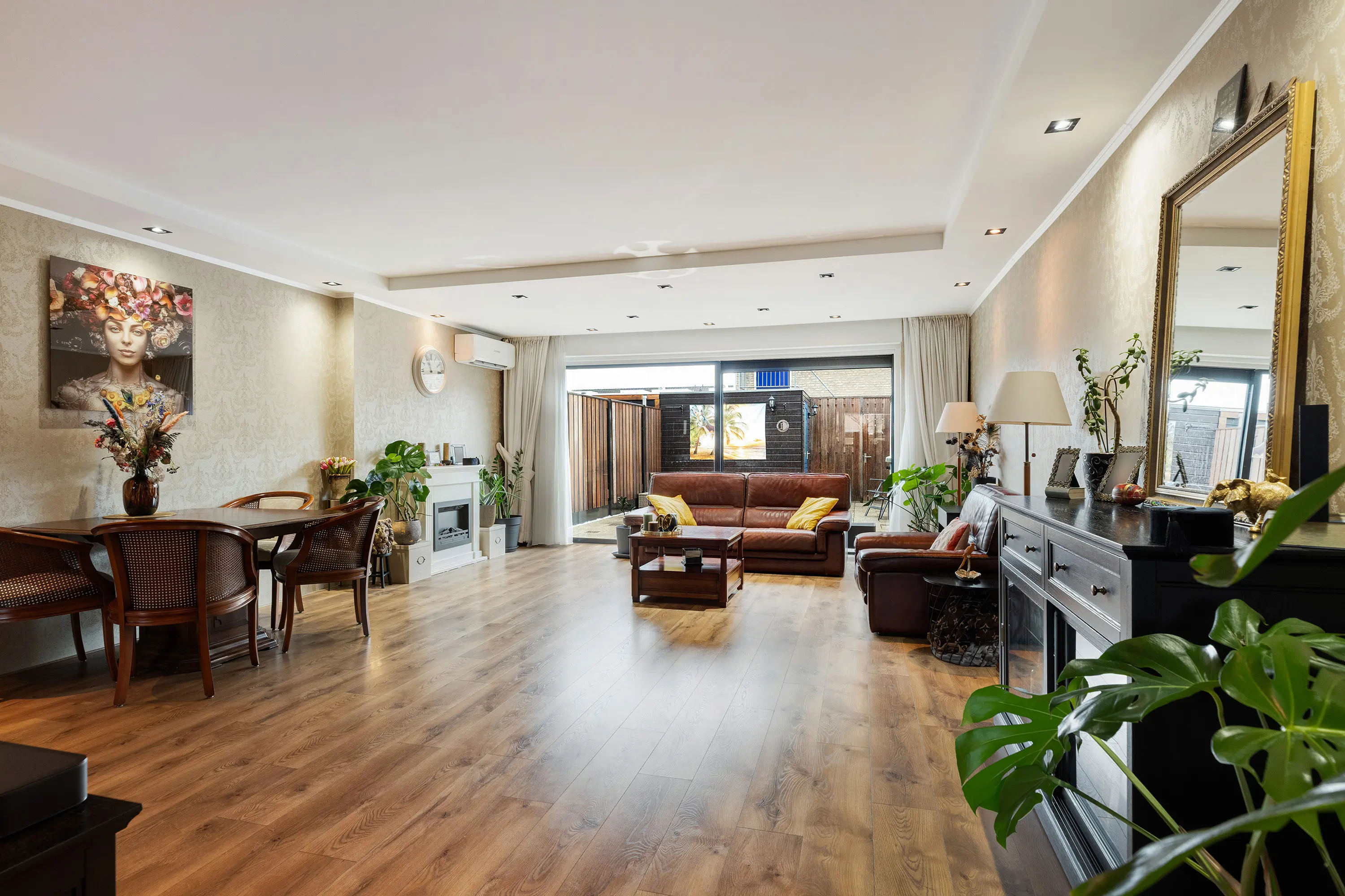 Via de zwarte glazen paneeldeur bereikt u de tuingerichte woonkamer – uitgebouwd, voorzien van grote schuifpui, waardoor daglicht rijkelijk naar binnen stroomt. De laminaatvloer met vloerverwarming, spotverlichting in het plafond, convectorradiator en een sfeervolle elektrische haard zorgen voor sfeer én comfort. Daarnaast is er airconditioning aanwezig voor zowel koeling als verwarming.