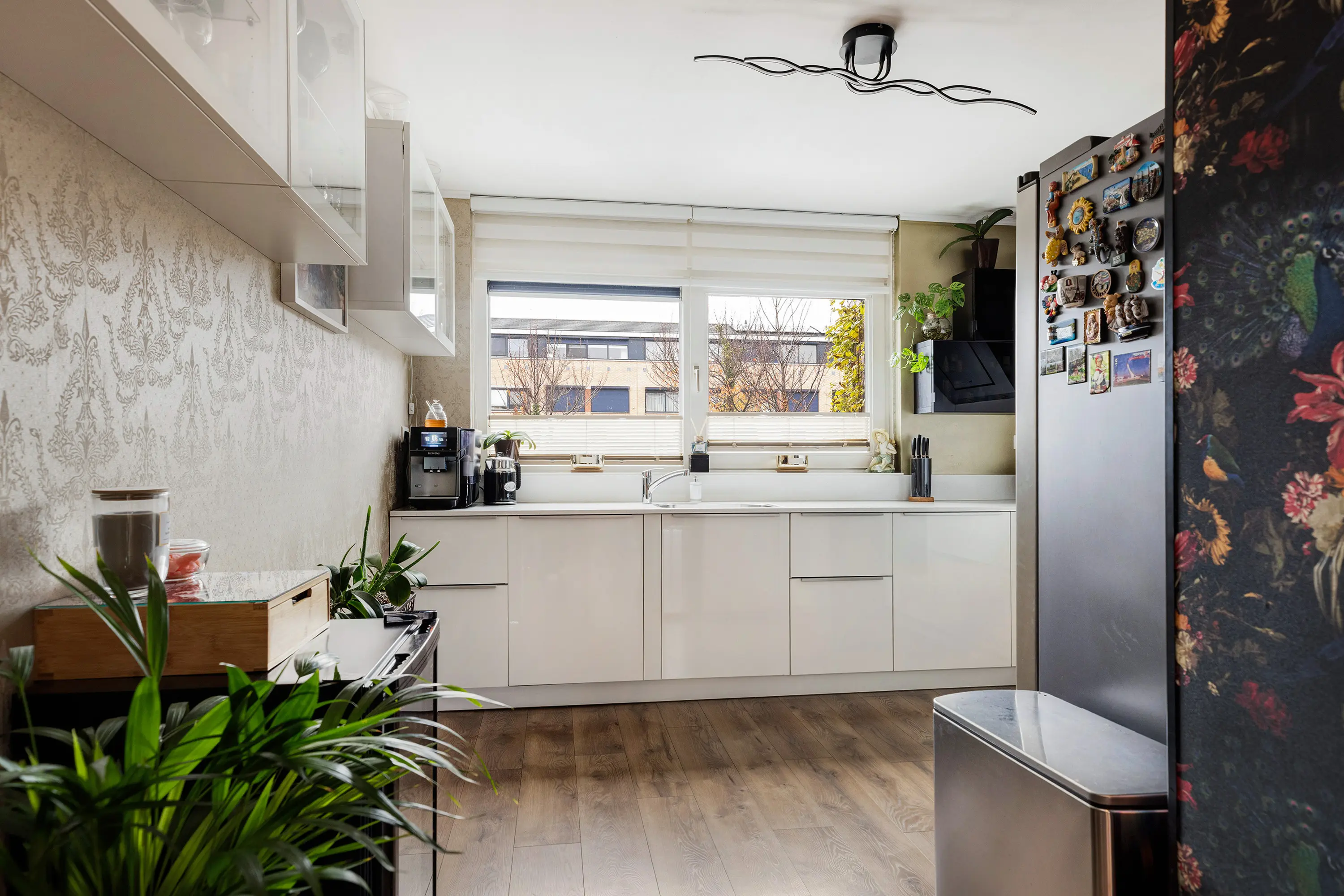 De moderne halfopen keuken aan de voorzijde is strak uitgevoerd in hoekopstelling met uitgebreide inbouwapparatuur zoals een 5-pits gaskookplaat met RVS afzuigkap, oven, magnetron, vaatwasser en een royale Amerikaanse koel-vriescombinatie. Deze laatste is zelfs verrijdbaar, waardoor de praktische trapkast altijd eenvoudig bereikbaar blijft.