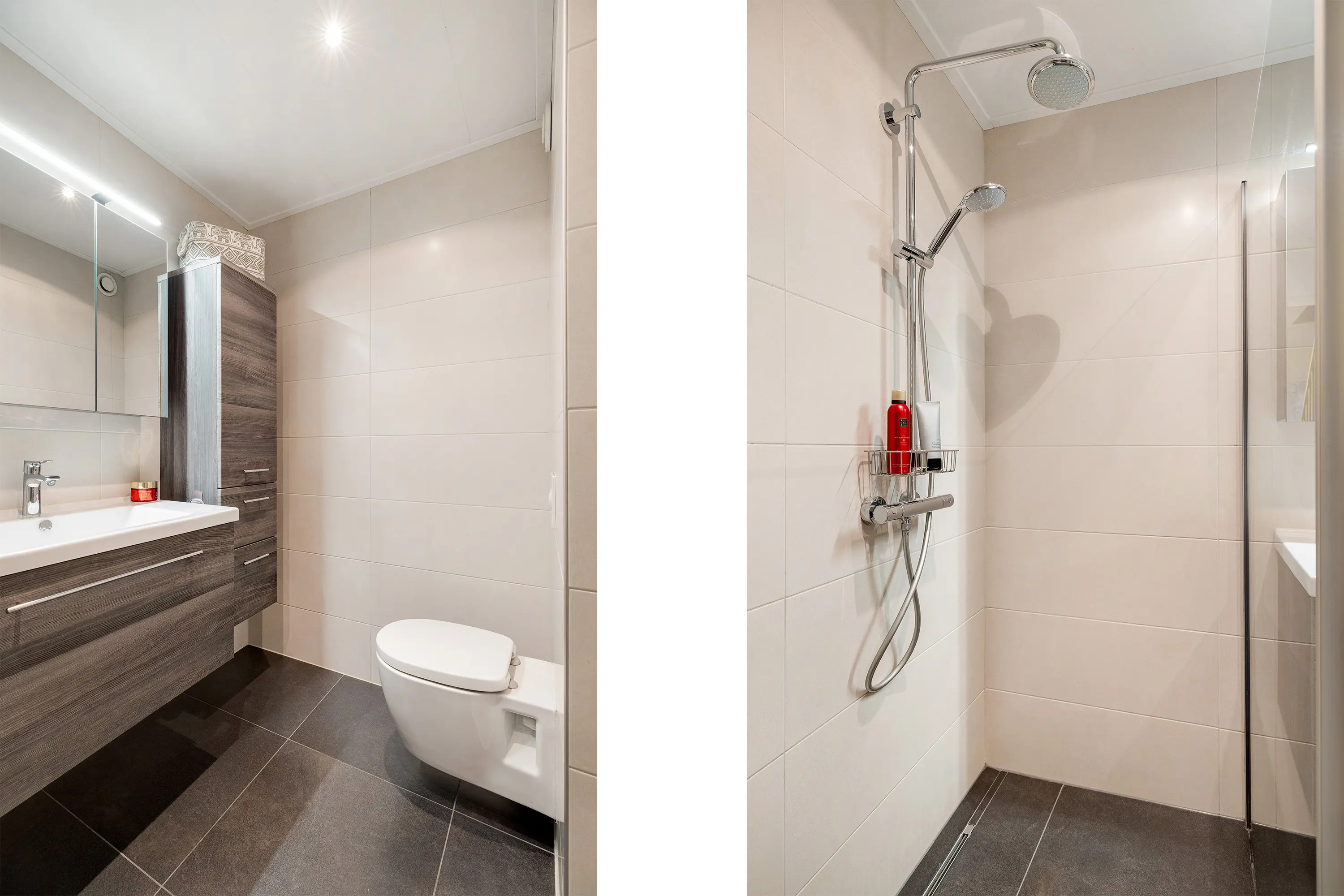 Op de overloop bevindt zich een afgesloten technische ruimte met opstelplaats voor de wasmachine en droger, de CV-installatie, een extra douchecabine met massagejets en een wastafelmeubel – ideaal voor een groot gezin.