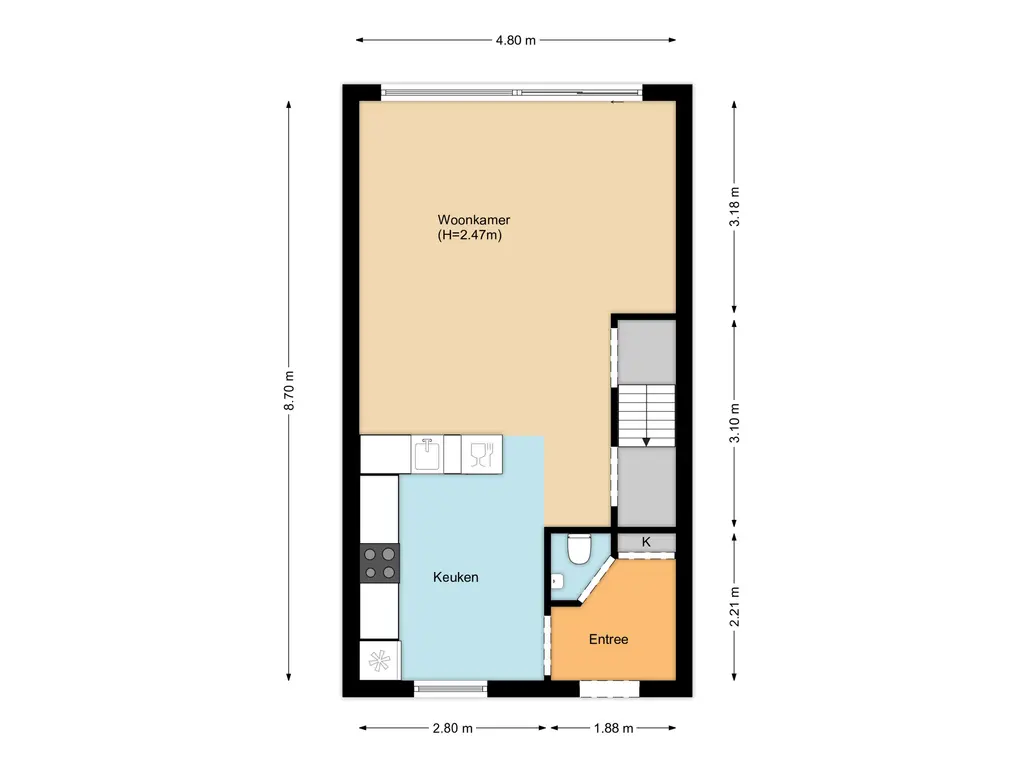 Aan de voorzijde van de woning bevindt zich de moderne keuken, uitgevoerd in een tijdloze stijl en voorzien van diverse inbouwapparatuur. Een praktische en comfortabele ruimte waar koken en wonen mooi samenkomen.