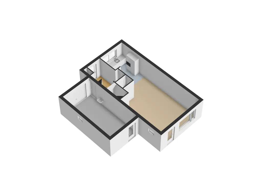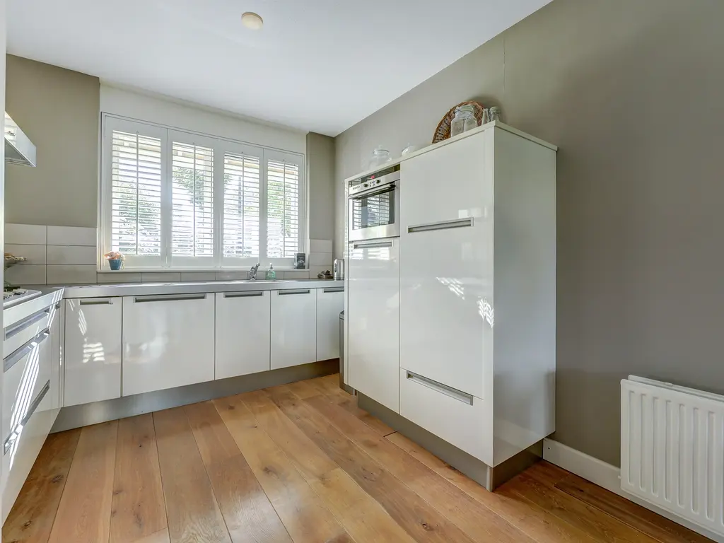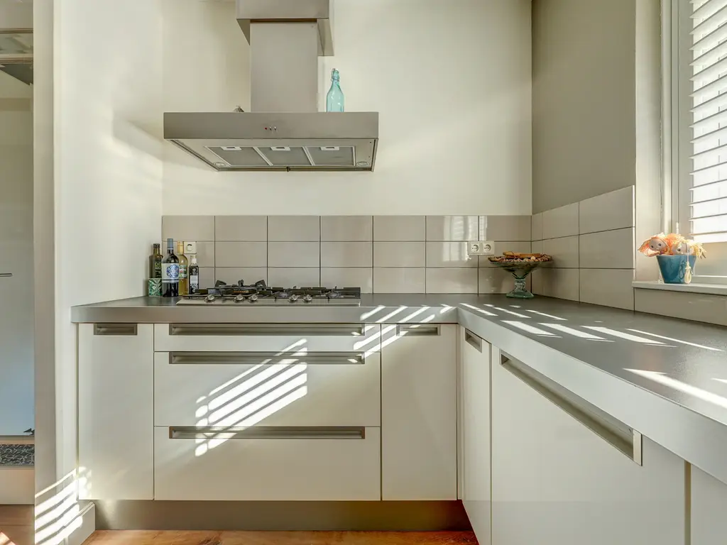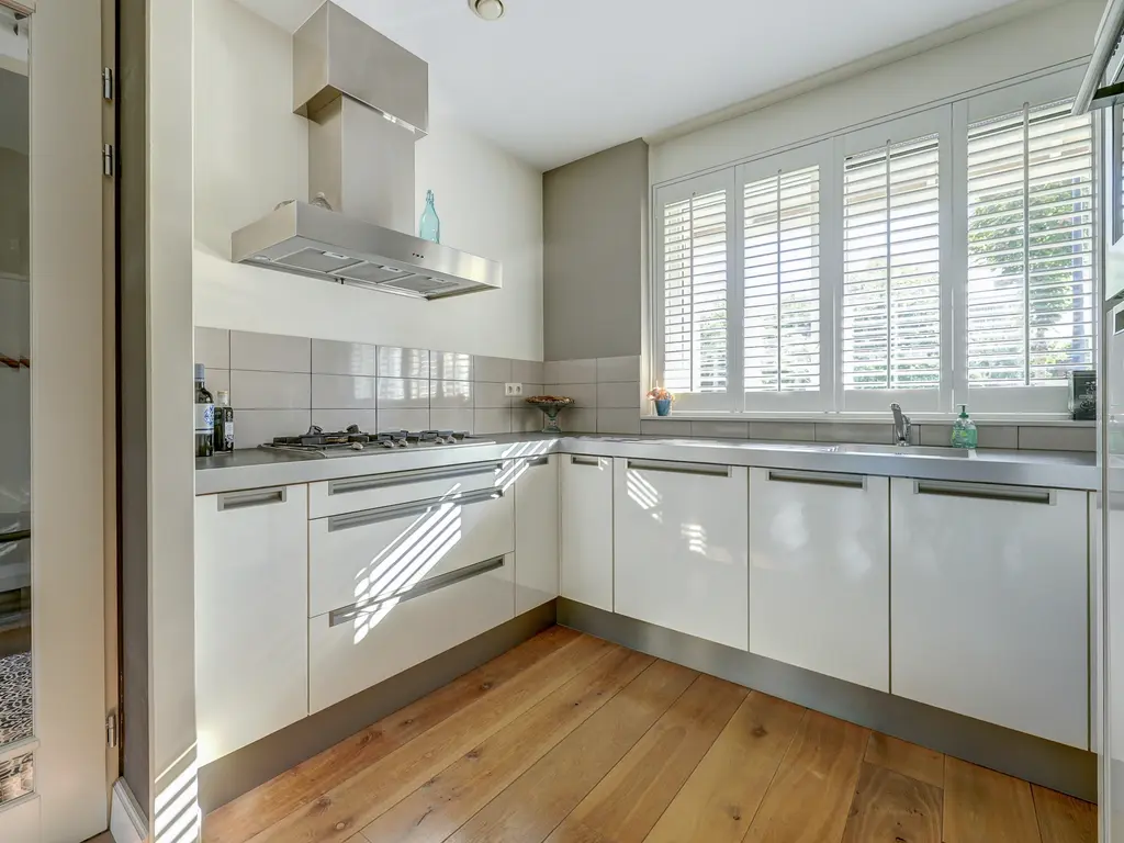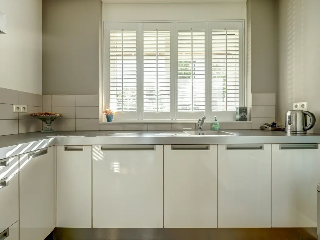 Aan de voorzijde bevindt zich de moderne open keuken (ca. 9 m²), uitgevoerd in een lichte kleurstelling met hoogglans fronten en een strak werkblad. De keuken is voorzien van een 5 pits gaskookplaat, RVS afzuigkap, combi oven, vaatwasser en koelkast. Dankzij de grote ramen met shutters is er veel natuurlijke lichtinval, wat zorgt voor een frisse, open uitstraling.