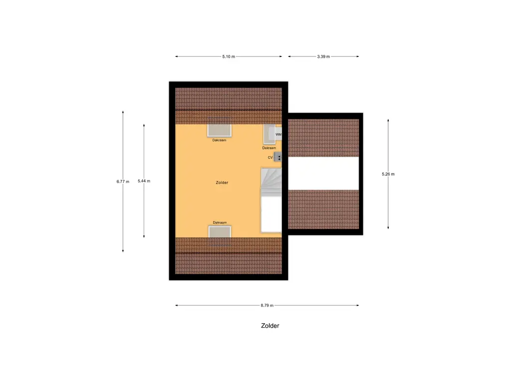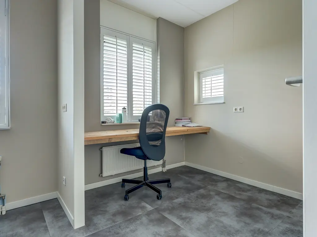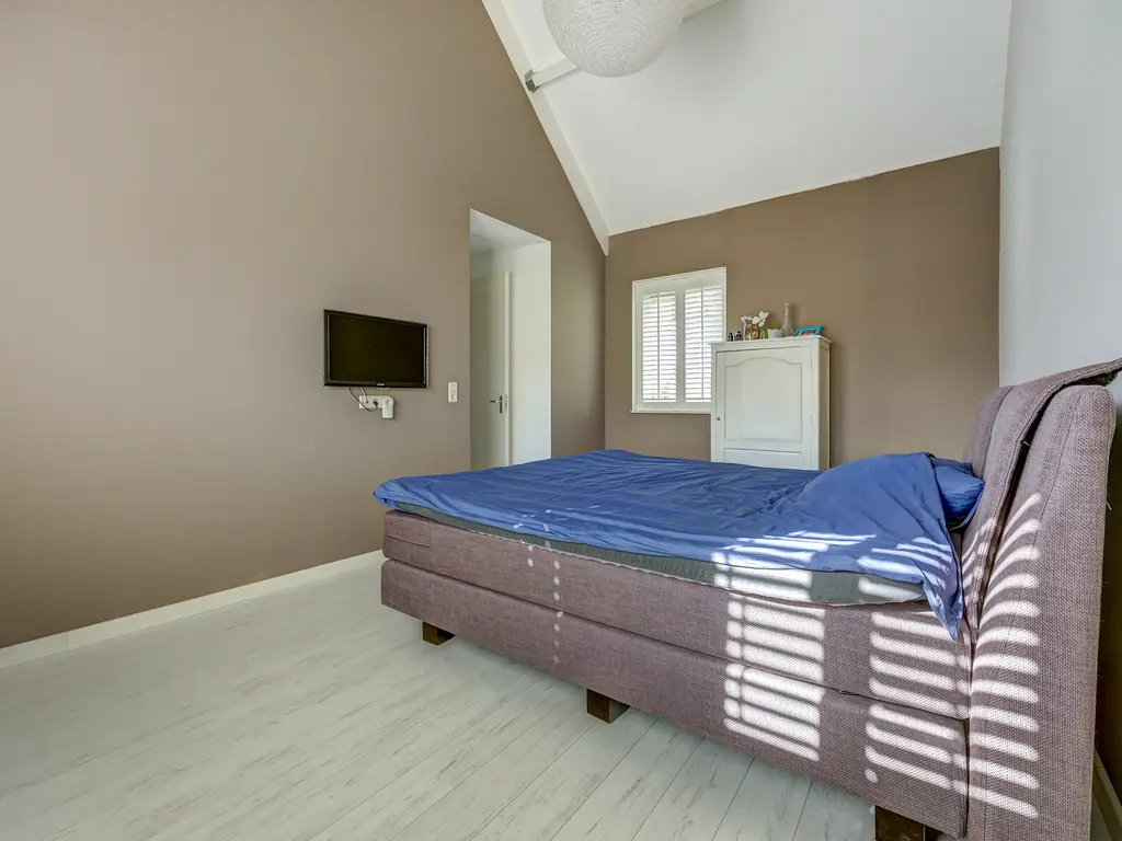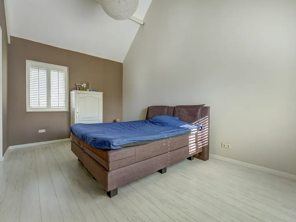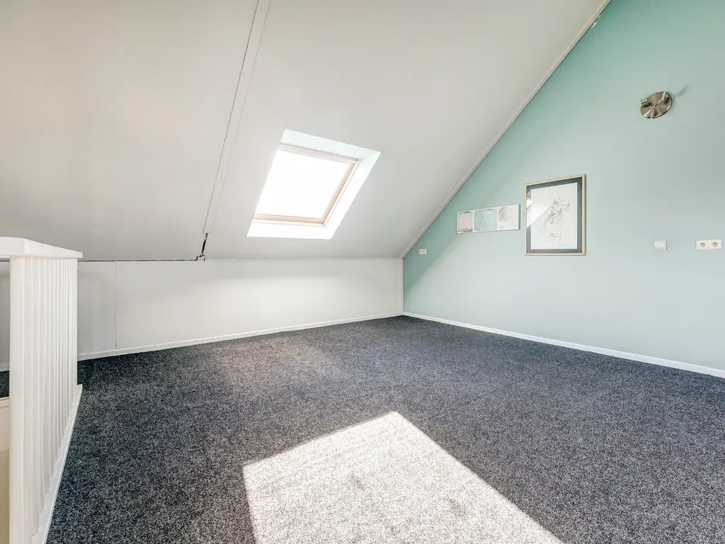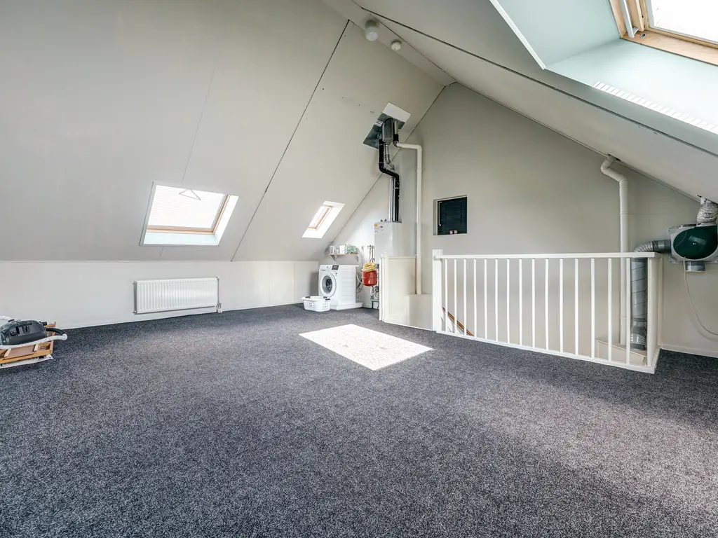 Via een vaste trap bereikt u de ruime zolderverdieping. Deze multifunctionele ruimte (ca. 27 m²) kan eenvoudig worden ingericht als vierde slaapkamer, werkkamer of hobbyruimte. De zolder heeft 3 Velux dakramen die zorgen voor veel licht en beschikt over een aparte opstelplaats voor de CV-installatie en de wasmachine en de droger. Er is veel extra bergruimte achter de knieschotten.