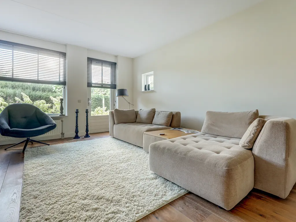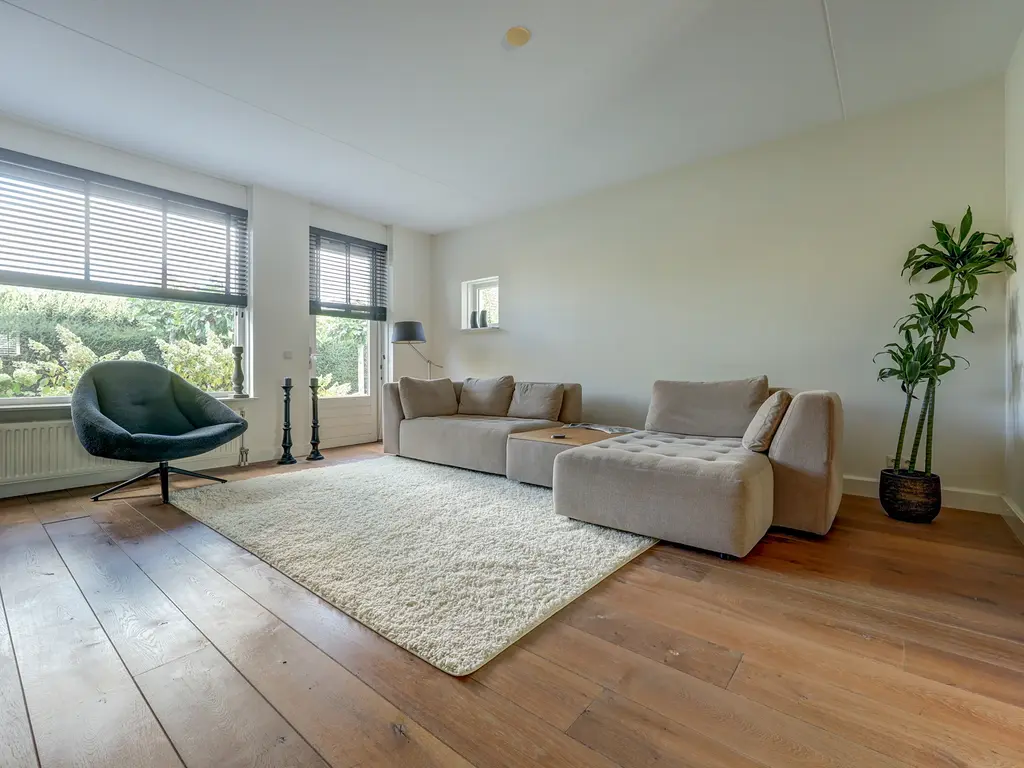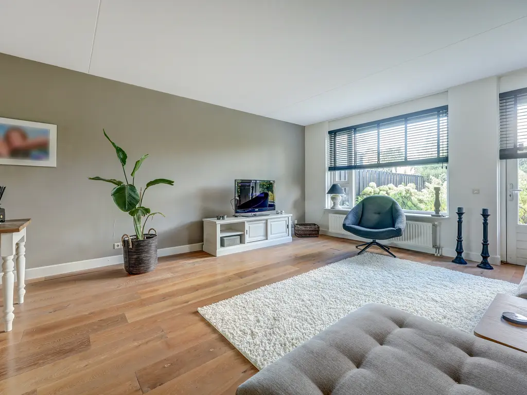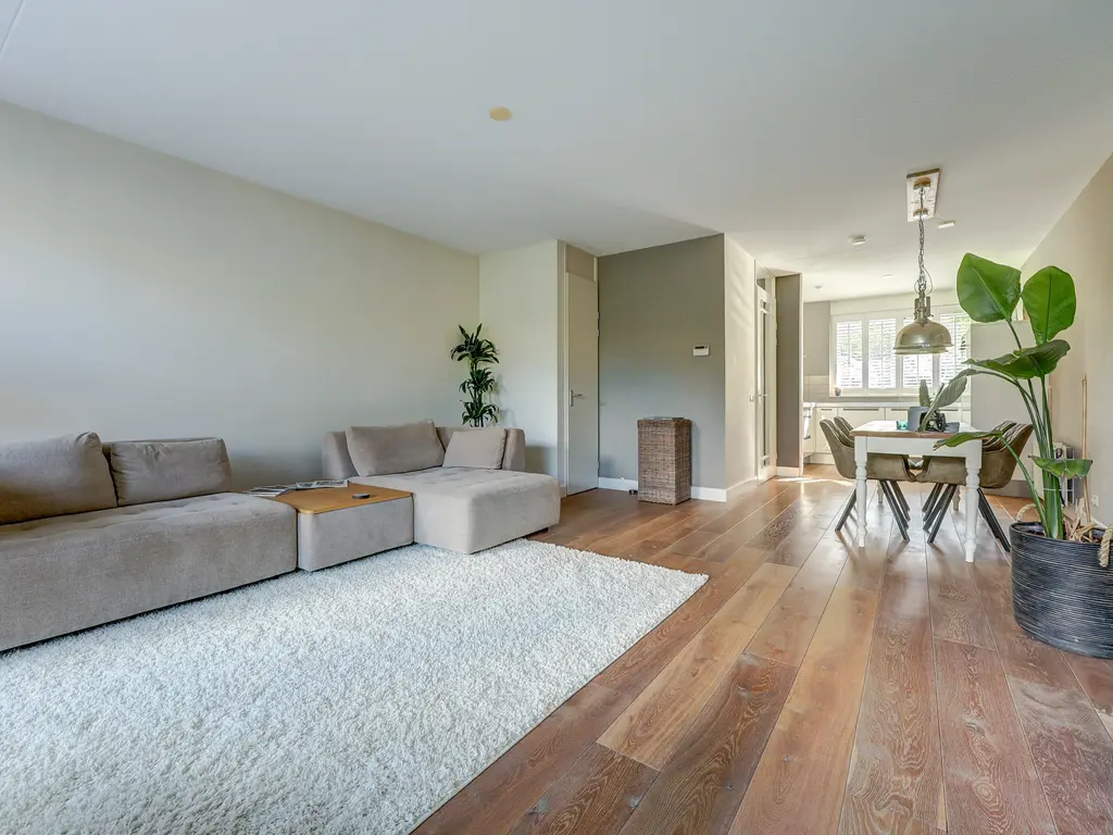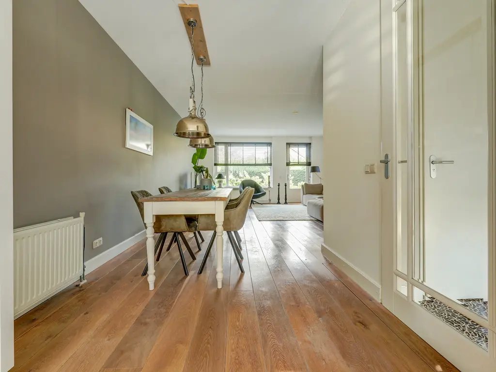 Via de verzorgde voortuin komt u binnen in de ruime hal met garderobe, toiletruimte en trapopgang. Vanuit de hal stapt u via de glazen paneeldeur de lichte woonkamer binnen: een sfeervolle leefruimte met een fraaie houten vloer, grote ramen en neutrale kleuren. De woonkamer (ca. 33 m²) biedt voldoende ruimte voor een comfortabele zithoek en een royale eettafel, ideaal voor gezellige avonden met familie of vrienden.