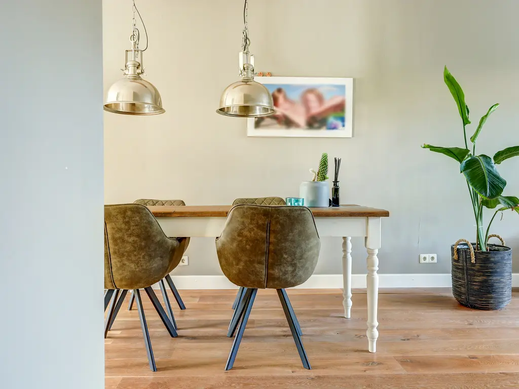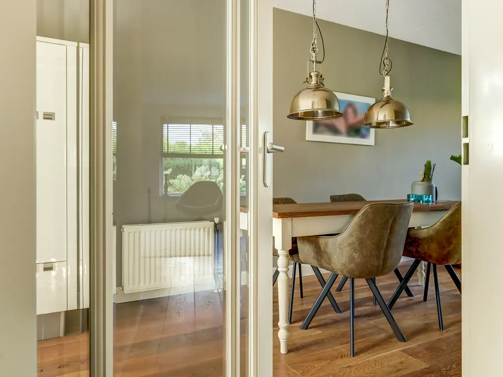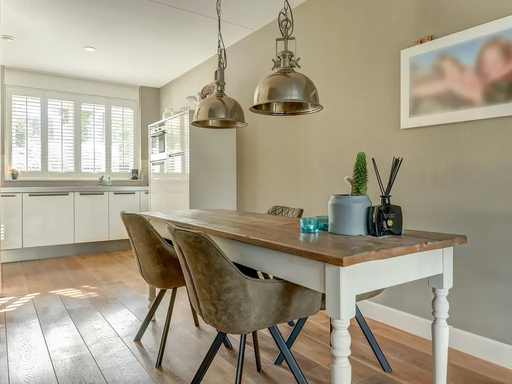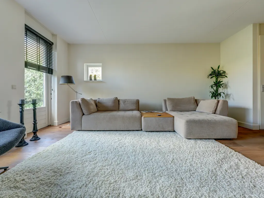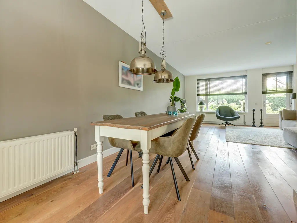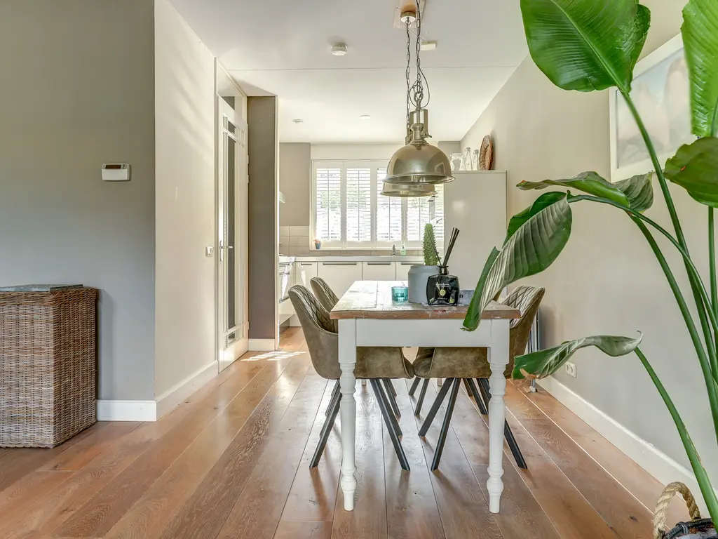 Via de verzorgde voortuin komt u binnen in de ruime hal met garderobe, toiletruimte en trapopgang. Vanuit de hal stapt u via de glazen paneeldeur de lichte woonkamer binnen: een sfeervolle leefruimte met een fraaie houten vloer, grote ramen en neutrale kleuren. De woonkamer (ca. 33 m²) biedt voldoende ruimte voor een comfortabele zithoek en een royale eettafel, ideaal voor gezellige avonden met familie of vrienden.