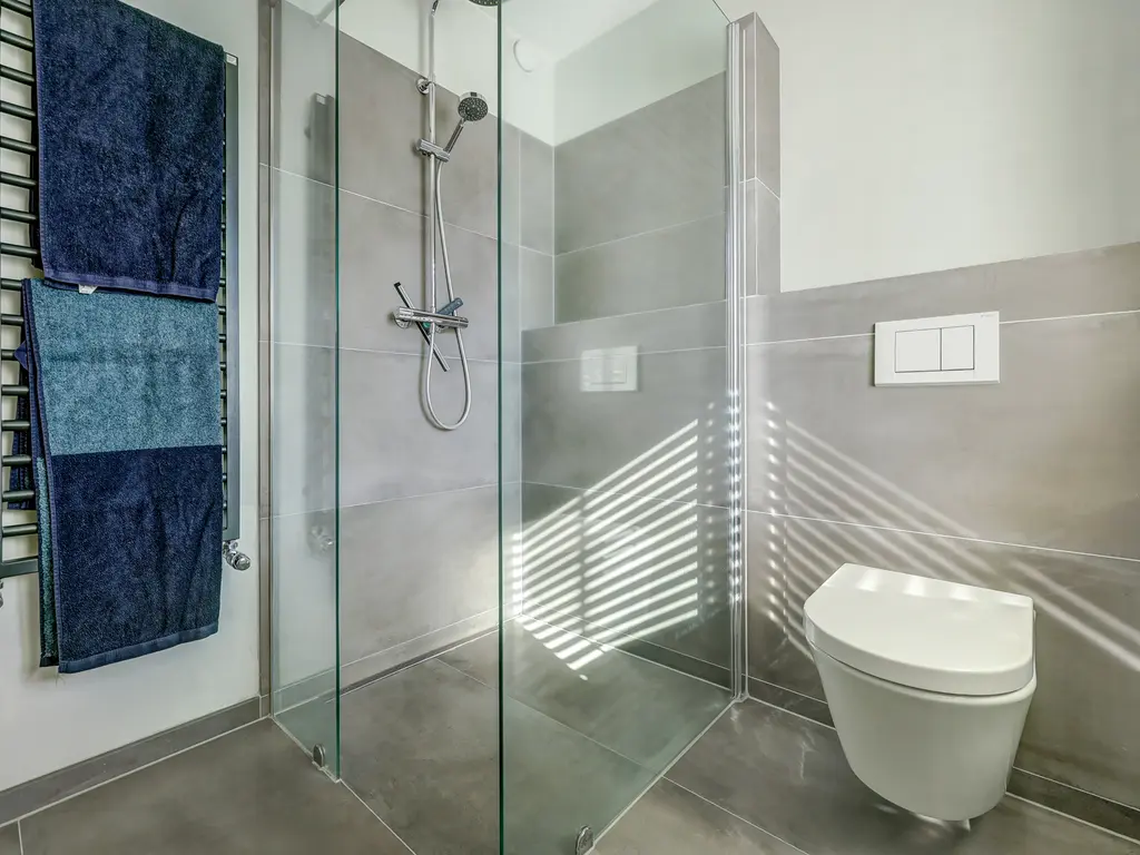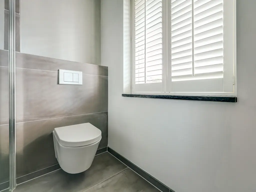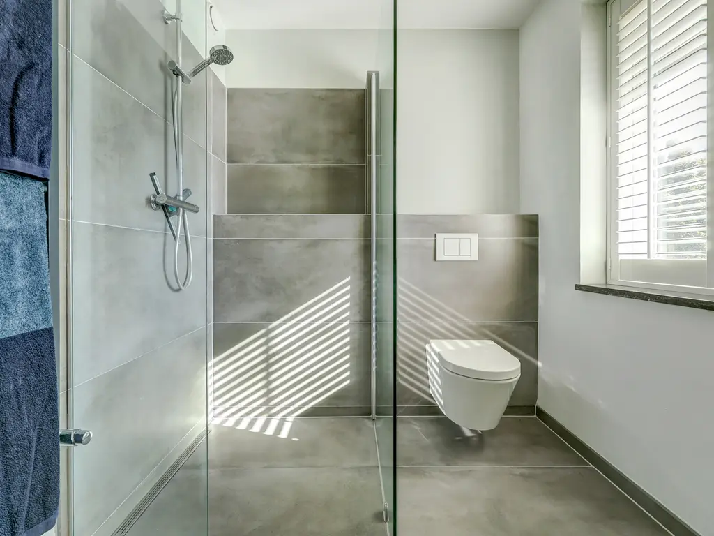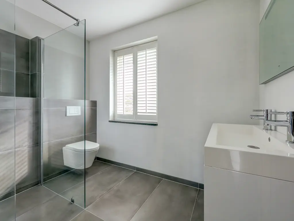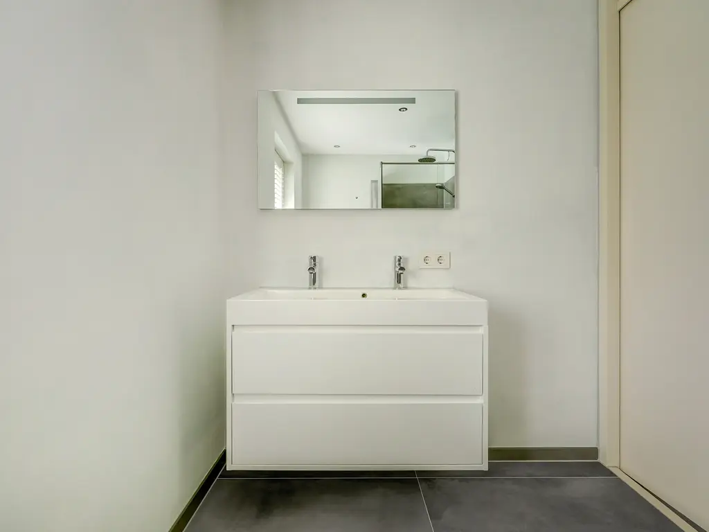De badkamer (ca. 6 m²) is strak en modern afgewerkt met grote grijze tegels en glad stucwerk, een inloopdouche, een hangend toilet en een dubbel wastafelmeubel met verlichte en verwarmde spiegel.