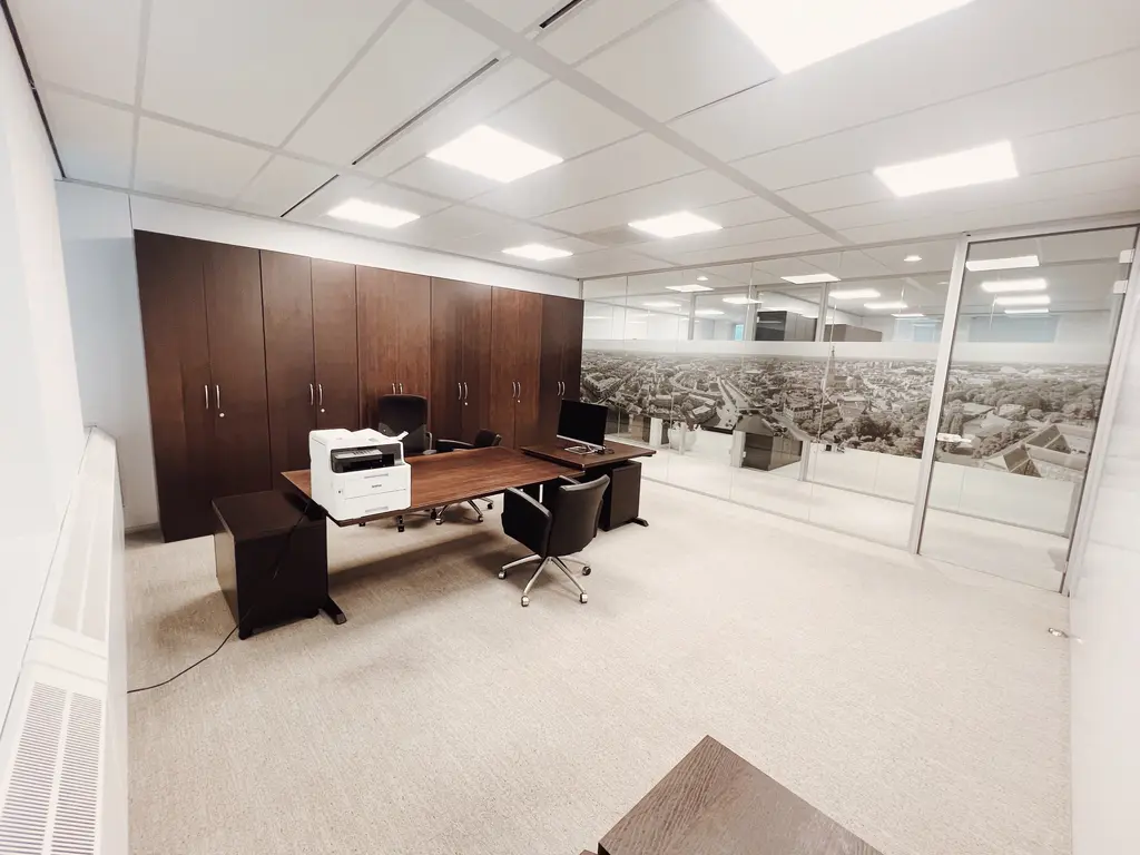 De kantoorruimtes zijn opgedeeld in twee tegenover elkaar liggende ruimtes: