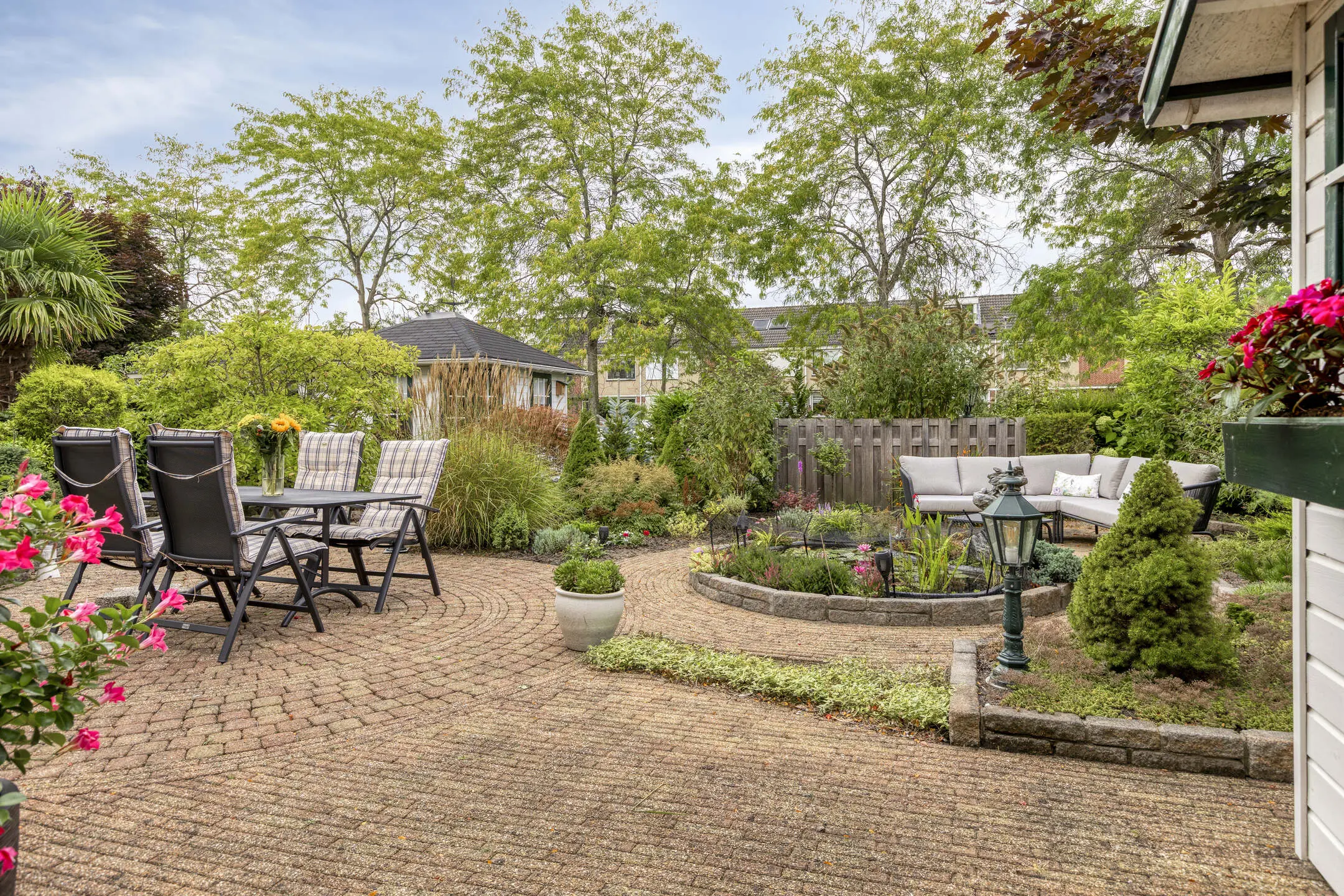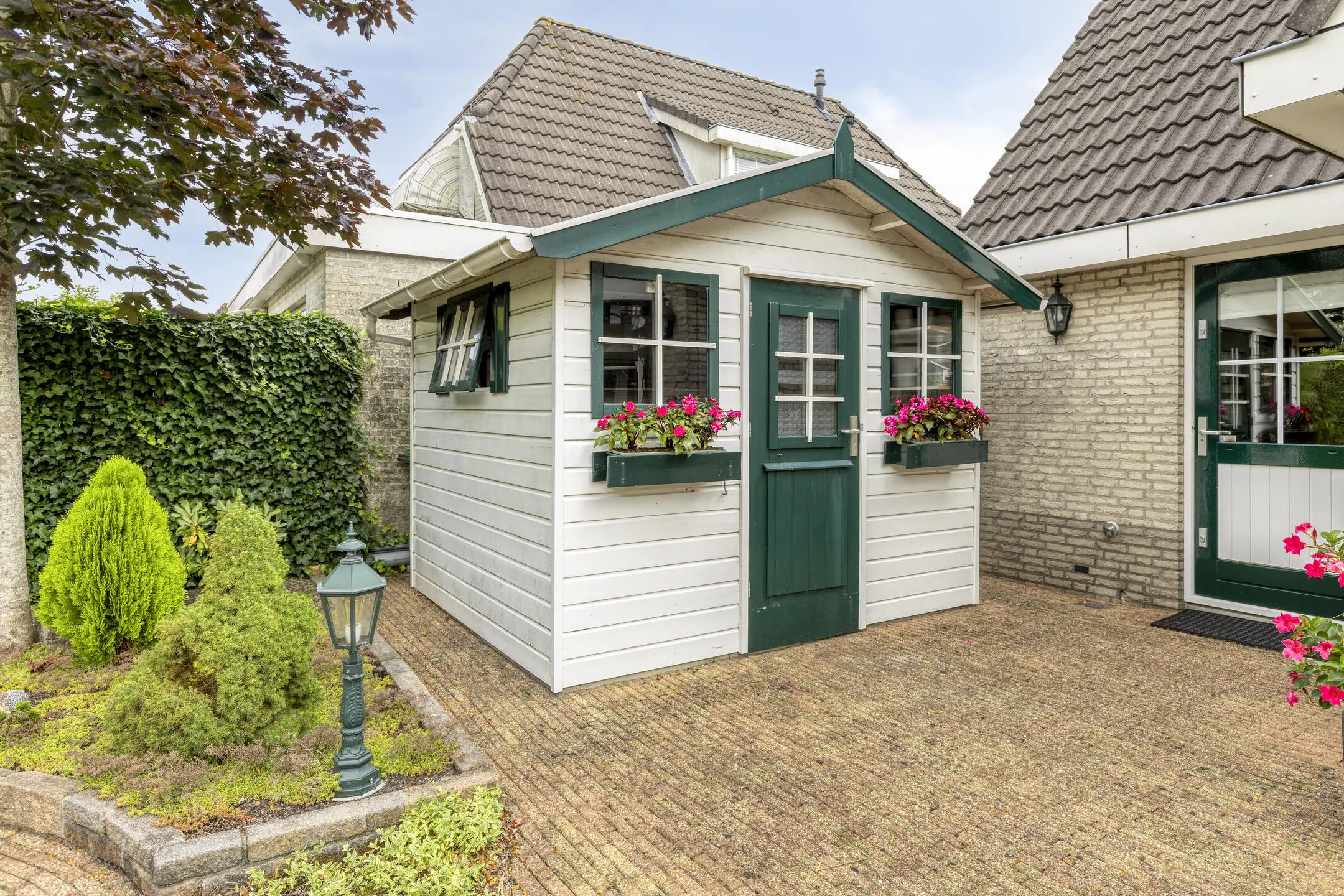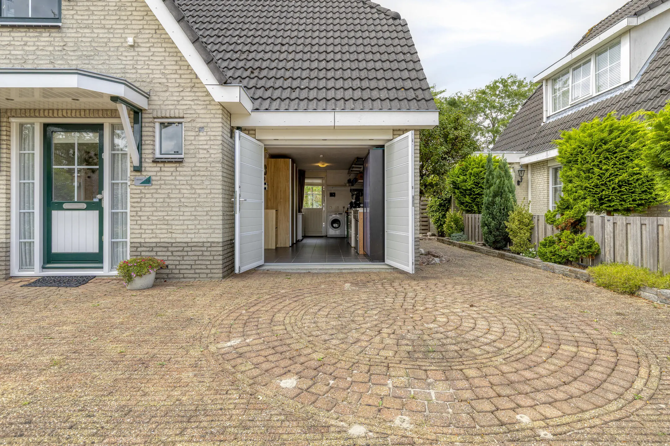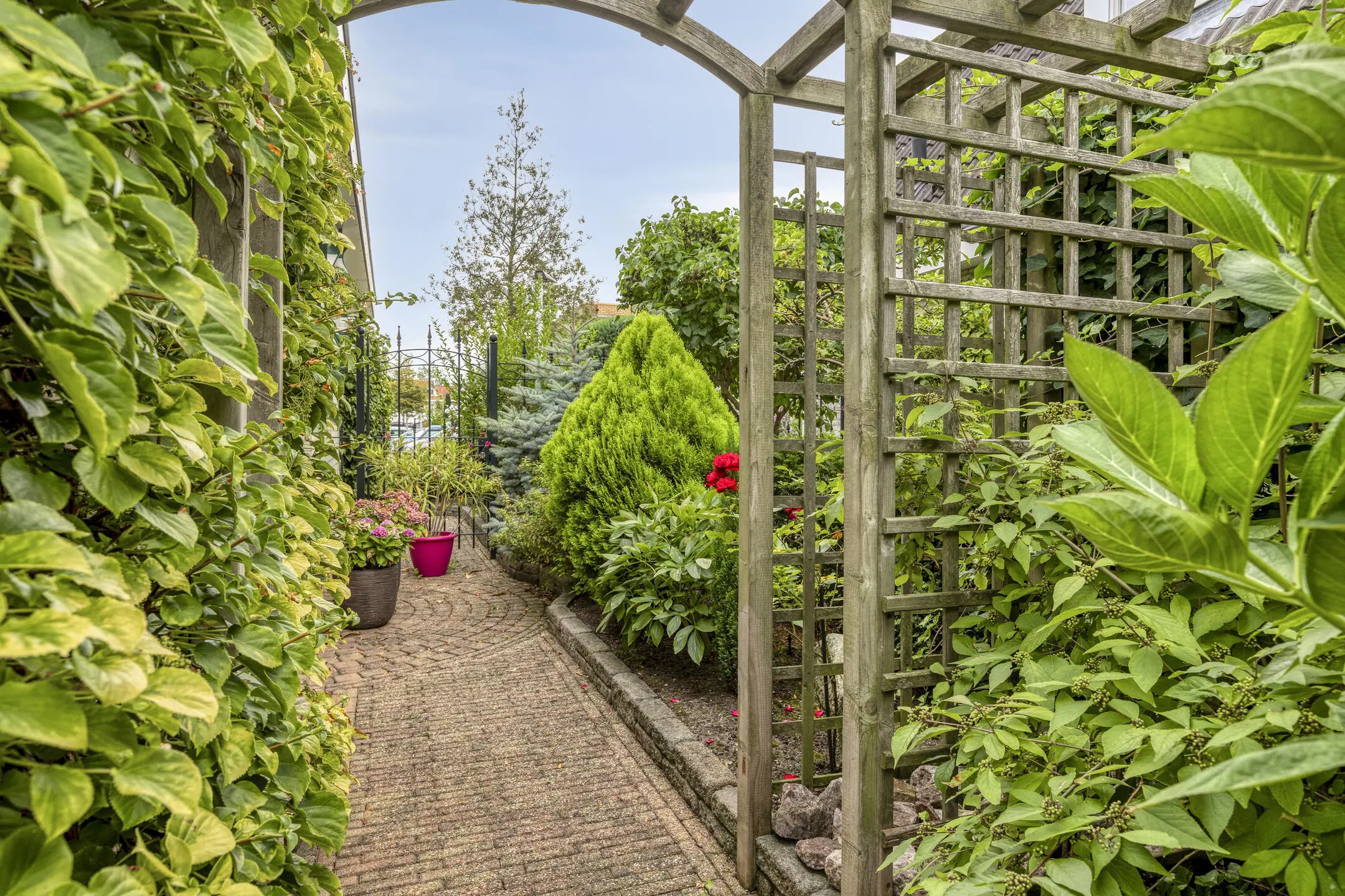 De voortuin is voorzien van sierbeplanting, sierbestrating en verlichting. De achtertuin is zowel via links als rechts van de woning bereikbaar, wat extra gebruiksgemak biedt. Tevens is er de mogelijkheid om twee auto's op eigen oprit te parkeren. De voorgevel is afgewerkt met gezellige luiken aan het keukenraam en markiezen.