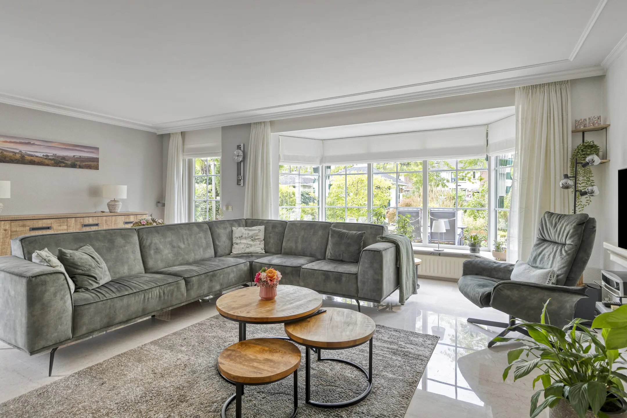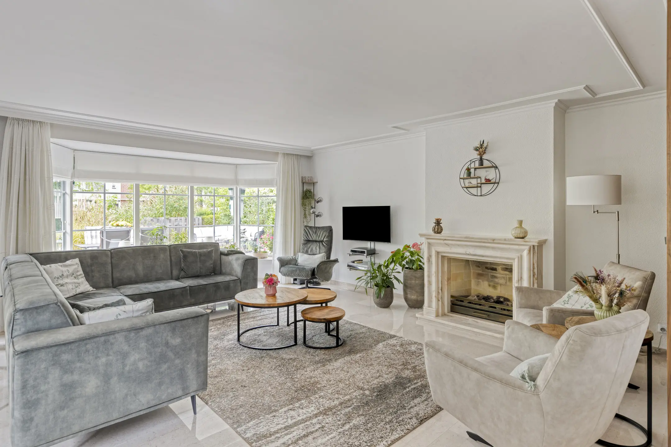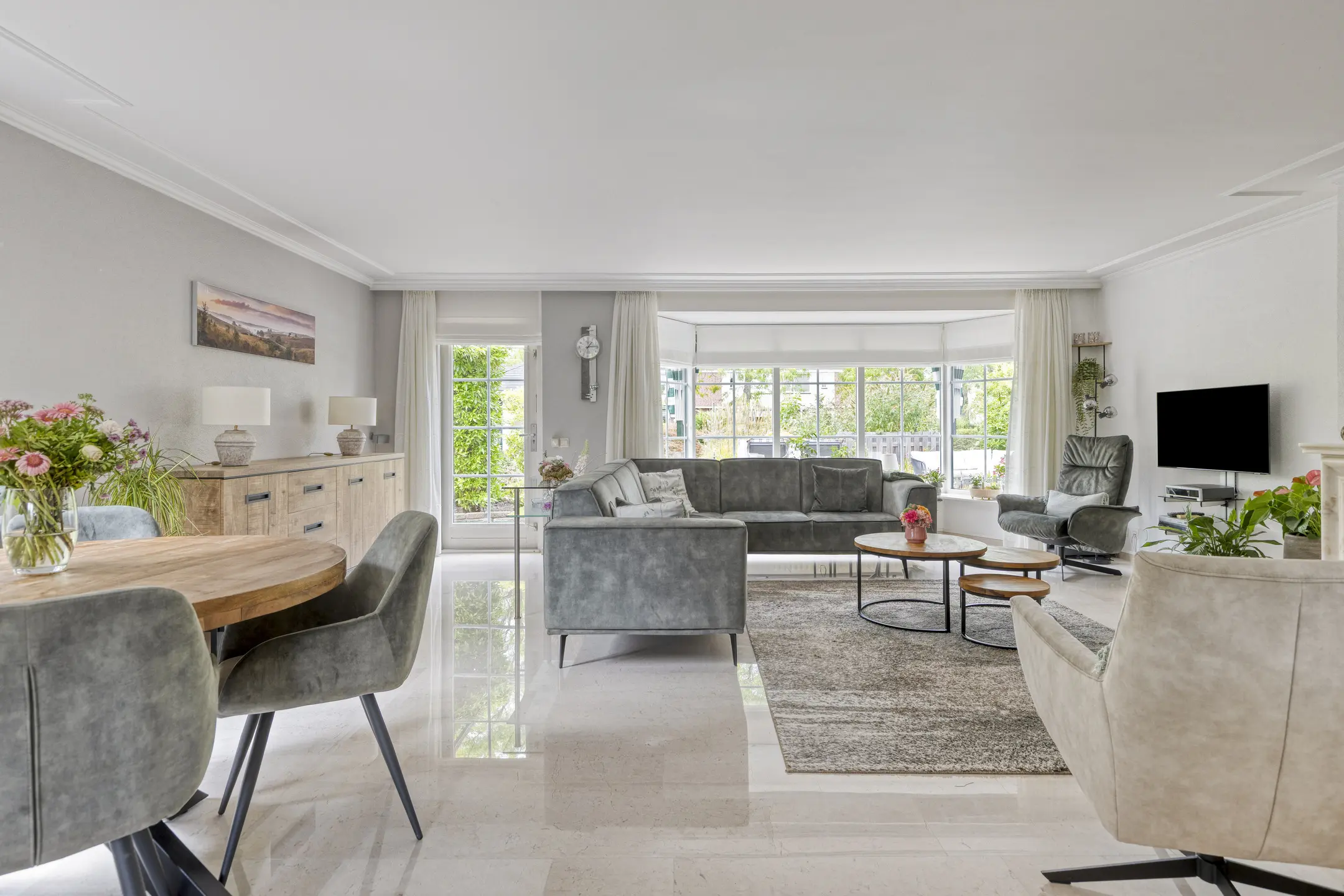 Sfeervolle lichte tuingerichte woonkamer (ca. 44 m2) voorzien van een lichte natuurstenen vloer met vloerverwarming. Deze royale woonkamer is verder voorzien van een sfeervolle gashaard met natuurstenen schouw, sierlijsten aan het plafond en een fraaie erker aan de achterzijde, compleet met markiezen. Door de grote raampartij biedt het woongedeelte een aangename natuurlijke lichtinval. Middels een loopdeur heeft u toegang tot de zonnige achtertuin. Via openslaande deuren bereikt u de compleet ingerichte keuken.