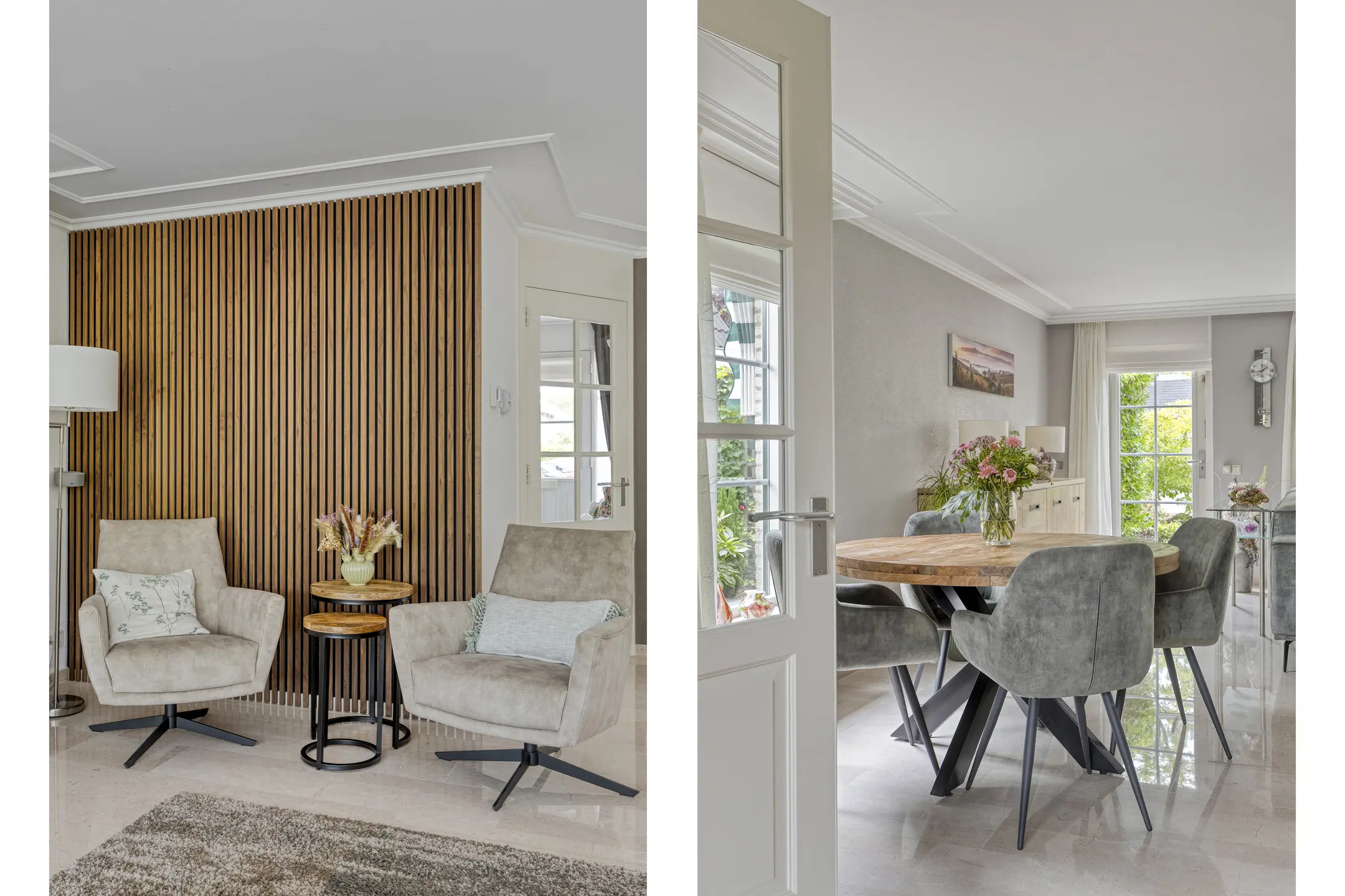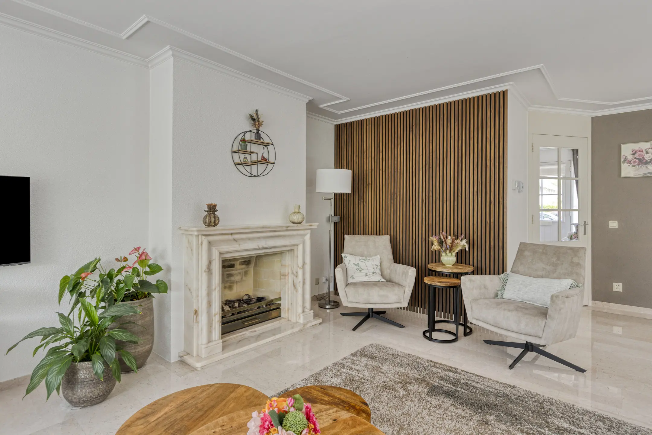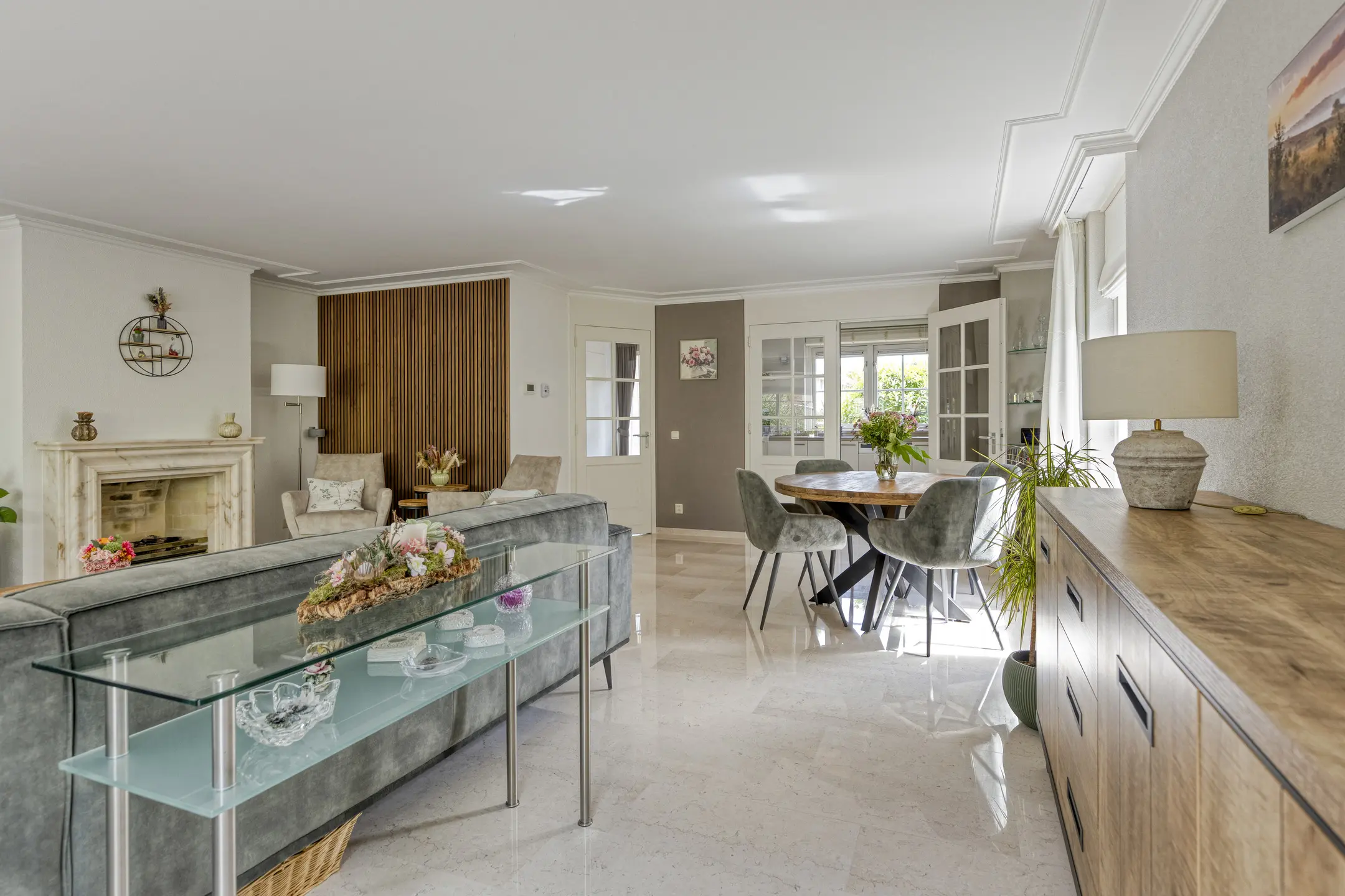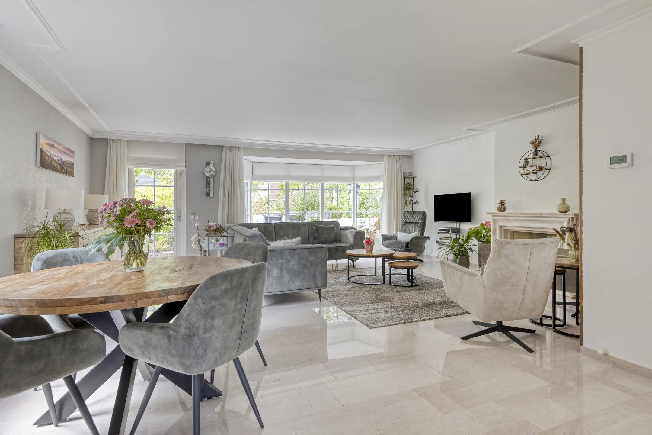 Sfeervolle lichte tuingerichte woonkamer (ca. 44 m2) voorzien van een lichte natuurstenen vloer met vloerverwarming. Deze royale woonkamer is verder voorzien van een sfeervolle gashaard met natuurstenen schouw, sierlijsten aan het plafond en een fraaie erker aan de achterzijde, compleet met markiezen. Door de grote raampartij biedt het woongedeelte een aangename natuurlijke lichtinval. Middels een loopdeur heeft u toegang tot de zonnige achtertuin. Via openslaande deuren bereikt u de compleet ingerichte keuken.