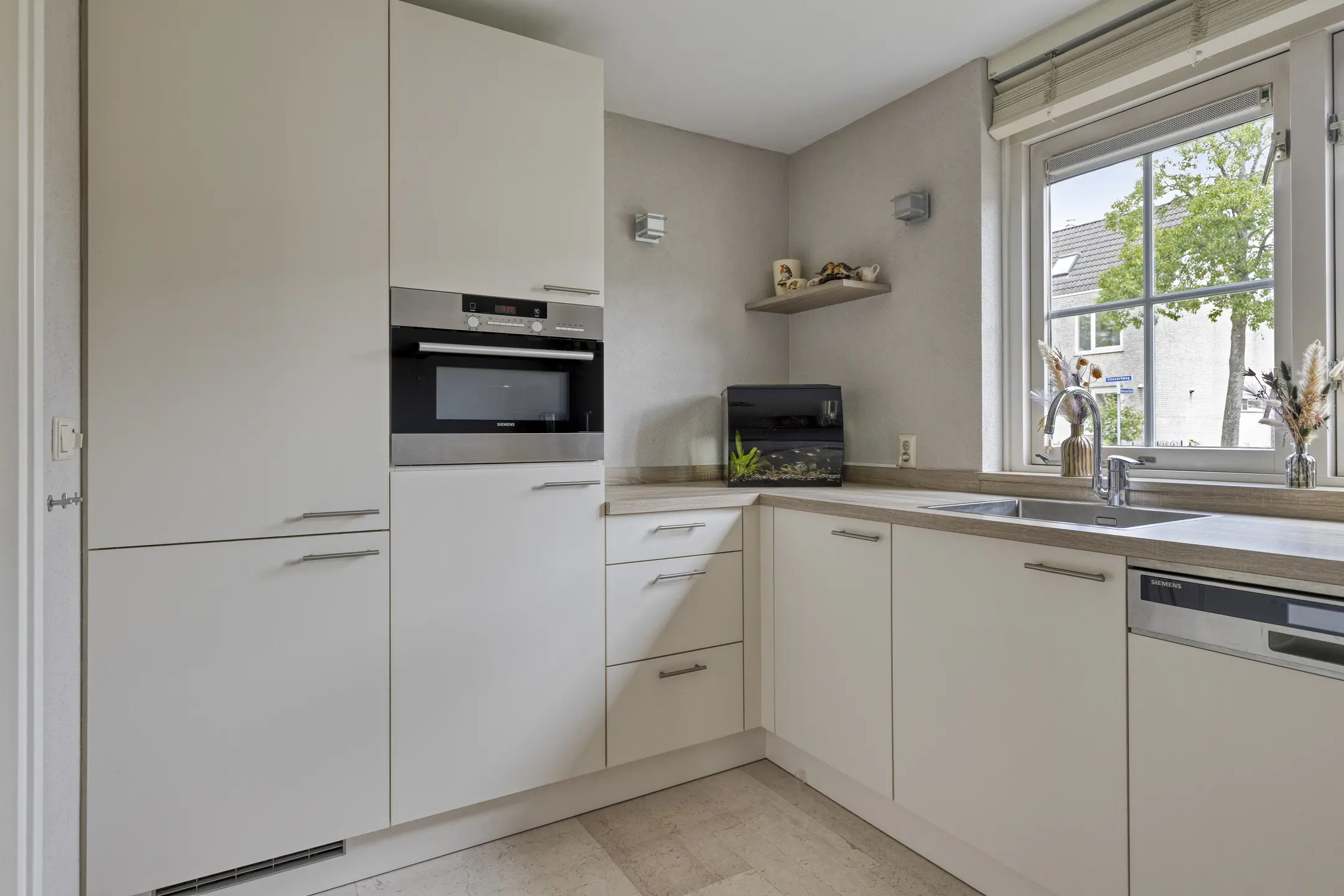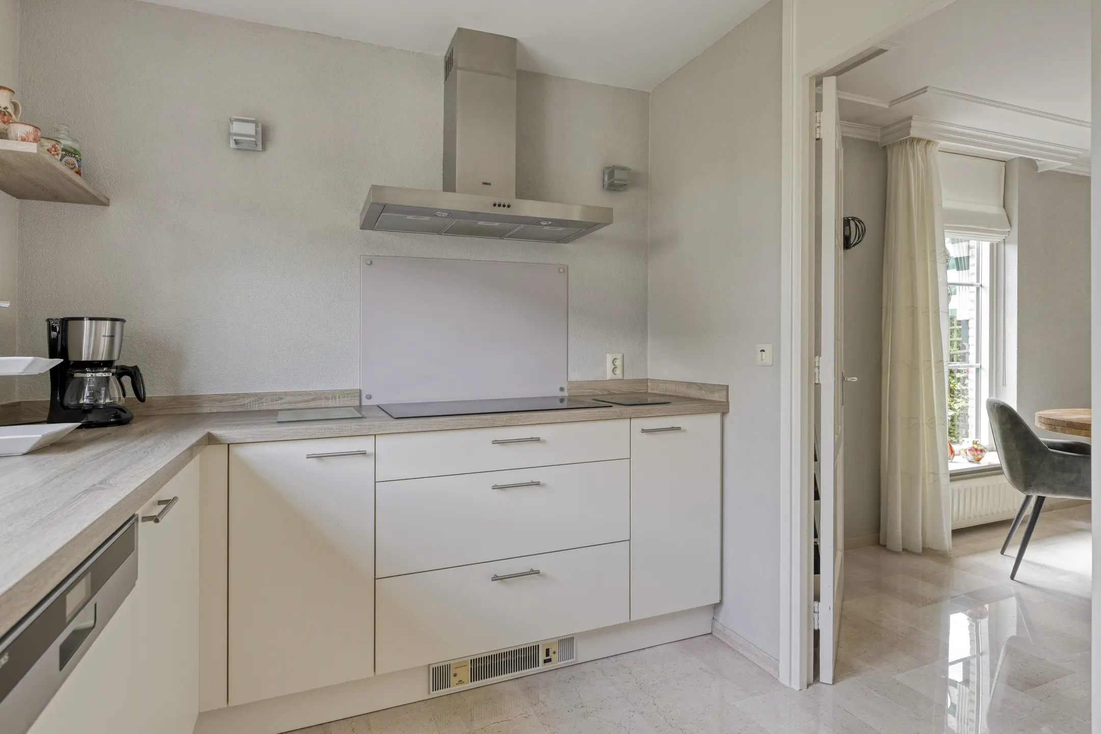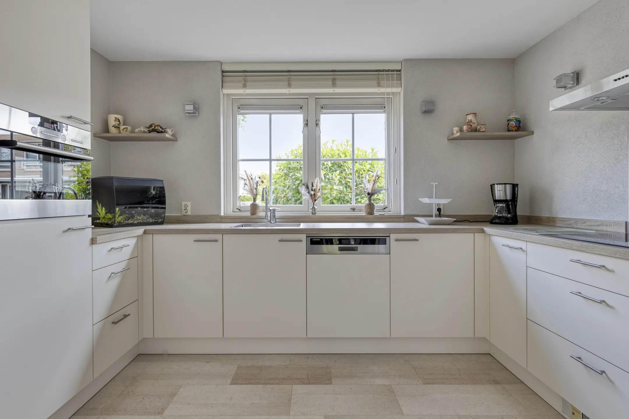 De moderne half/open keuken (ca. 9 m2) is gelegen aan de voorzijde van de woning en is uitgevoerd in een U-opstelling. Deze complete keuken is voorzien van diverse inbouwapparatuur zoals een koelkast, vrieskast, inductie kookplaat, RVS afzuigkap, combimagnetron en een vaatwasser. Het geheel is uitgevoerd in lichte kleuren en afgewerkt met een houten aanrechtblad en natuurstenen vloer met vloerverwarming.
