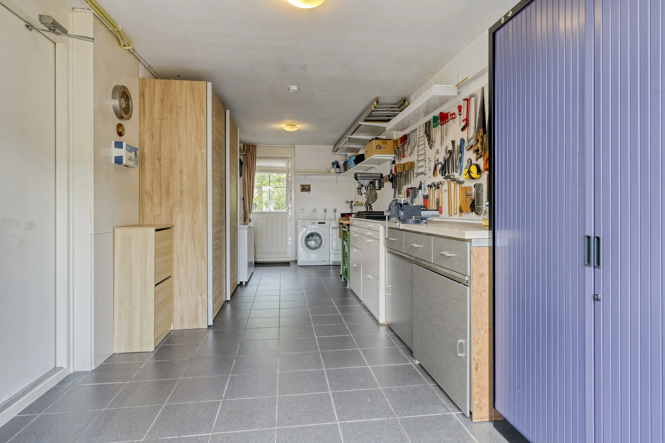 De inpandige garage (ca. 19 m2) is verwarmd en geïsoleerd en beschikt over vloertegels, de wasmachine- en drogeraansluiting, centraal stofzuigsysteem installatie en openslaande garagedeuren. Via een loopdeur heeft u toegang tot de achtertuin.