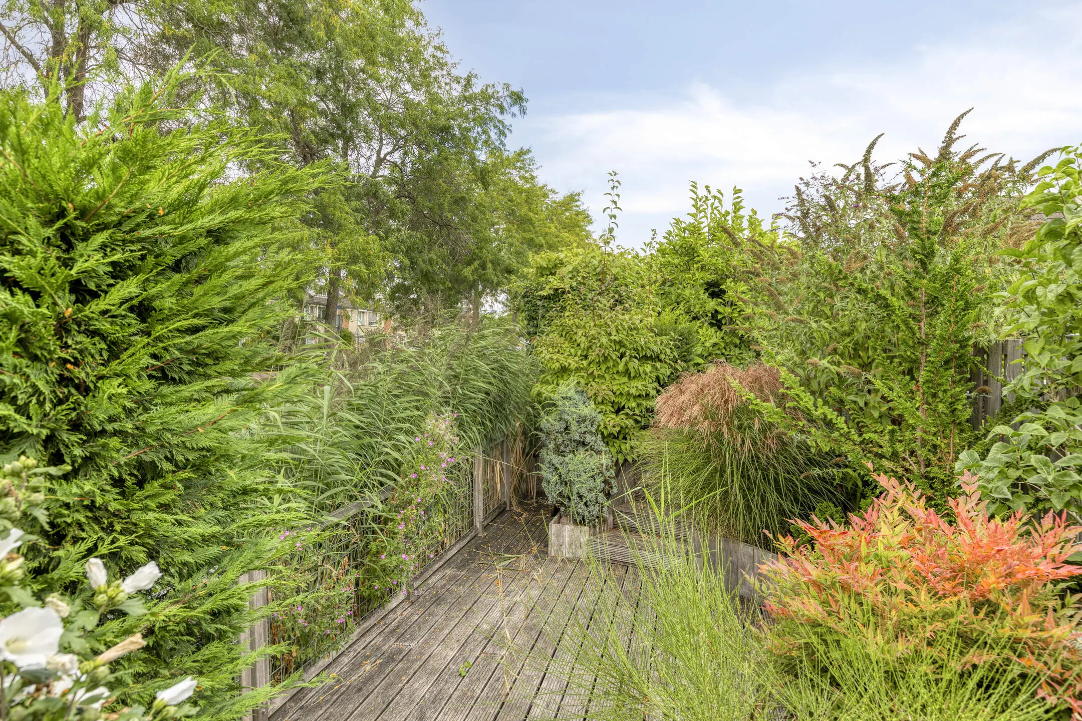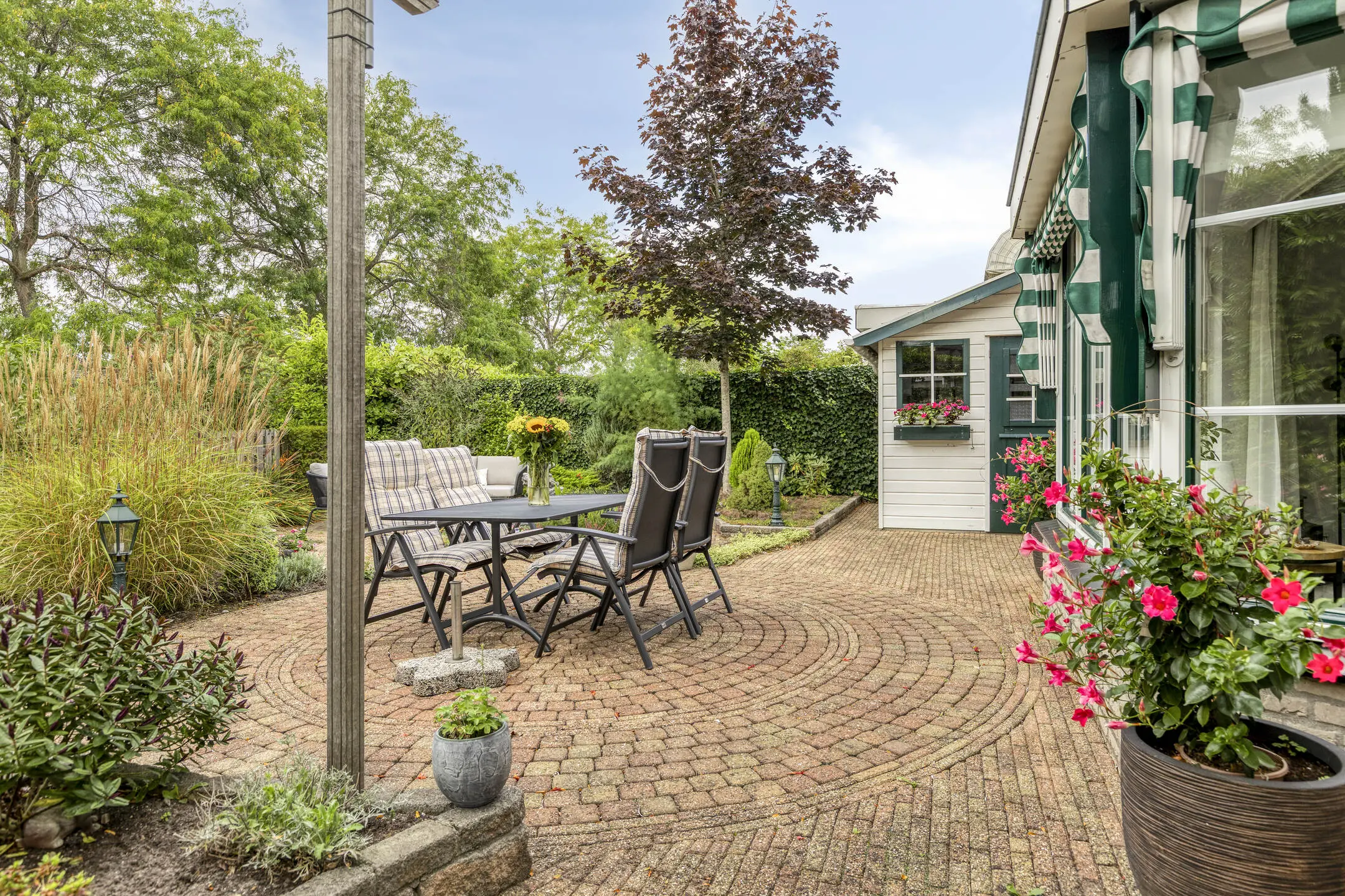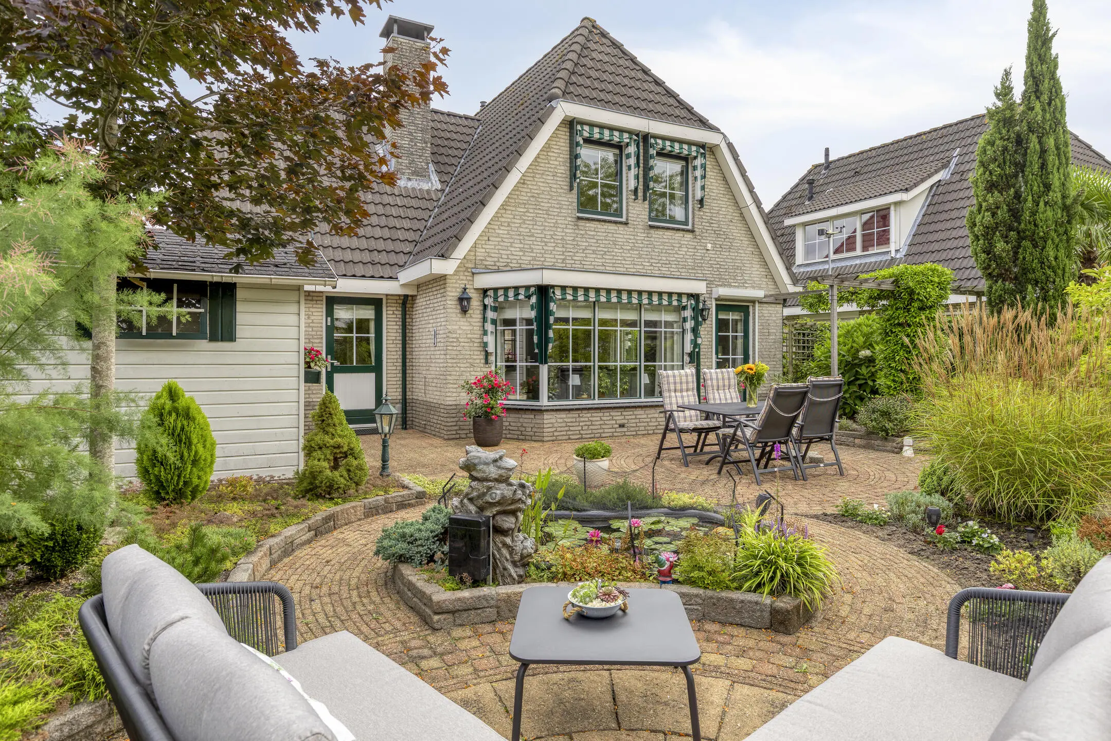 De achtertuin is een waar plaatje. Een plek waar u volop kunt genieten van rust en natuur. De achtertuin beschikt over sierbestrating, sierbeplanting, 2 achterom, een gezellige vijver, buitenkraan, verlichting, stopcontacten, een vlonder aan het water en twee tuinhuizen.
