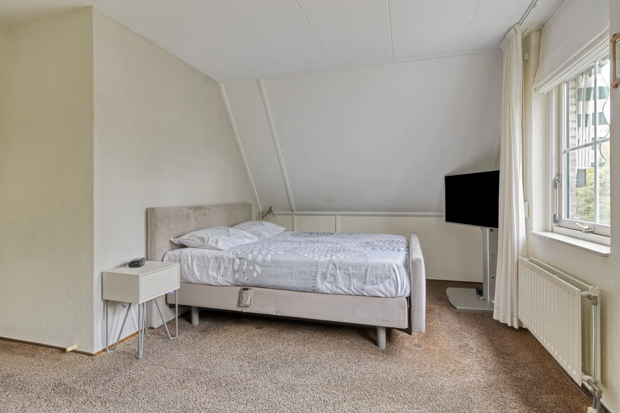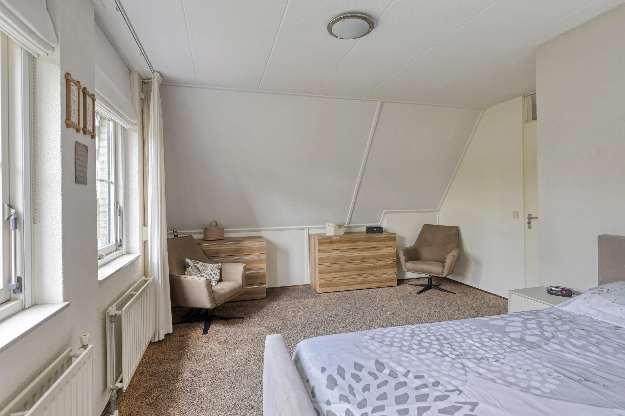Slaapkamer 1 (ca. 14 m2) is gelegen aan de achterzijde van de woning en beschikt over twee handmatig bedienbare markiezen, hor en vloerbedekking.