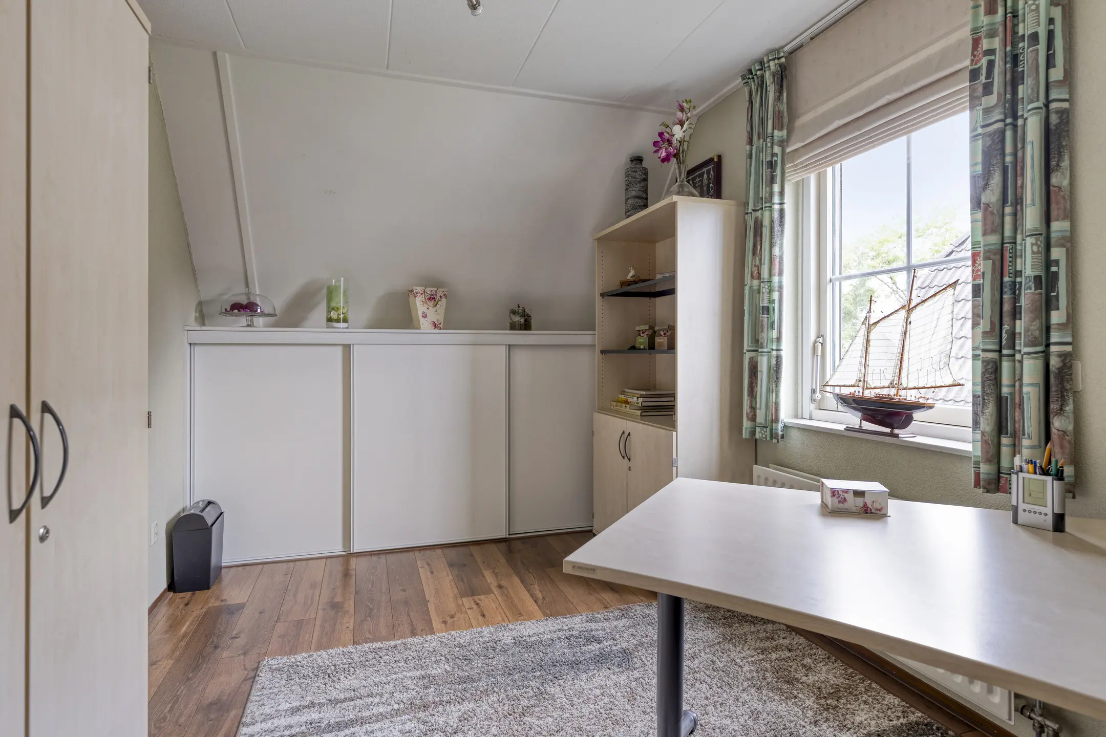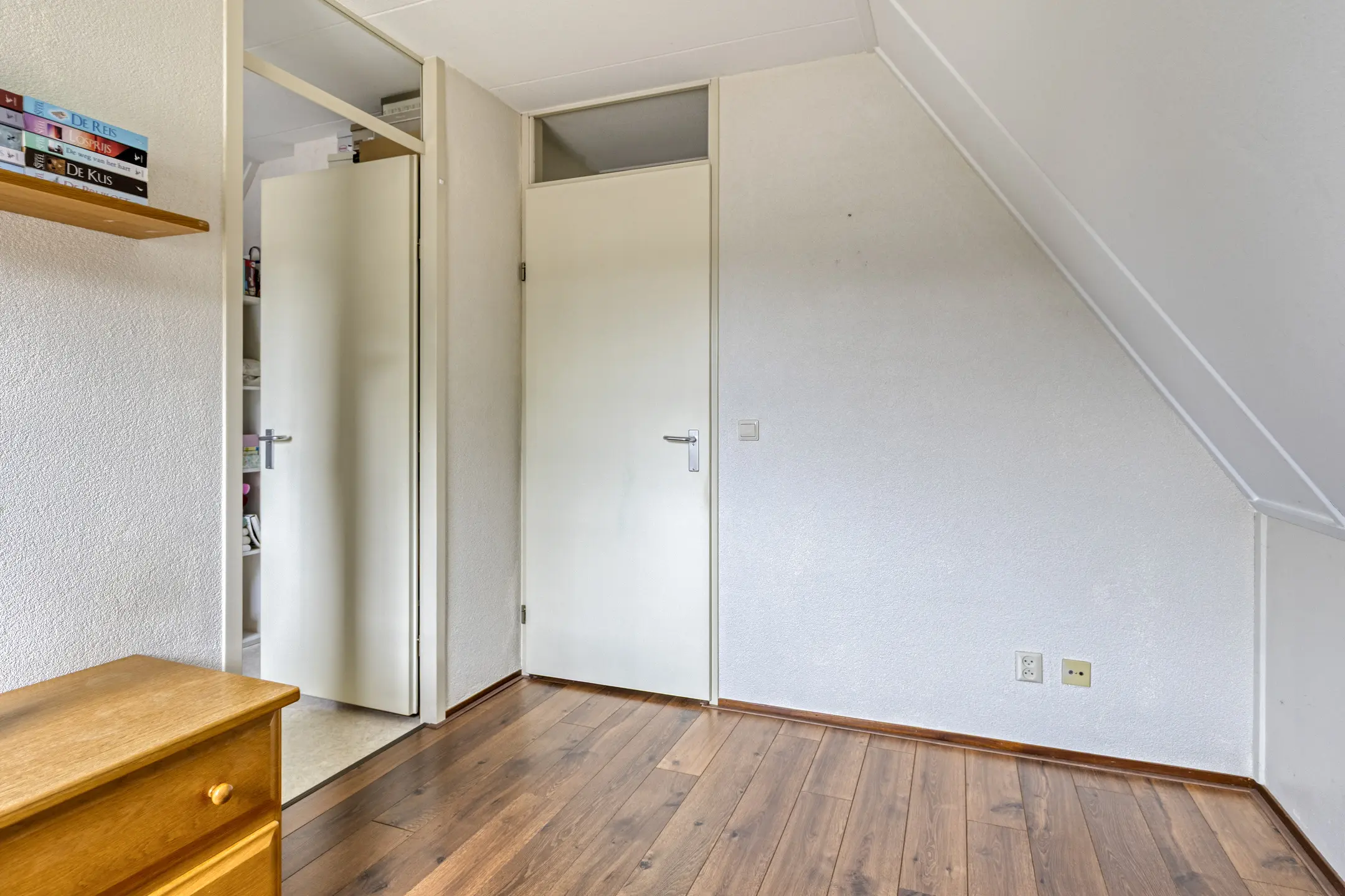 Slaapkamer 2 (ca. 11 m2) is gelegen aan de zijkant van de woning en beschikt over elektrisch bedienbaar rolluik, 3-deuren schuifkastenwanden, hor en parketvloer.