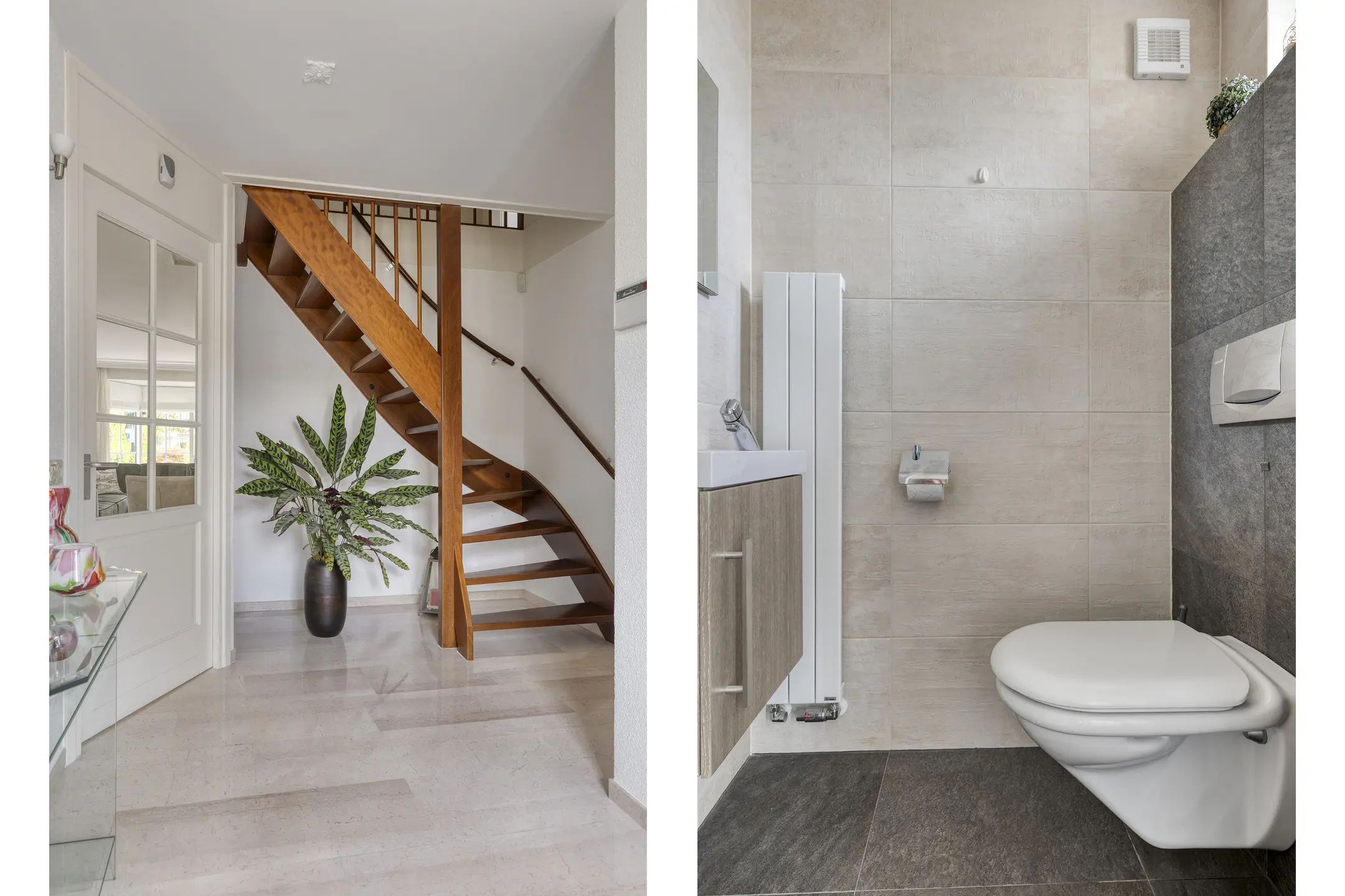 Entree, ruime hal, meterkast, trap naar de 1e verdieping, toegang tot de garage, fraai afgewerkte toiletruimte voorzien van een hangend toilet en fonteintje. De toiletruimte is geheel betegeld in een beige/grijs kleurstelling.