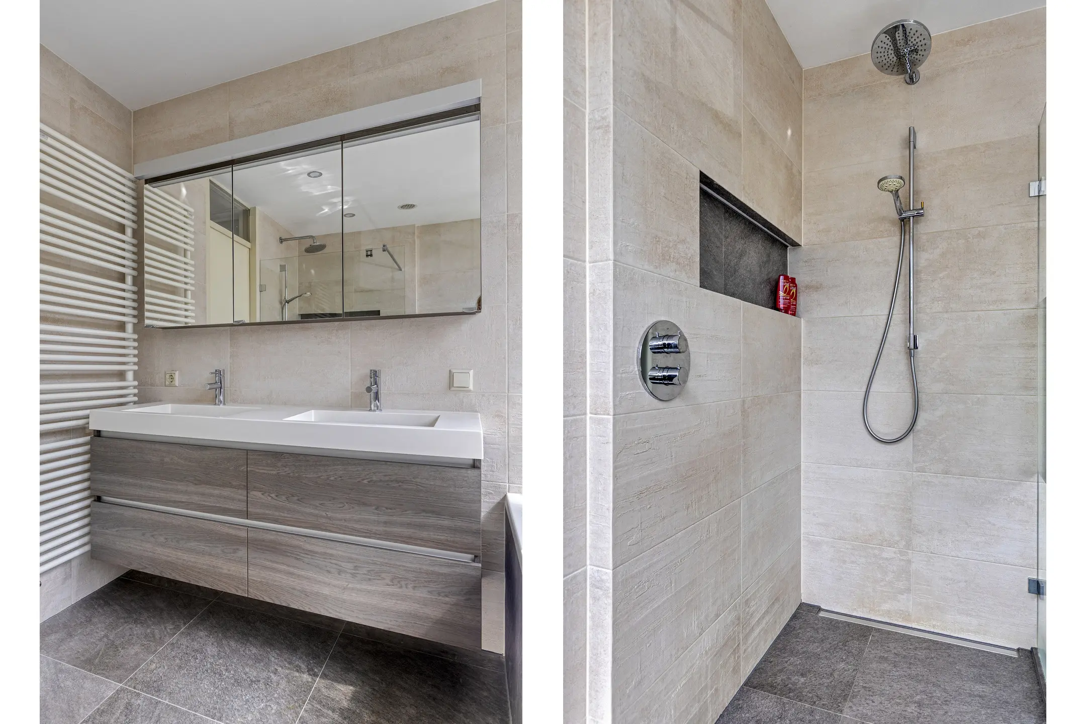 Moderne badkamer (ca. 8 m2) met luxe sanitaire voorzieningen zoals een dubbele wastafel met wandmeubel met spiegel en verlichting, hangend tweede toilet, kunststof ligbad en inloopdouche.