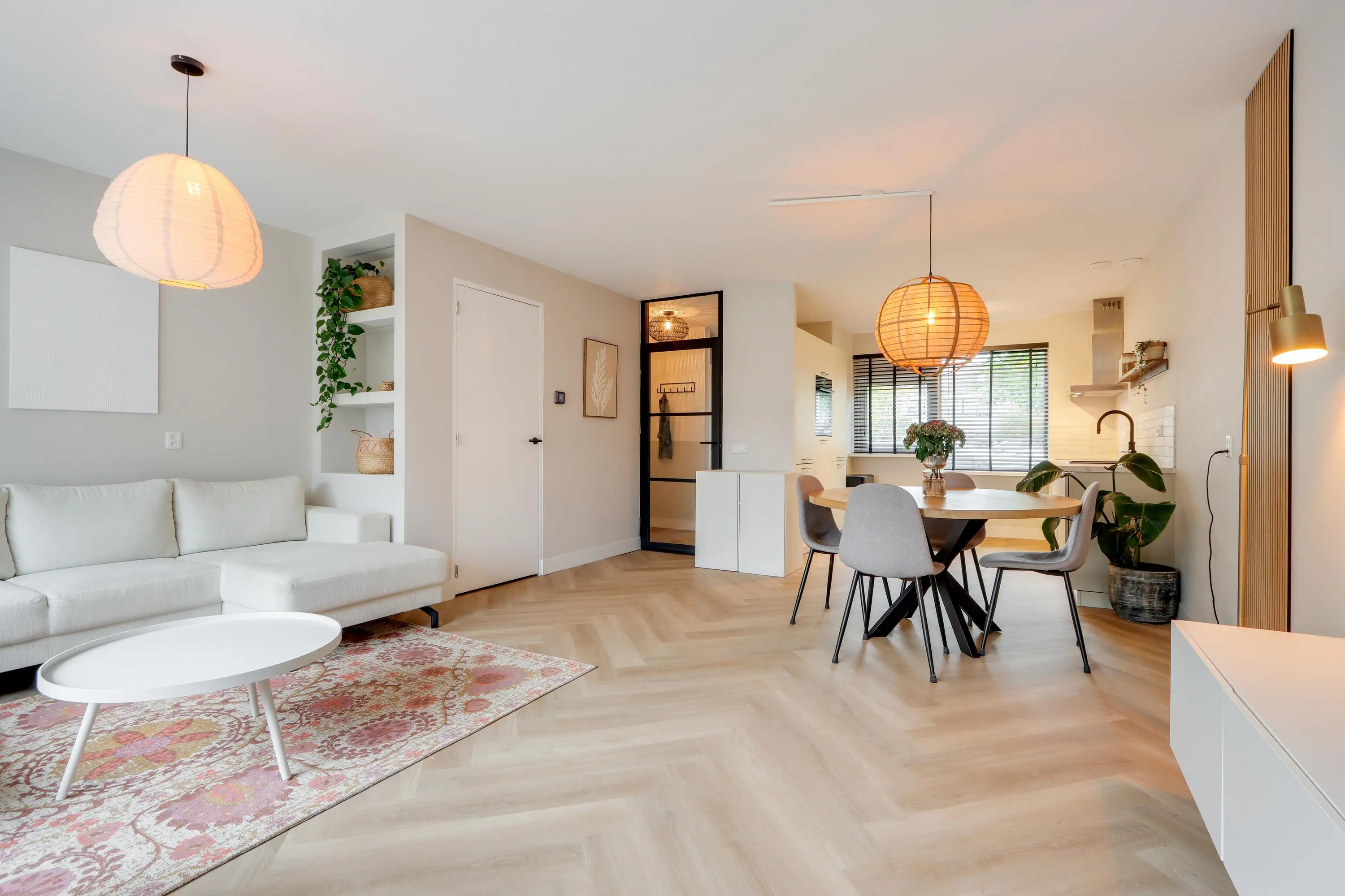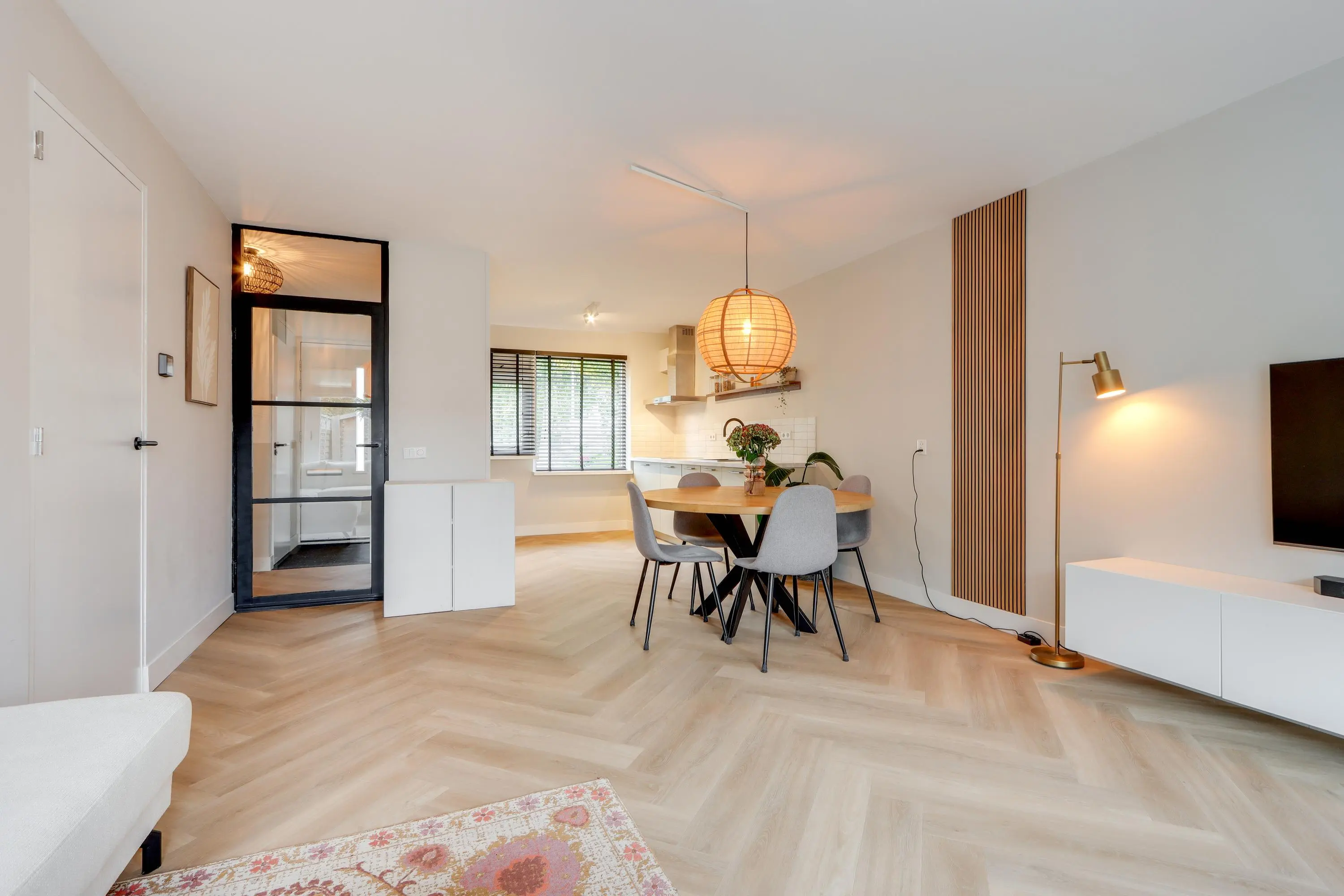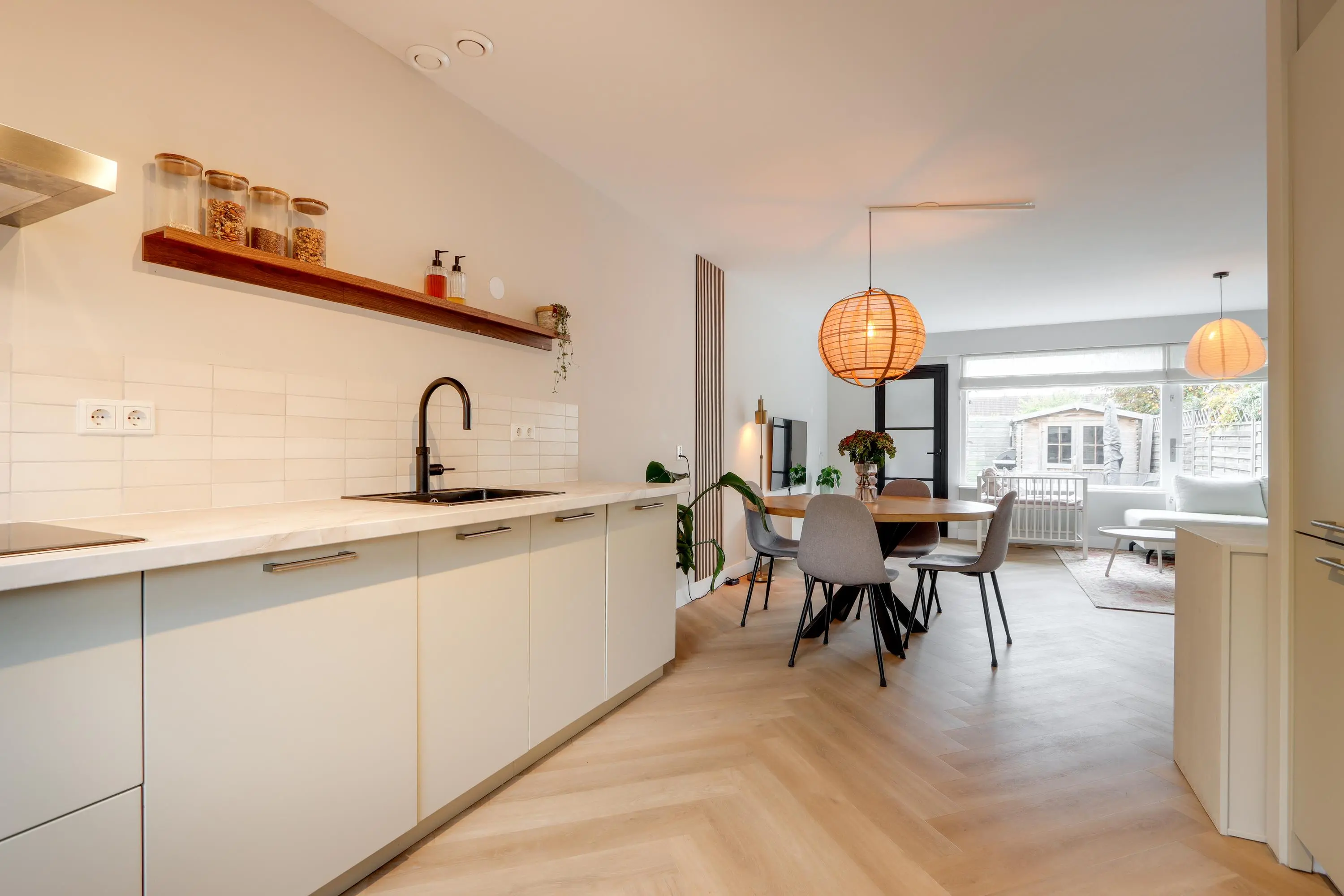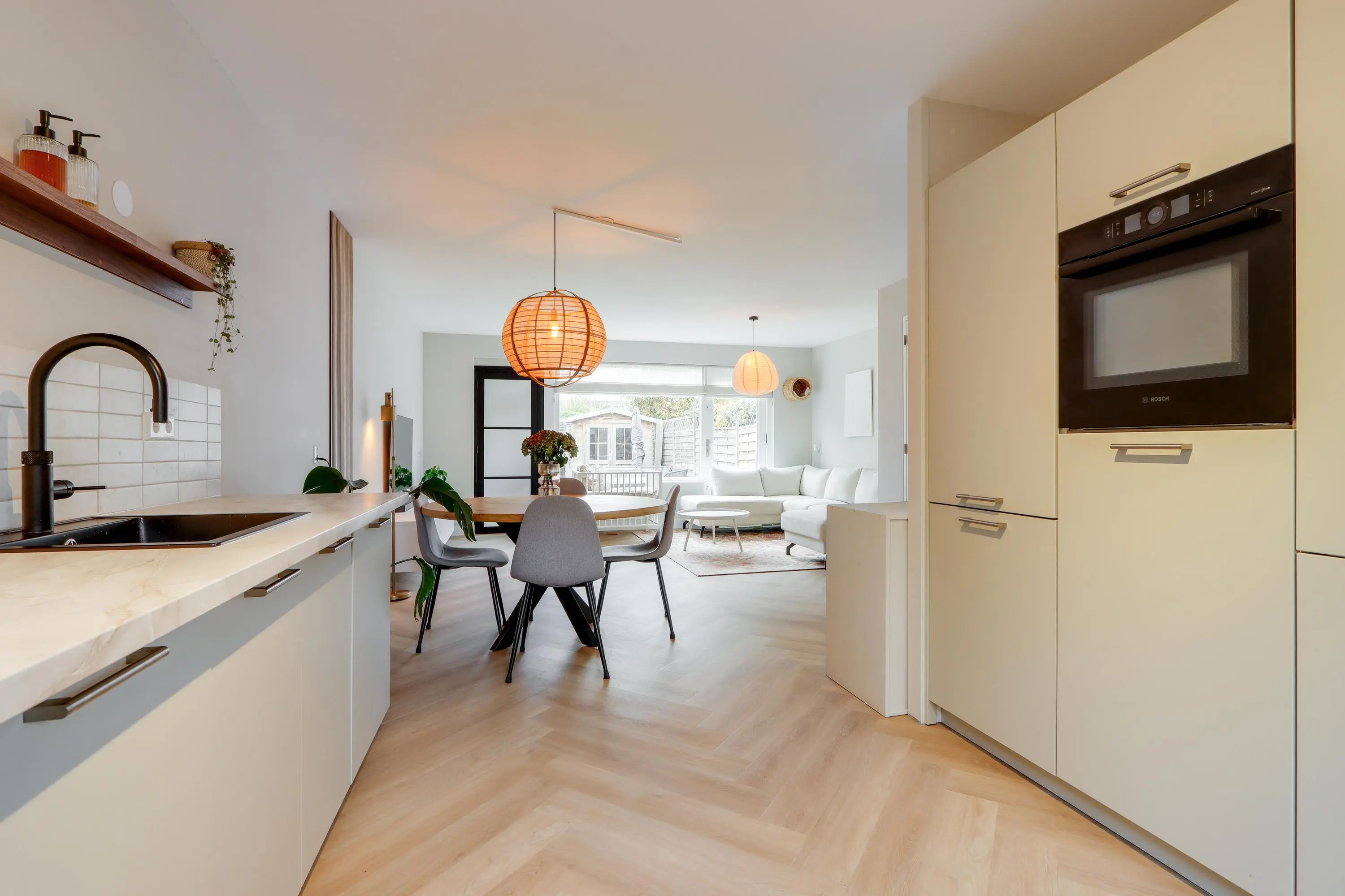 De woonkamer is het hart van het huis: ruim, licht en elegant afgewerkt, met een open verbinding naar de moderne keuken. De keuken is voorzien van hoogwaardige inbouwapparatuur, strakke lijnen en veel werkruimte – een plek waar koken en samen zijn moeiteloos samengaan.