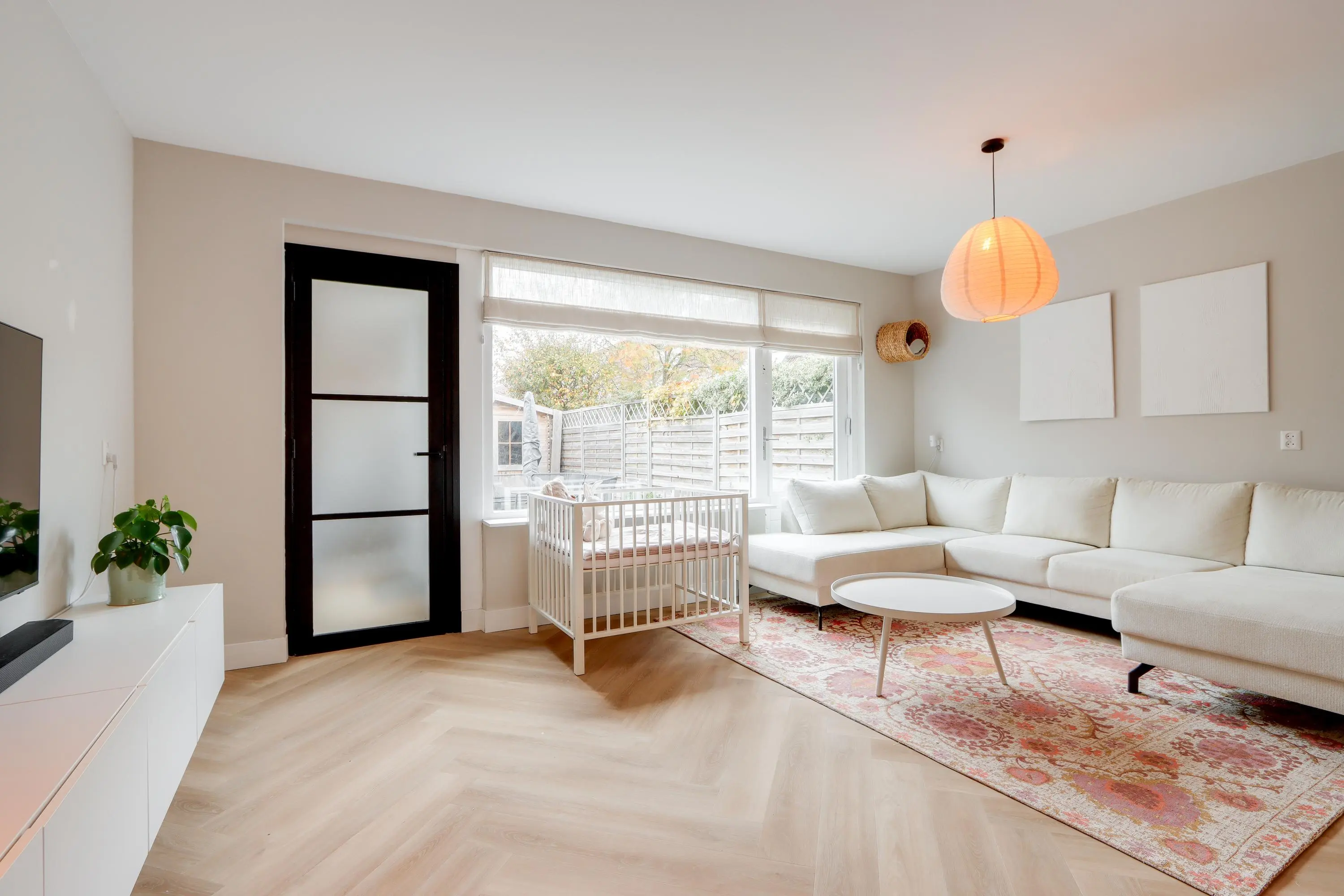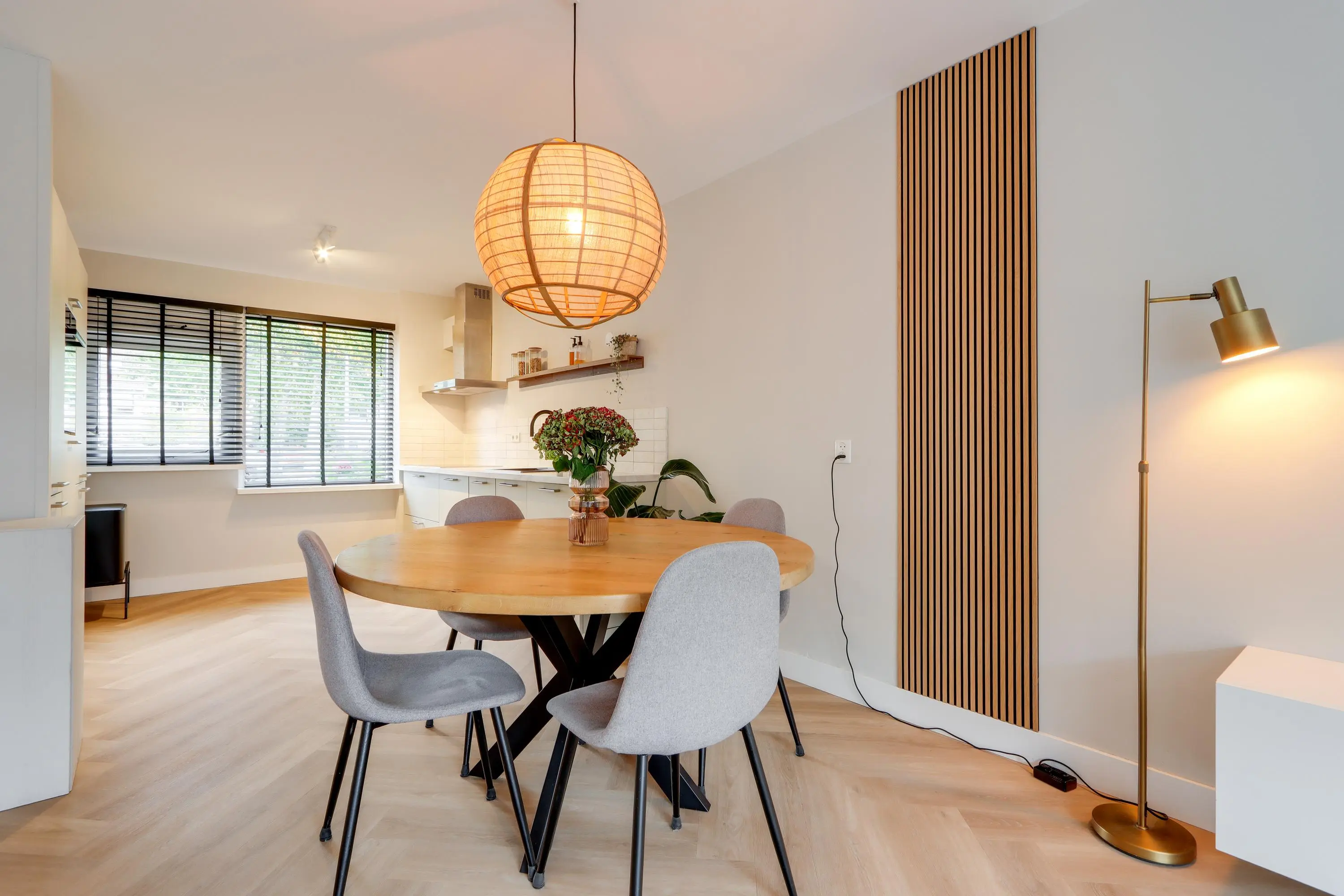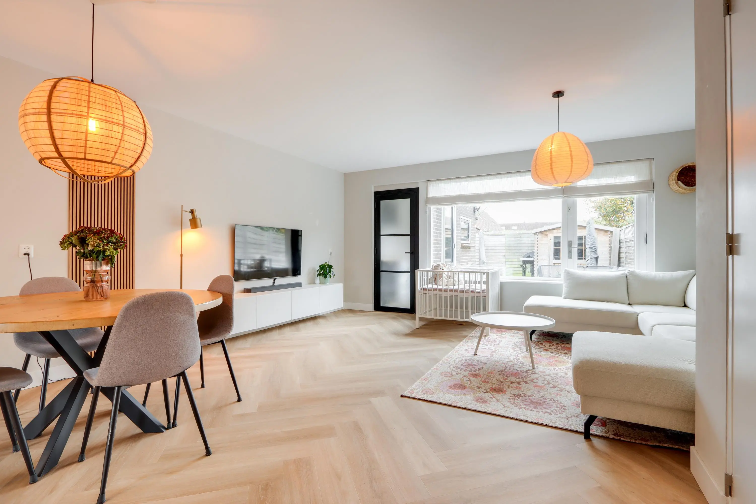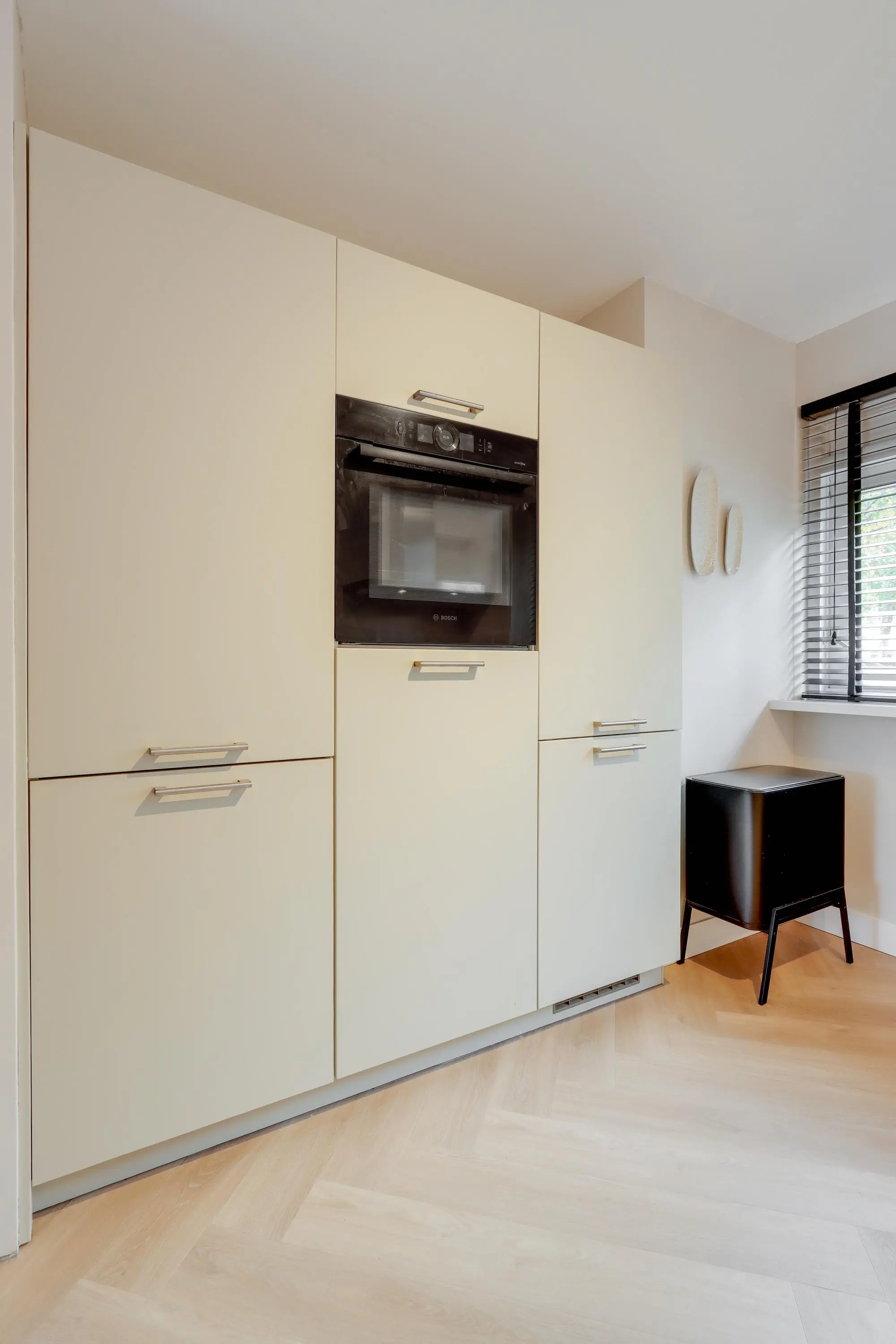 De woonkamer is het hart van het huis: ruim, licht en elegant afgewerkt, met een open verbinding naar de moderne keuken. De keuken is voorzien van hoogwaardige inbouwapparatuur, strakke lijnen en veel werkruimte – een plek waar koken en samen zijn moeiteloos samengaan.