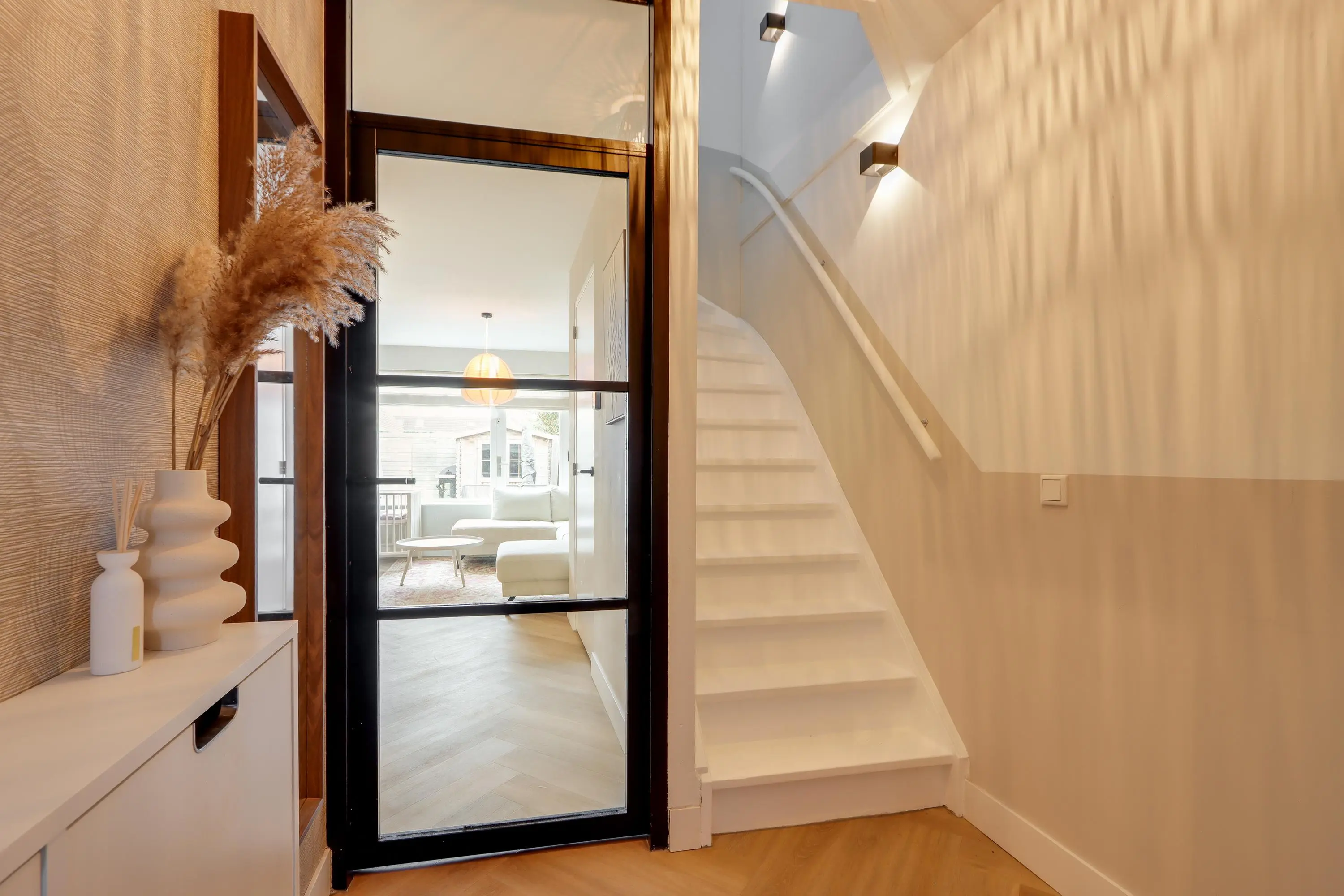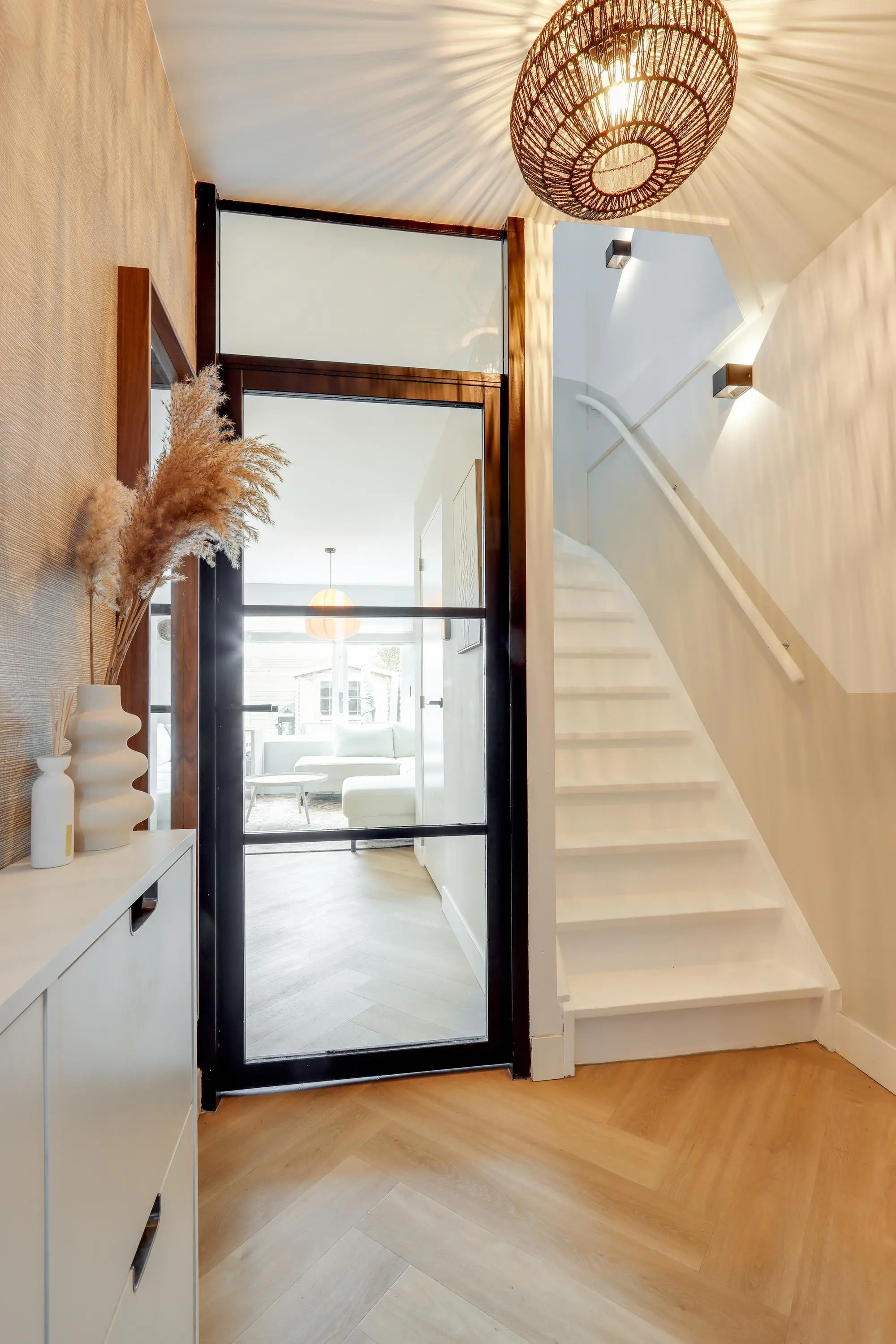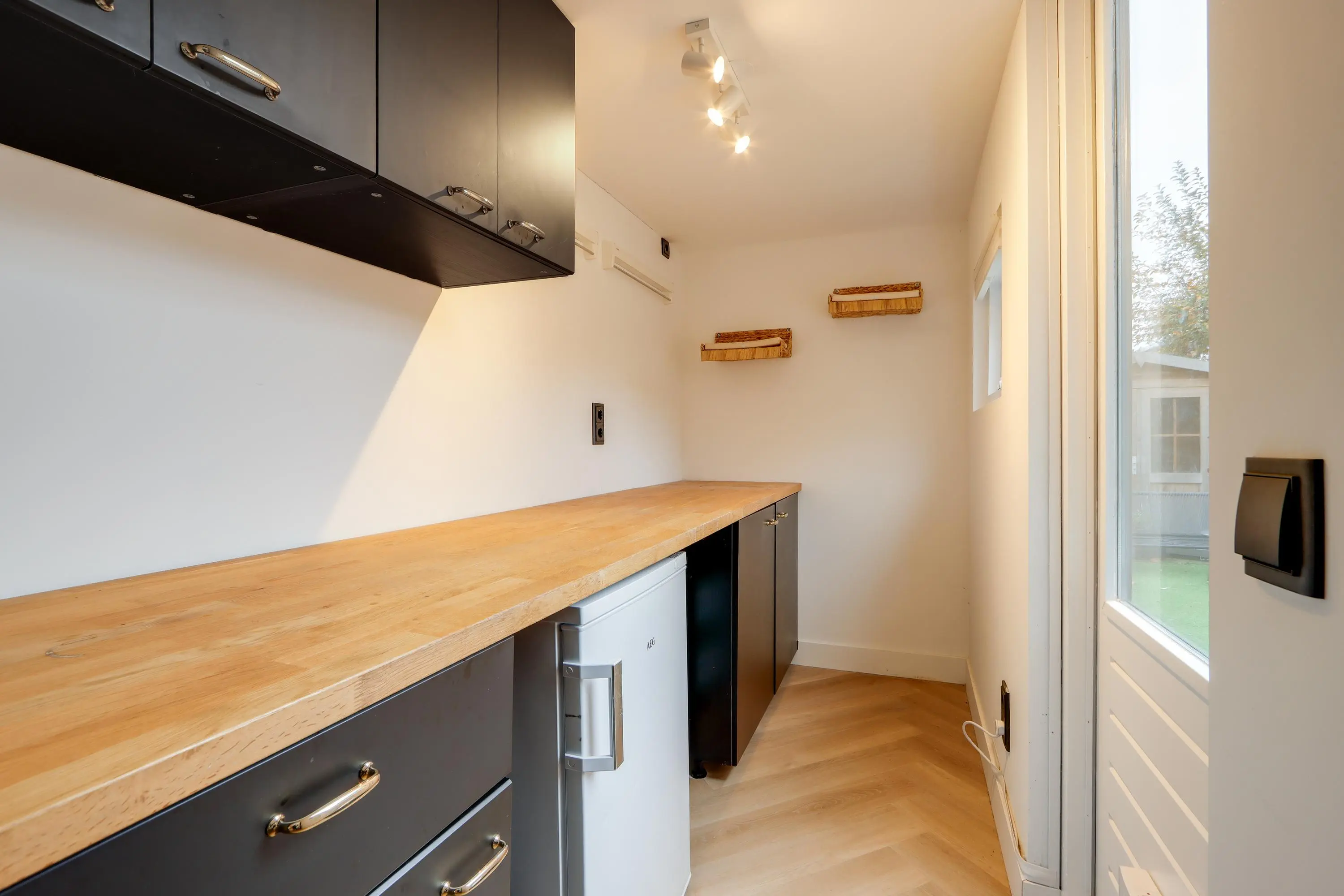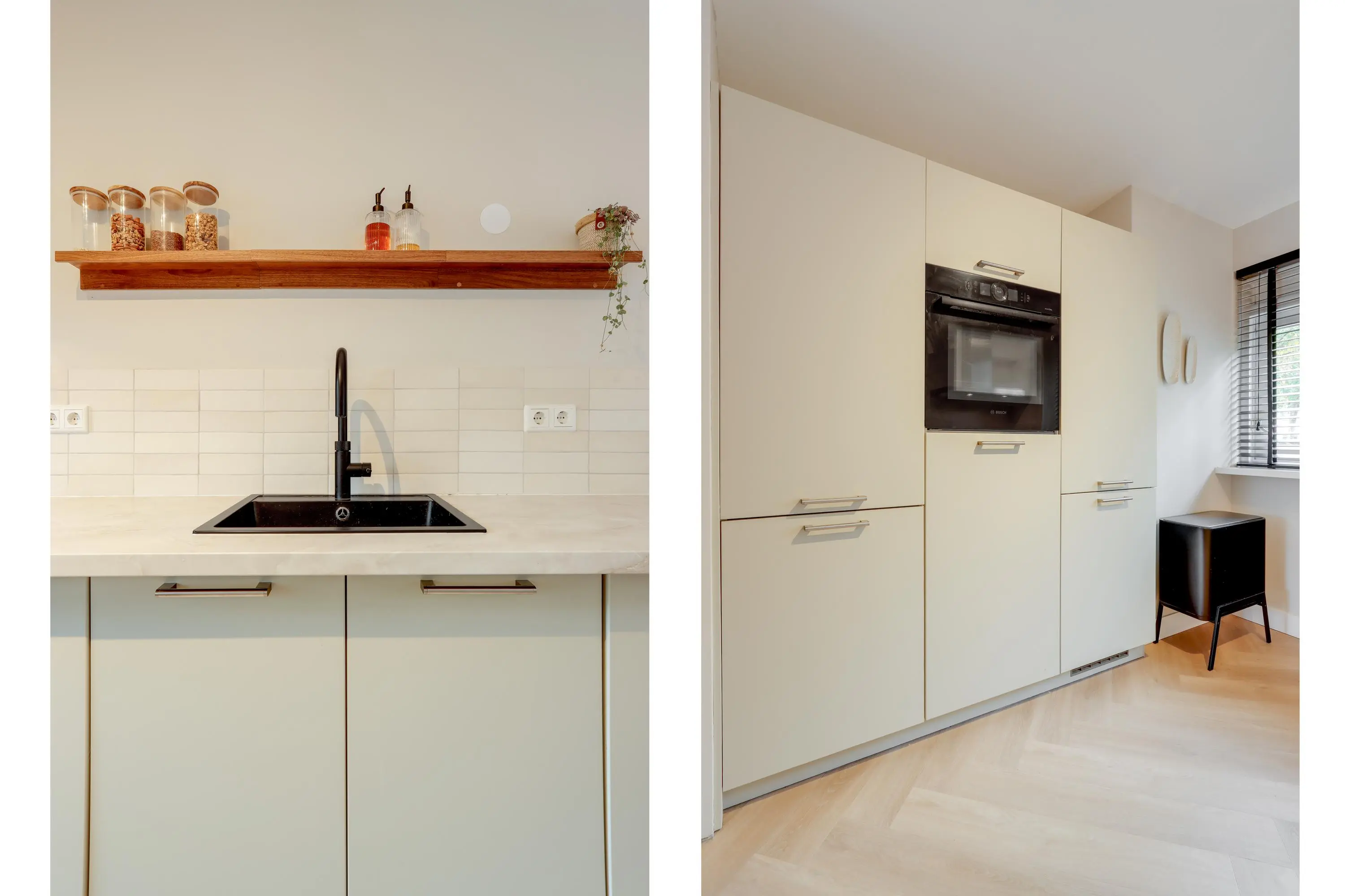 De woonkamer is het hart van het huis: ruim, licht en elegant afgewerkt, met een open verbinding naar de moderne keuken. De keuken is voorzien van hoogwaardige inbouwapparatuur, strakke lijnen en veel werkruimte – een plek waar koken en samen zijn moeiteloos samengaan.