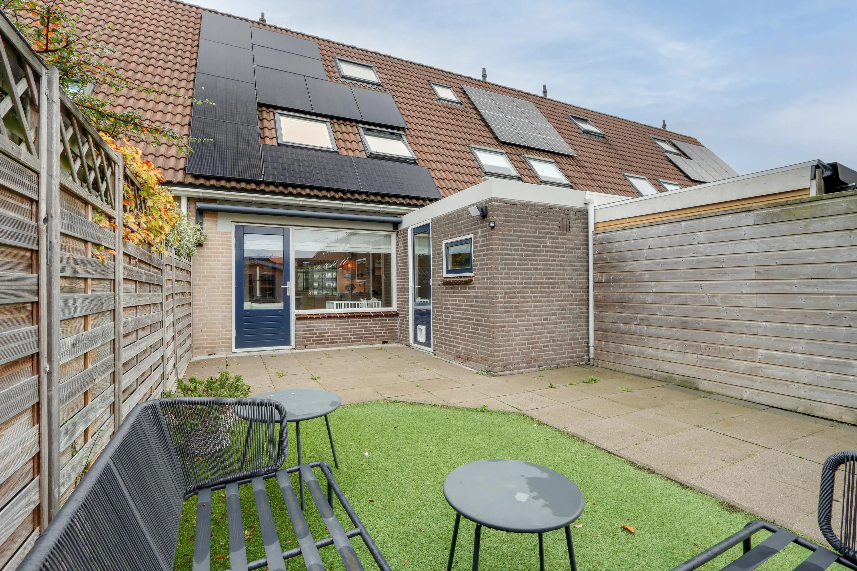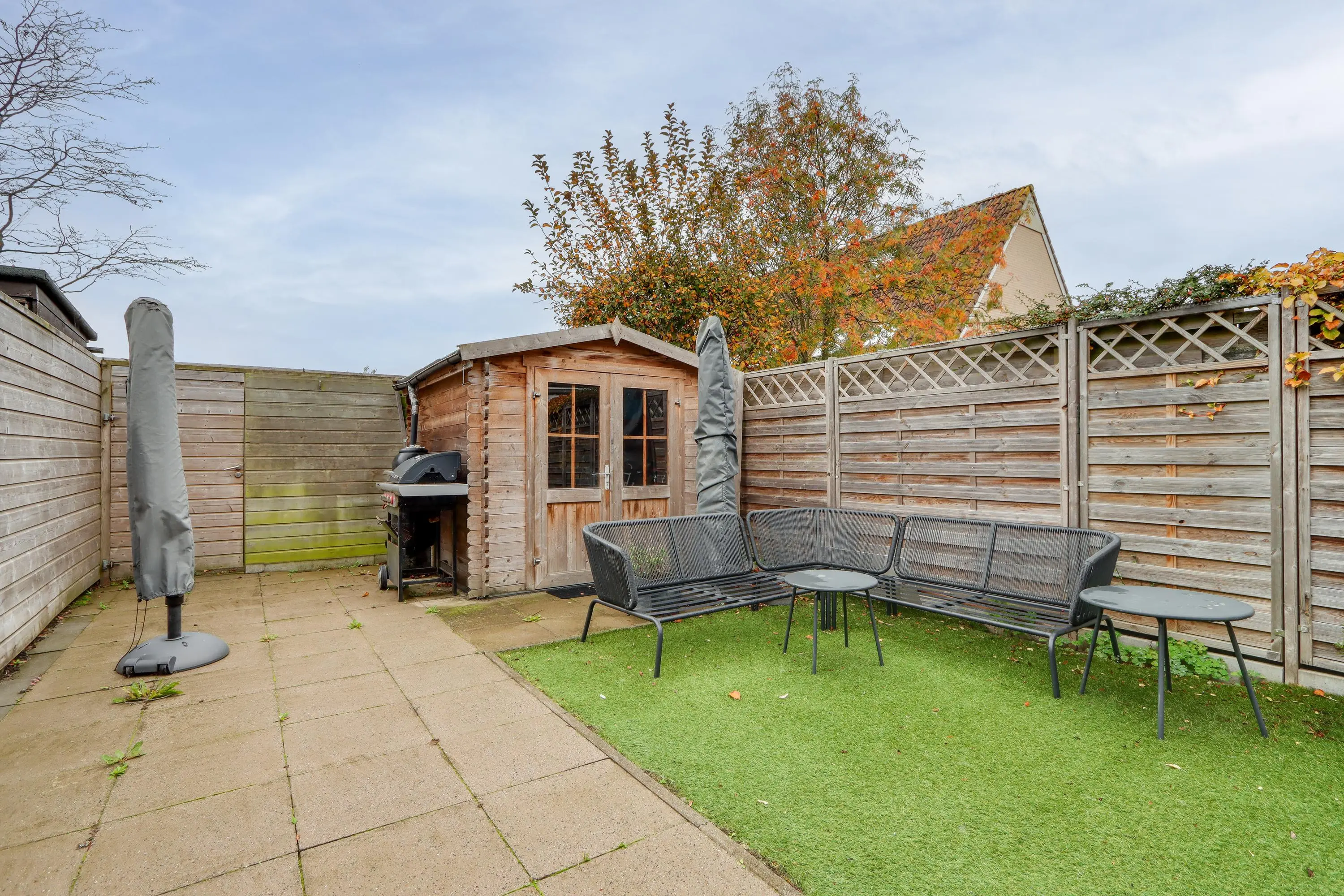 De zonnige achtertuin is een echte oase van rust en privacy. Met een terras, groen gazon en voldoende ruimte voor een loungeset of speeltoestellen is het een perfecte plek voor ontspanning, buitenleven en gezellige momenten met familie en vrienden. De ligging van de tuin zorgt dat u optimaal van de zon geniet gedurende de dag.