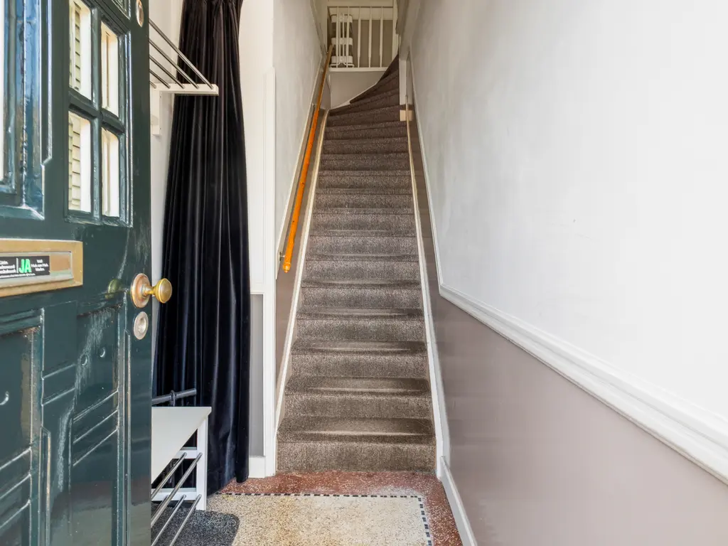 De privé-entree, uitgerust met een originele terrazzo vloer en meterkast bevindt zich op straatniveau. Een dichte houten trap geeft toegang tot de bovengelegen verdiepingen.