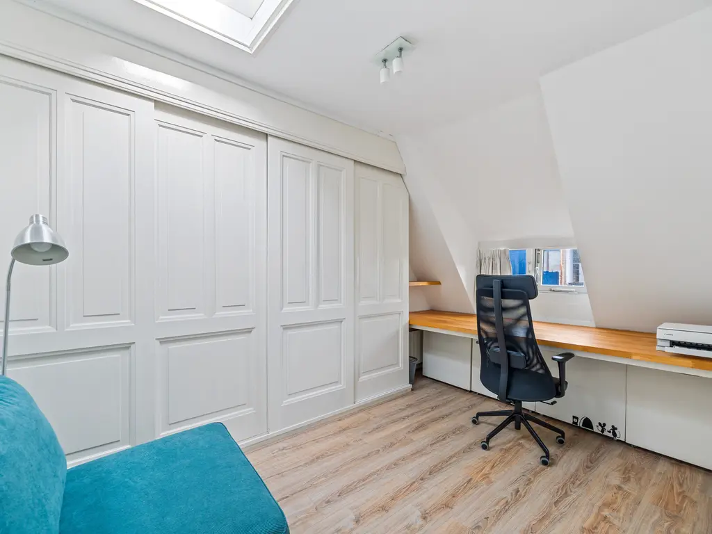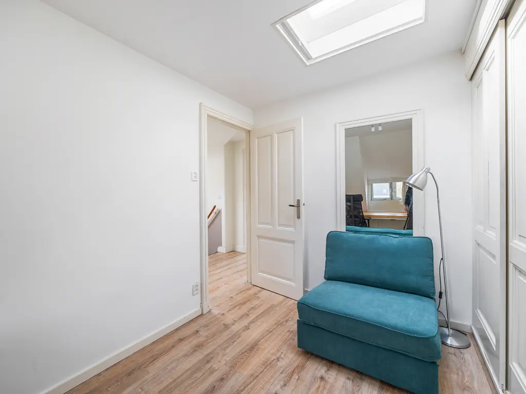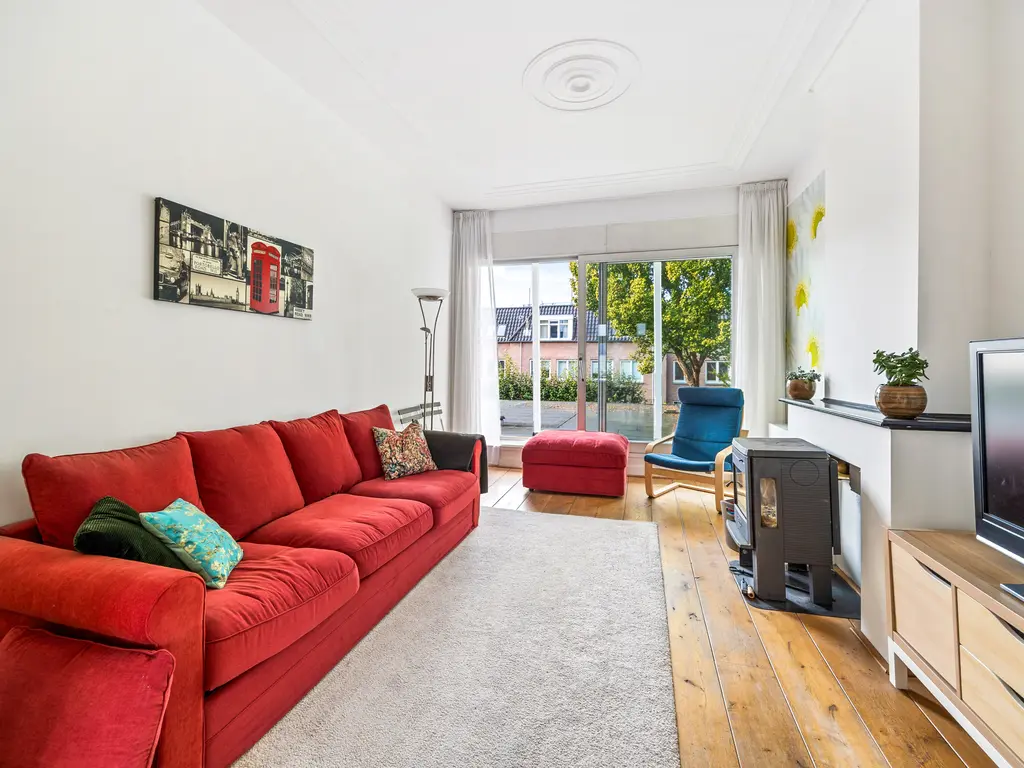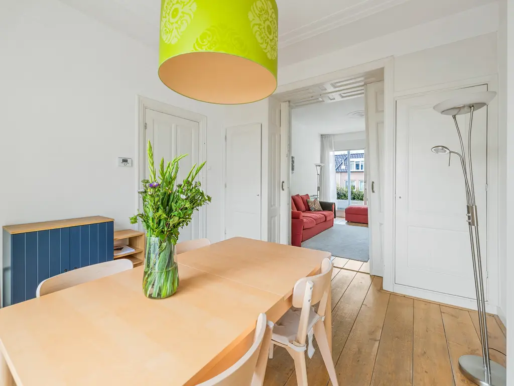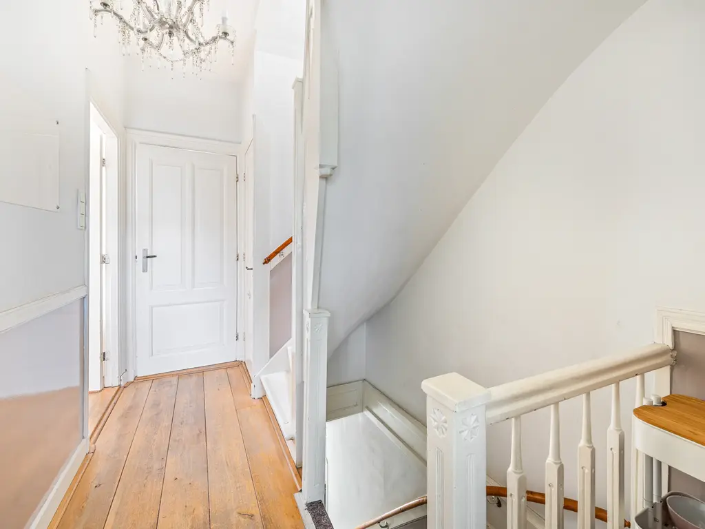 This charming, two-story, four- to five room apartment from 1909 is located in the heart of Leidschendam. The living area is 105m². It has protected status and features several original details, including a terrazzo floor, sliding doors in the living/dining room with two wardrobes and shelving and the original turret roof.