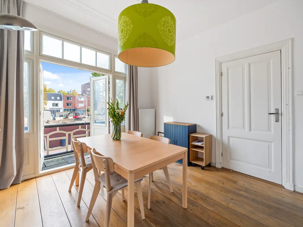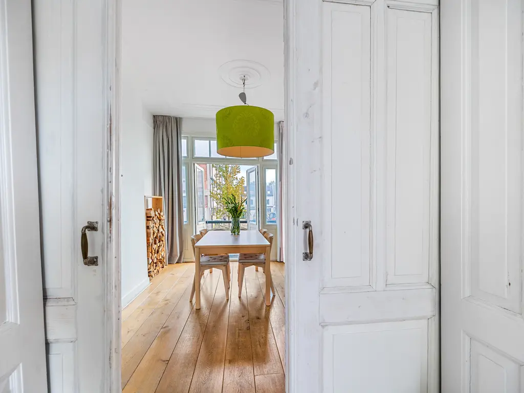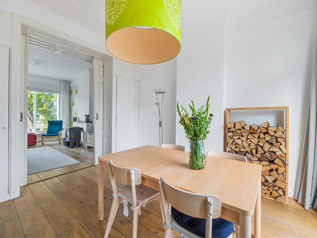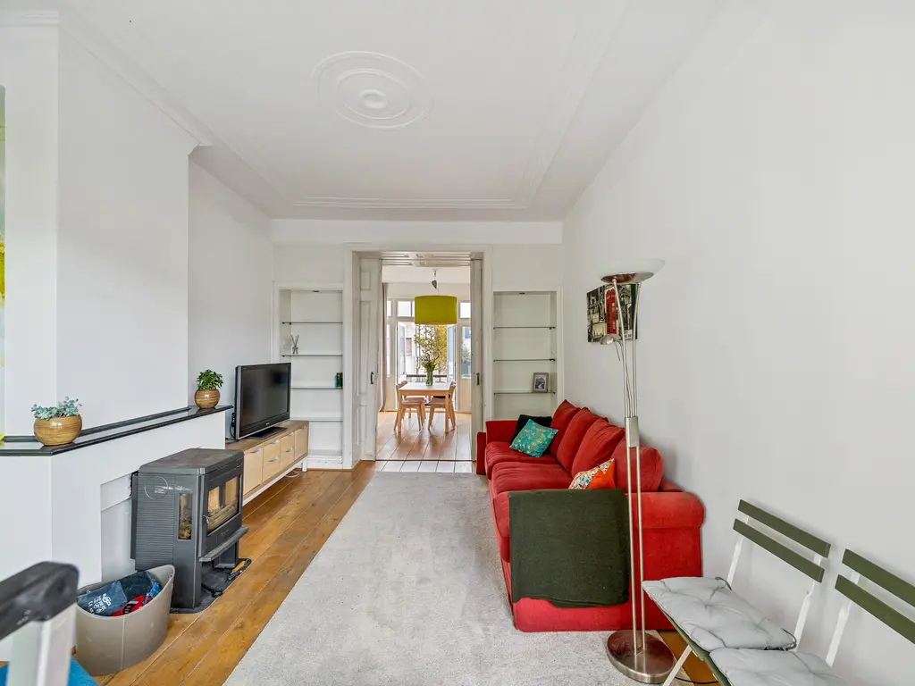 The landing (4.5m²) provides access to all rooms, including a toilet (with a small sink), a laundry room (located at the front with ample space for a washing machine and dryer), and the kitchen (approximately 7m²) at the rear, equipped with a built-in oven, microwave, five-burner gas stove with extractor hood, and a close-in water heater. The fridge-freezer and dishwasher are separate. The spacious living-dining room (30m²) is separated by an original sliding partition with two cupboards and two sets of shelving. A freestanding wood-burning stove sits on a wooden floor. The dining room, located at the front of the house, opens through French doors onto a small balcony overlooking Damlaan. Large sliding glass doors at the rear provide access to the veranda (8.4m²).