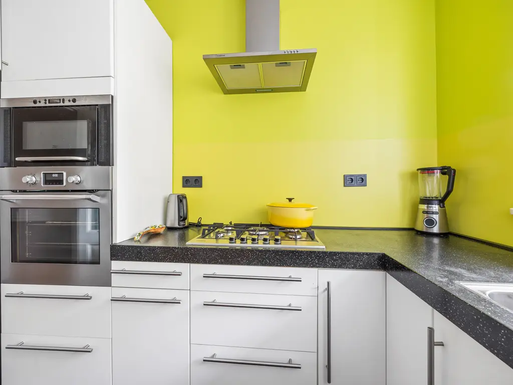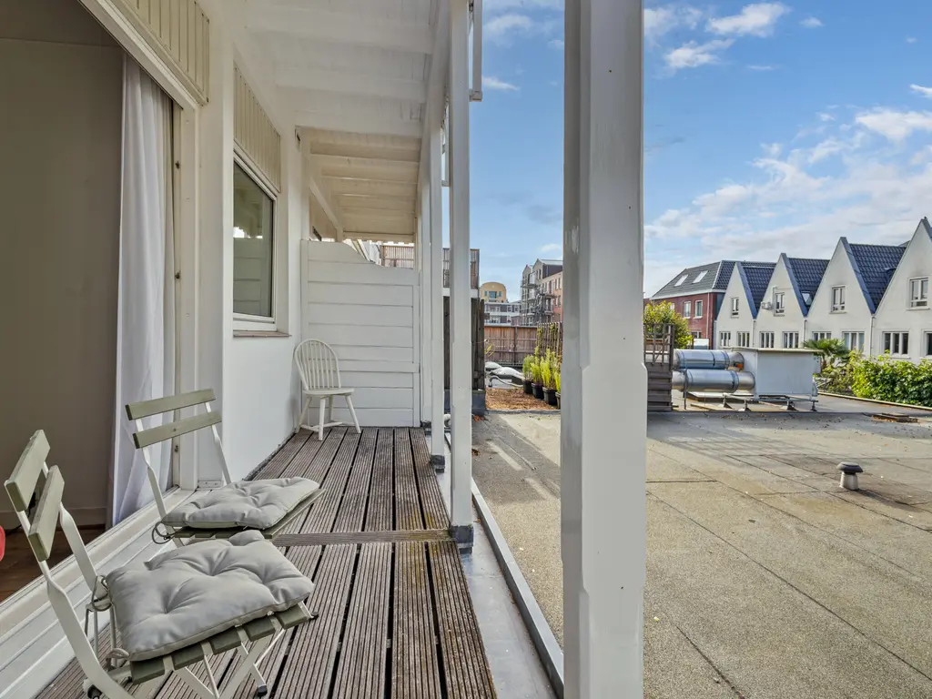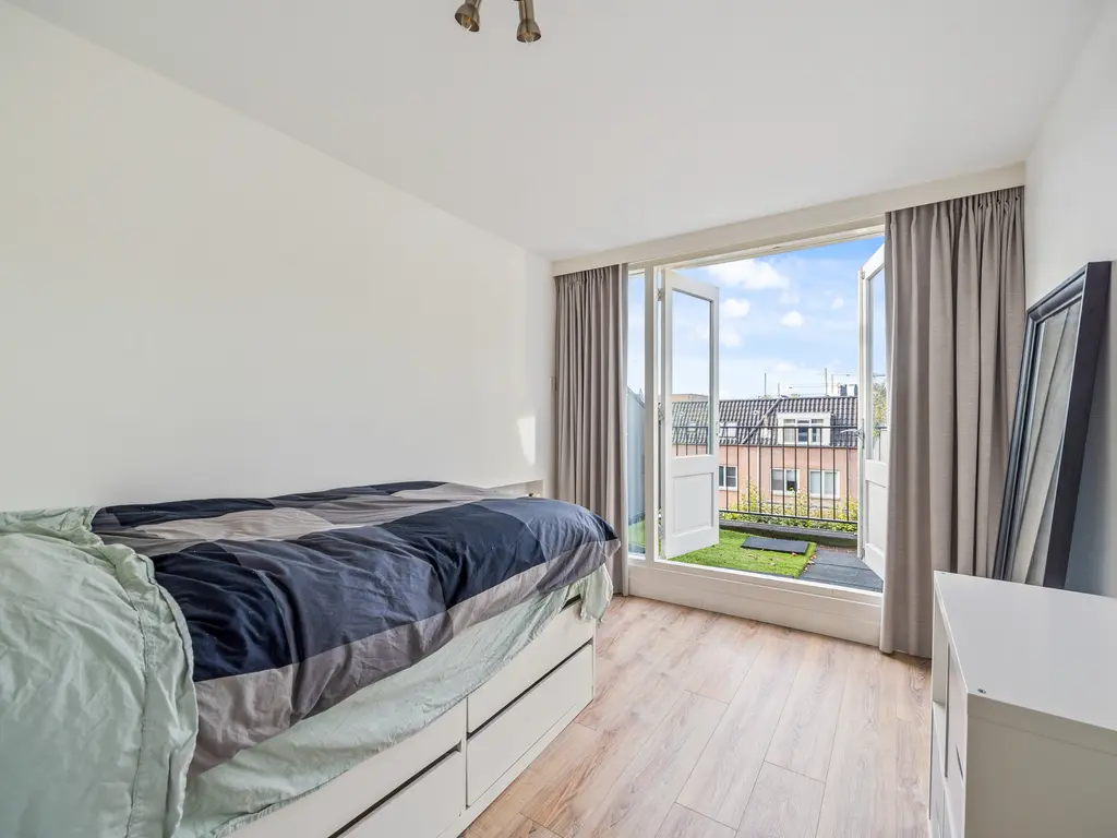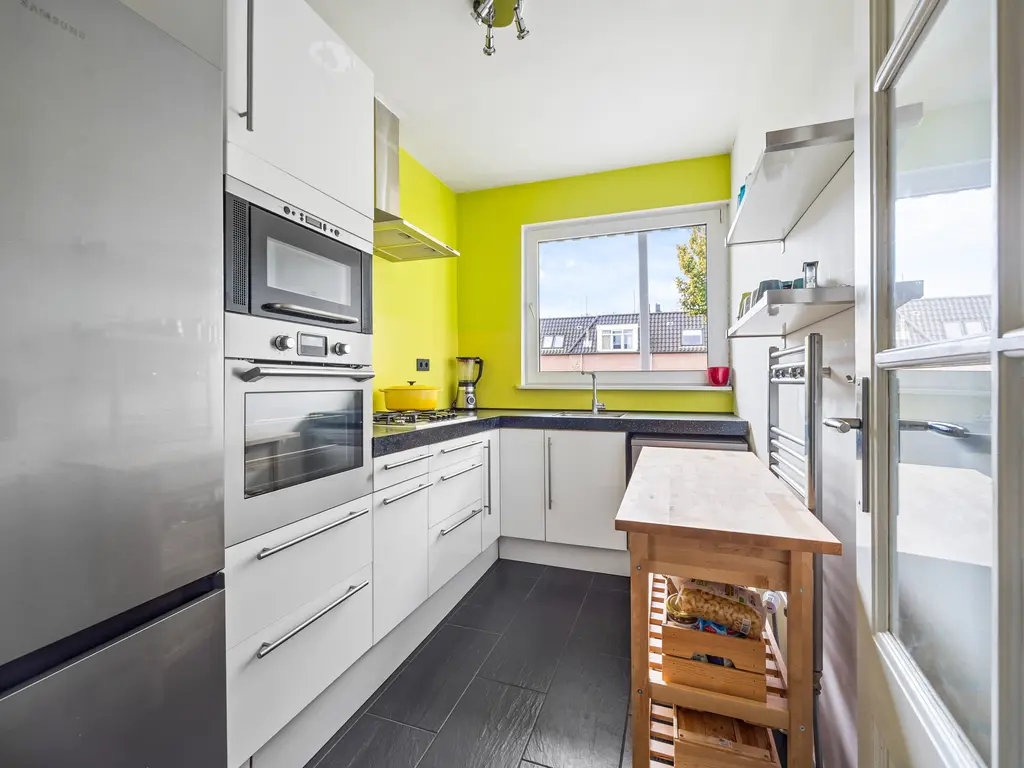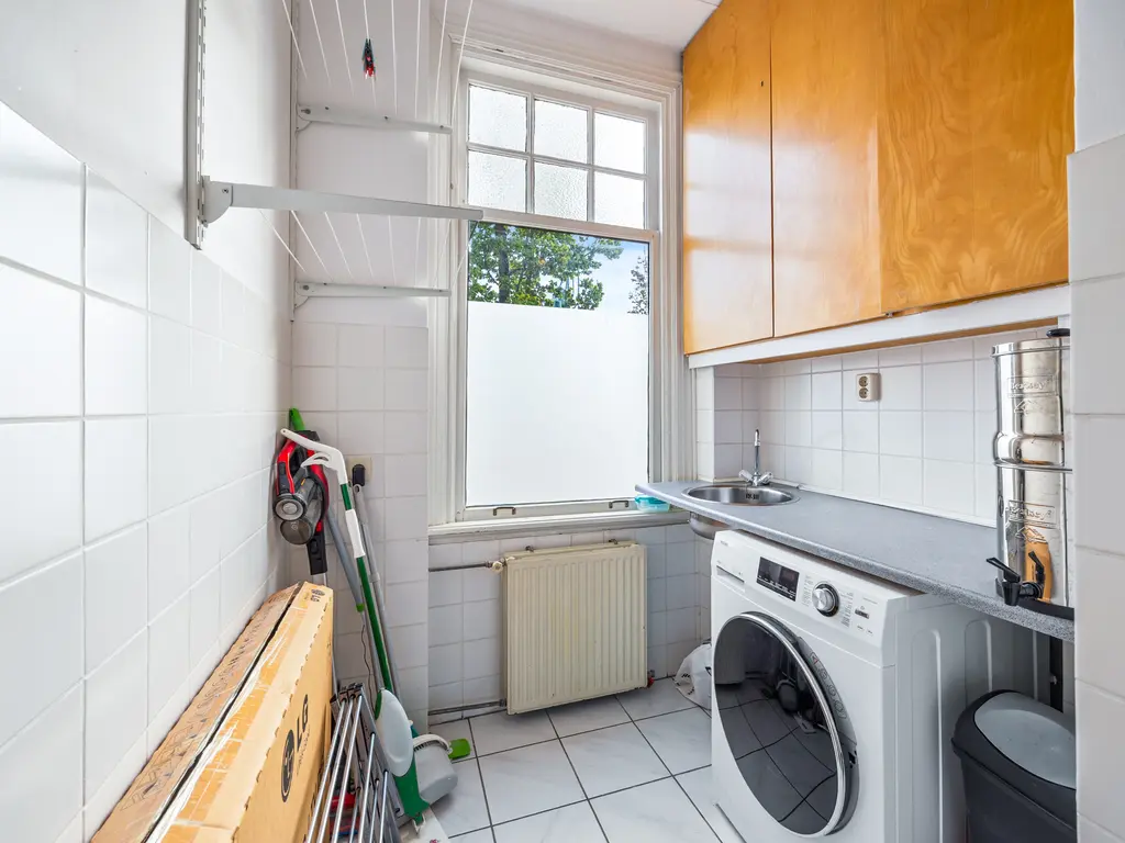 The landing (4.5m²) provides access to all rooms, including a toilet (with a small sink), a laundry room (located at the front with ample space for a washing machine and dryer), and the kitchen (approximately 7m²) at the rear, equipped with a built-in oven, microwave, five-burner gas stove with extractor hood, and a close-in water heater. The fridge-freezer and dishwasher are separate. The spacious living-dining room (30m²) is separated by an original sliding partition with two cupboards and two sets of shelving. A freestanding wood-burning stove sits on a wooden floor. The dining room, located at the front of the house, opens through French doors onto a small balcony overlooking Damlaan. Large sliding glass doors at the rear provide access to the veranda (8.4m²).