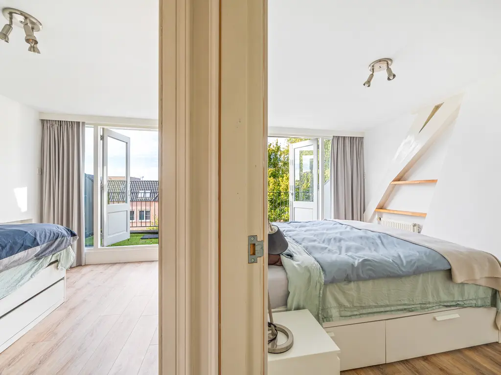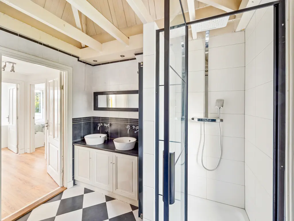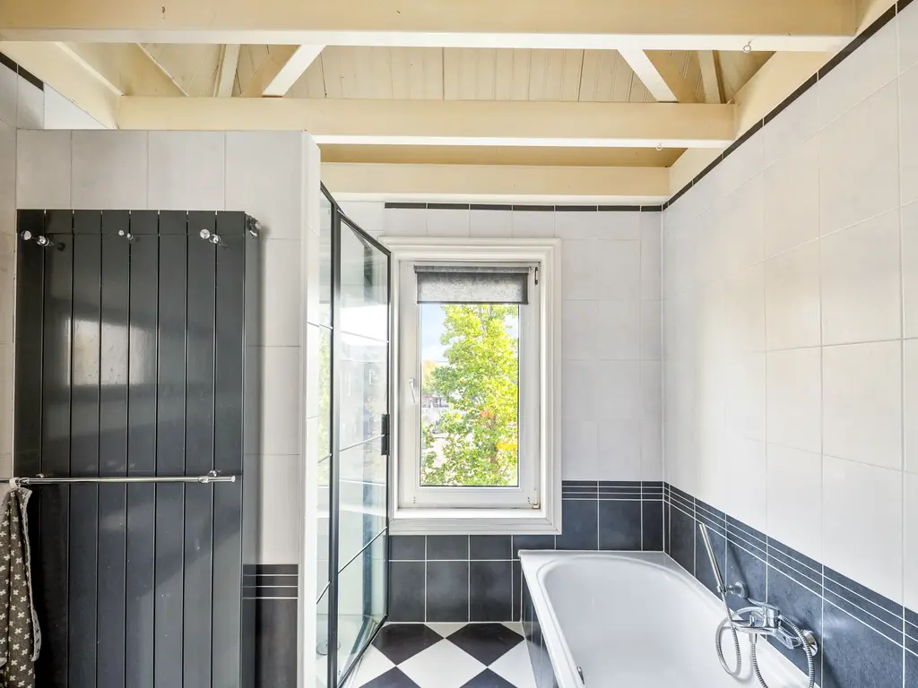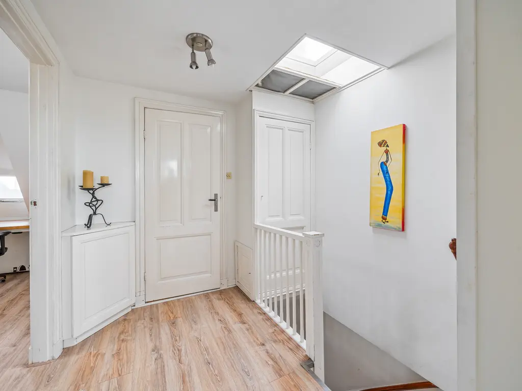 Een dichte houten trap komt uit op de overloop. Een lichtkoepel in het trapgat zorgt voor extra daglicht. Hier bevindt zich in een dichte kast ook de cv-installatieTwee van de drie slaapkamers liggen aan de achterzijde en hebben een afmeting van resp. 12.5m² en 7.9m². Beide slaapvertrekken geven toegang tot een balkon van 11 m². De aan de voorzijde gelegen slaapkamer (11m²) beschikt over een dakkapel, een vaste kastenwand en knieschotten. De eveneens aan de voorzijde gelegen badkamer is uitgerust met een ligbad, douchecabine (voorzien van rainshower), dubbele wastafel en 2e toilet . Verder geeft de badkamer zicht op de originele en fraaie balkenconstructie van het torendak (5 meter hoog!).