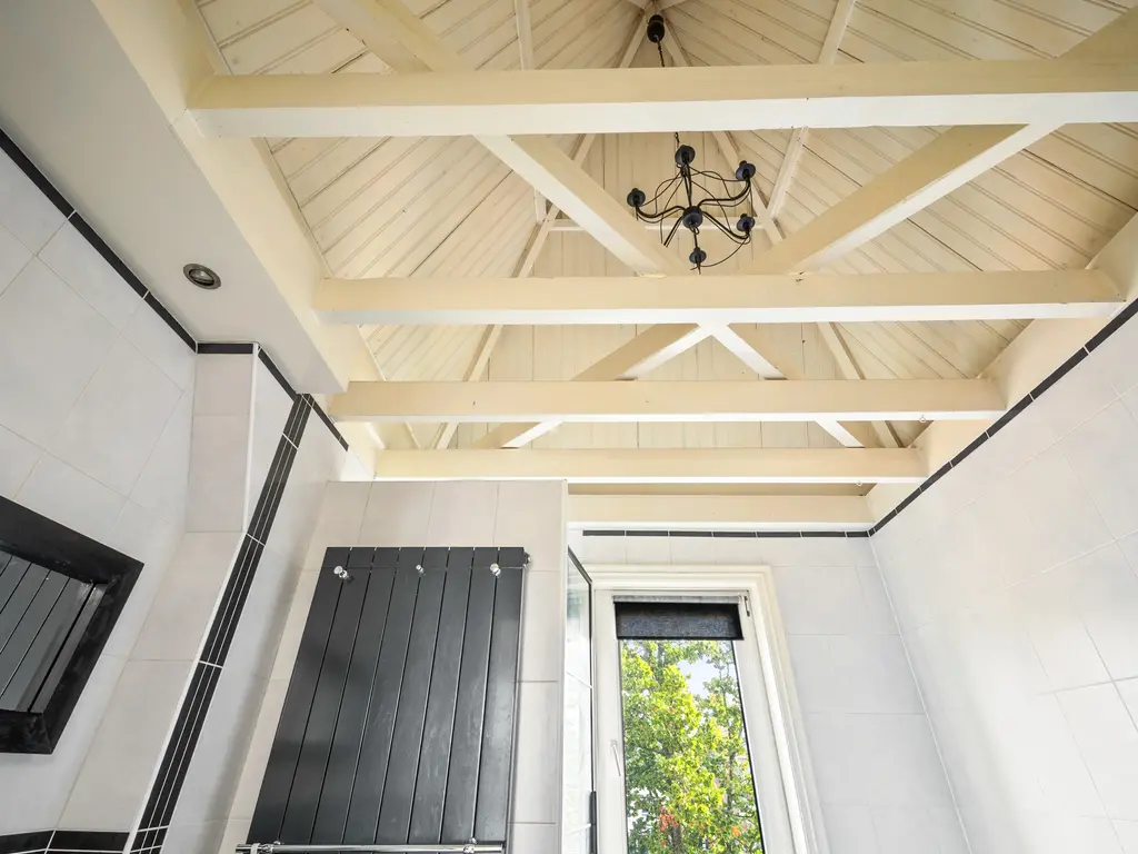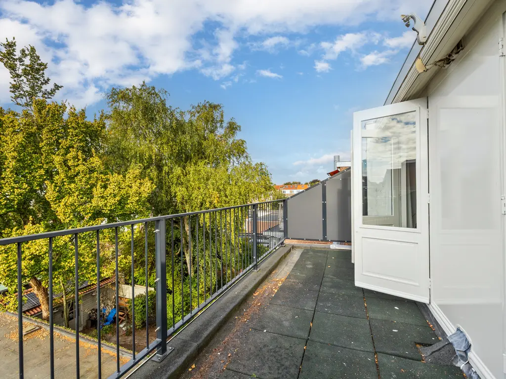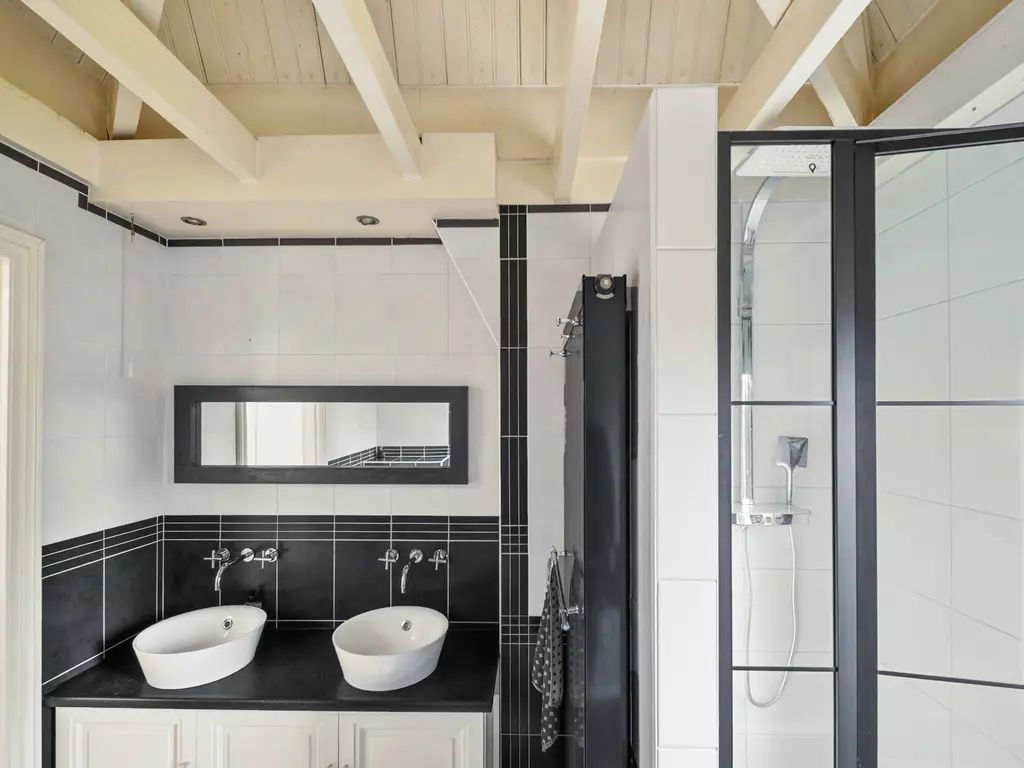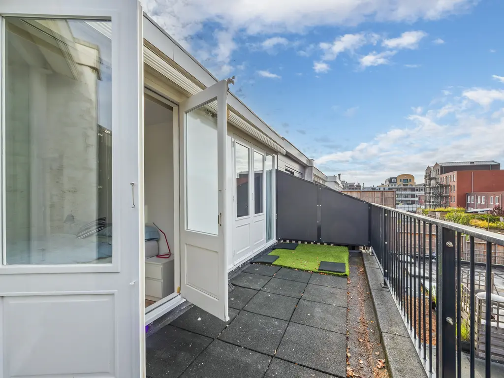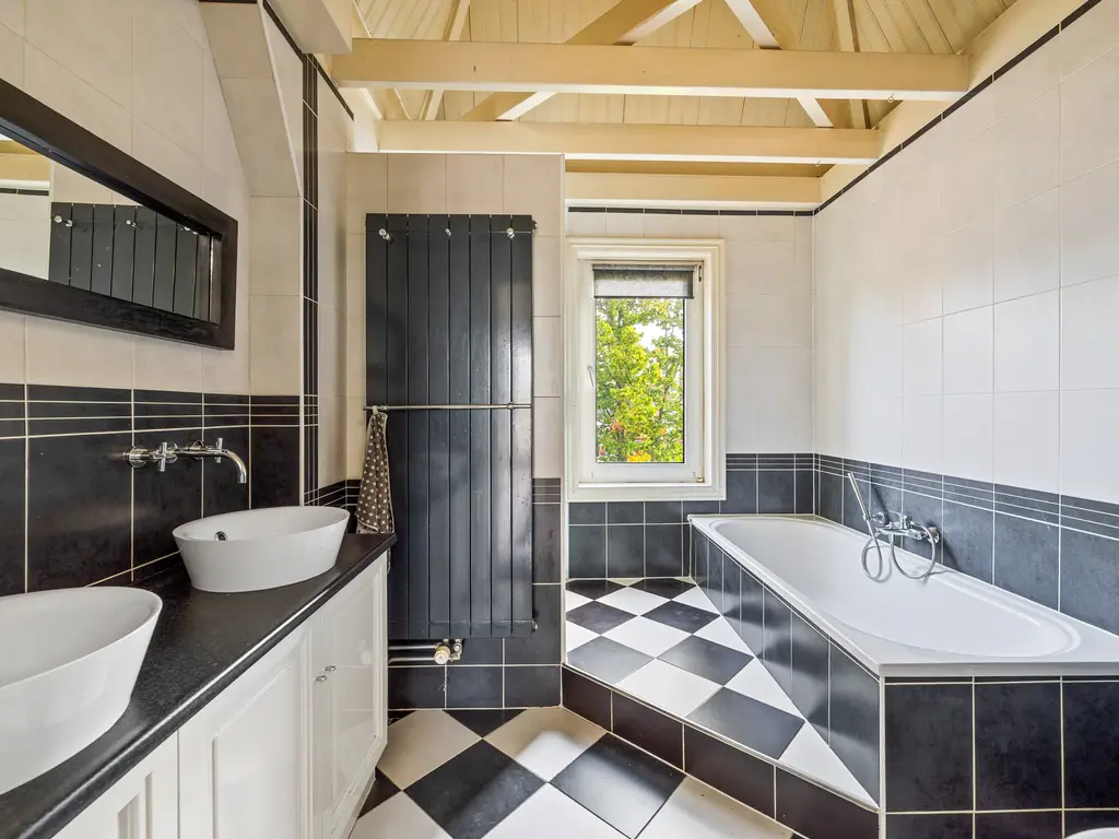 Een dichte houten trap komt uit op de overloop. Een lichtkoepel in het trapgat zorgt voor extra daglicht. Hier bevindt zich in een dichte kast ook de cv-installatieTwee van de drie slaapkamers liggen aan de achterzijde en hebben een afmeting van resp. 12.5m² en 7.9m². Beide slaapvertrekken geven toegang tot een balkon van 11 m². De aan de voorzijde gelegen slaapkamer (11m²) beschikt over een dakkapel, een vaste kastenwand en knieschotten. De eveneens aan de voorzijde gelegen badkamer is uitgerust met een ligbad, douchecabine (voorzien van rainshower), dubbele wastafel en 2e toilet . Verder geeft de badkamer zicht op de originele en fraaie balkenconstructie van het torendak (5 meter hoog!).
