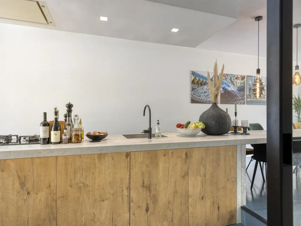 Bij binnenkomst word je direct verrast door de open woonkeuken. Het industriële karakter van de gietvloer en brick wall vormt een perfect contrast met de warme houttinten van de keuken. De keuken is voorzien van alle gewenste apparatuur: vaatwasser, oven, magnetron, koelkast, vriezer, gaskookplaat en afzuigkap. Dankzij de diepe lades heb je volop bergruimte. Boven de keuken is een grote koof gebouwd waarin de verlichting en afzuigkap zijn verwerkt. Een bijzonder stijlvol element is het blad dat voor de helft keukenblad is en de andere helft de eettafel vormt, heel mooi gedaan. Voor het eetgedeelte is een verhoging gebouwd voor de ideale zithoogte aan de tafel!