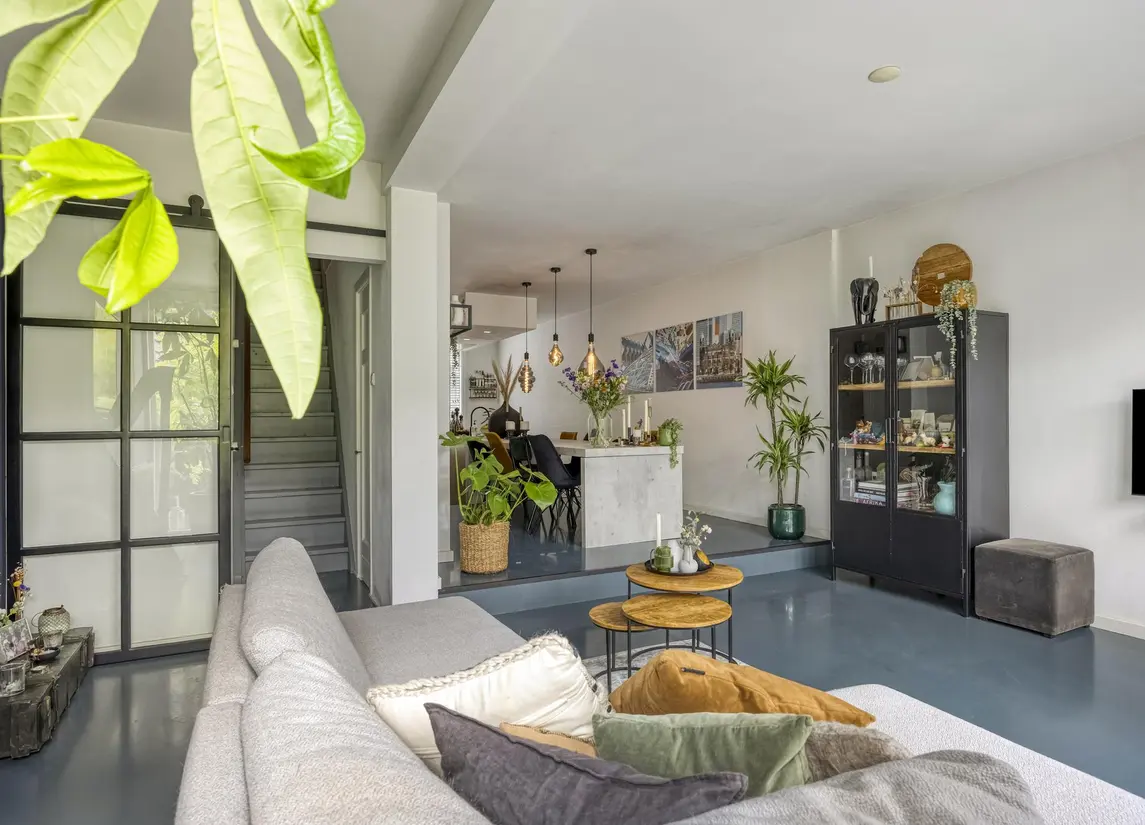 Dan stappen we het podium af de woonkamer in. Zeer licht door de grote pui met openslaande deuren en aan weerszijden en erboven grote ramen. Hier is de achterkamer bij de woonkamer getrokken en de oorspronkelijke tuindeur is vervangen door een enorm raam wat voor nog meer licht zorgt. Een heerlijke ruime zithoek om TV te kijken, een boek te lezen of met vrienden lekker bij te kletsen.
