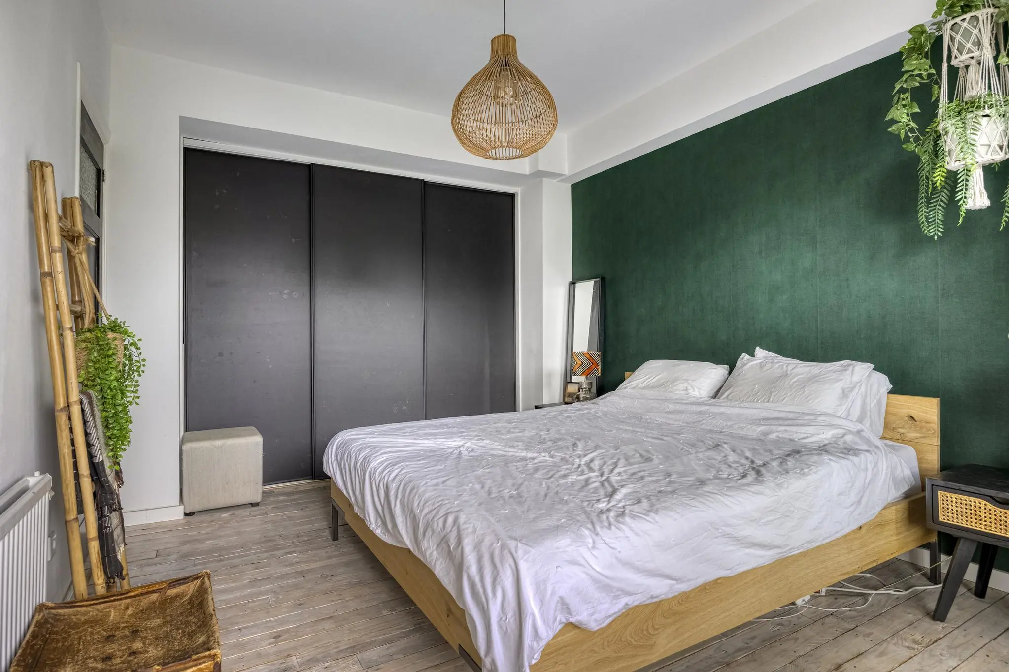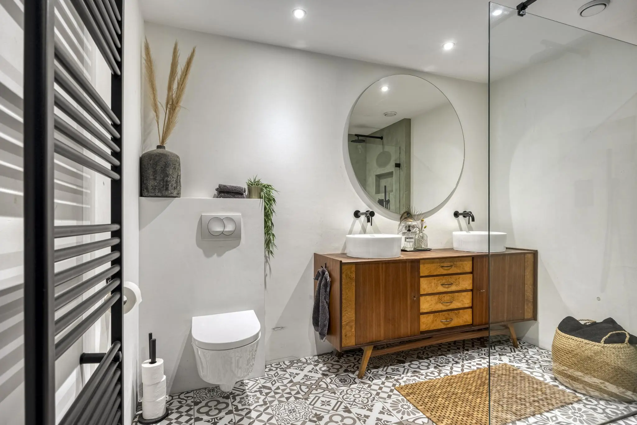 Via de stalen schuifdeur lopen we de hal in waar het toilet zich bevindt en waar we met de trap naar de eerste verdieping lopen. Daar treffen we drie slaapkamers (15 m², 13 m² en 7 m²), allemaal voorzien van een houten vloer en strak afgewerkte wanden en plafonds. De master bedroom heeft een inbouwkast met schuifdeuren én toegang tot een inpandig balkon (4 m²). De badkamer is echt top, waar hout, beton en Portugese tegels samenkomen in een ontwerp dat zo uit een luxe spa lijkt te komen, compleet met inloopdouche, dubbele wastafel, toilet en handdoekradiator. Het niveauverschil op deze verdieping geeft een leuke extra dimensie.