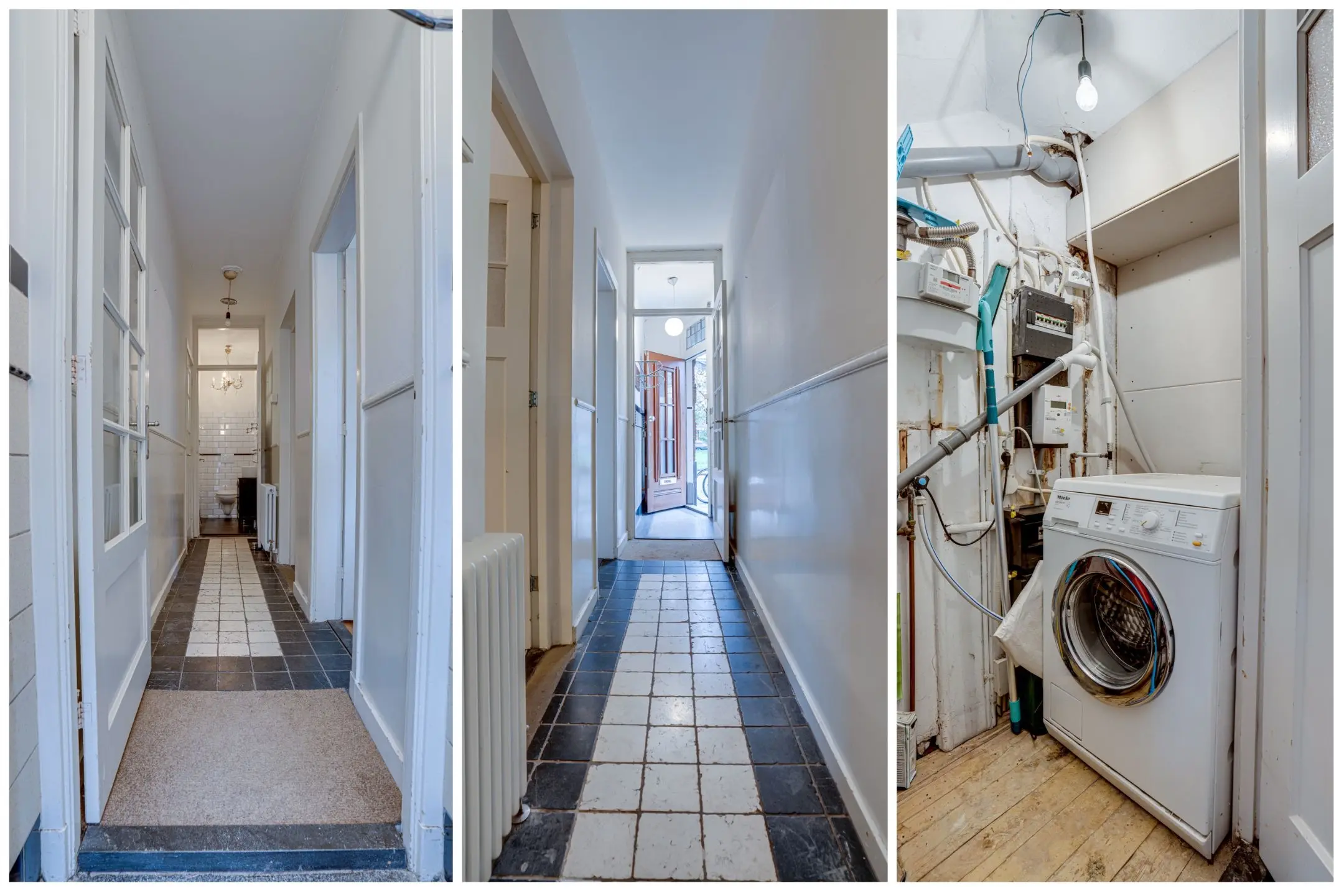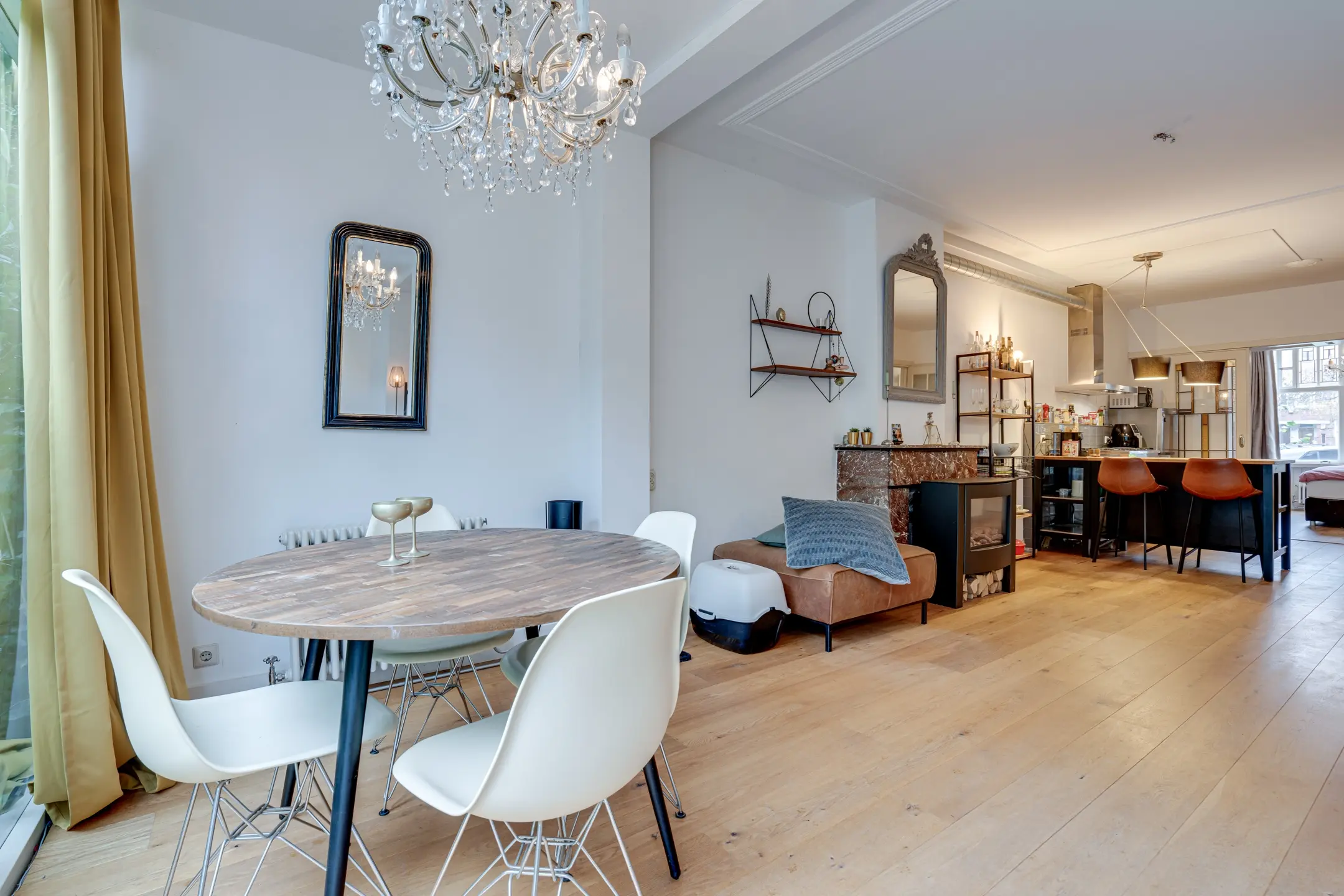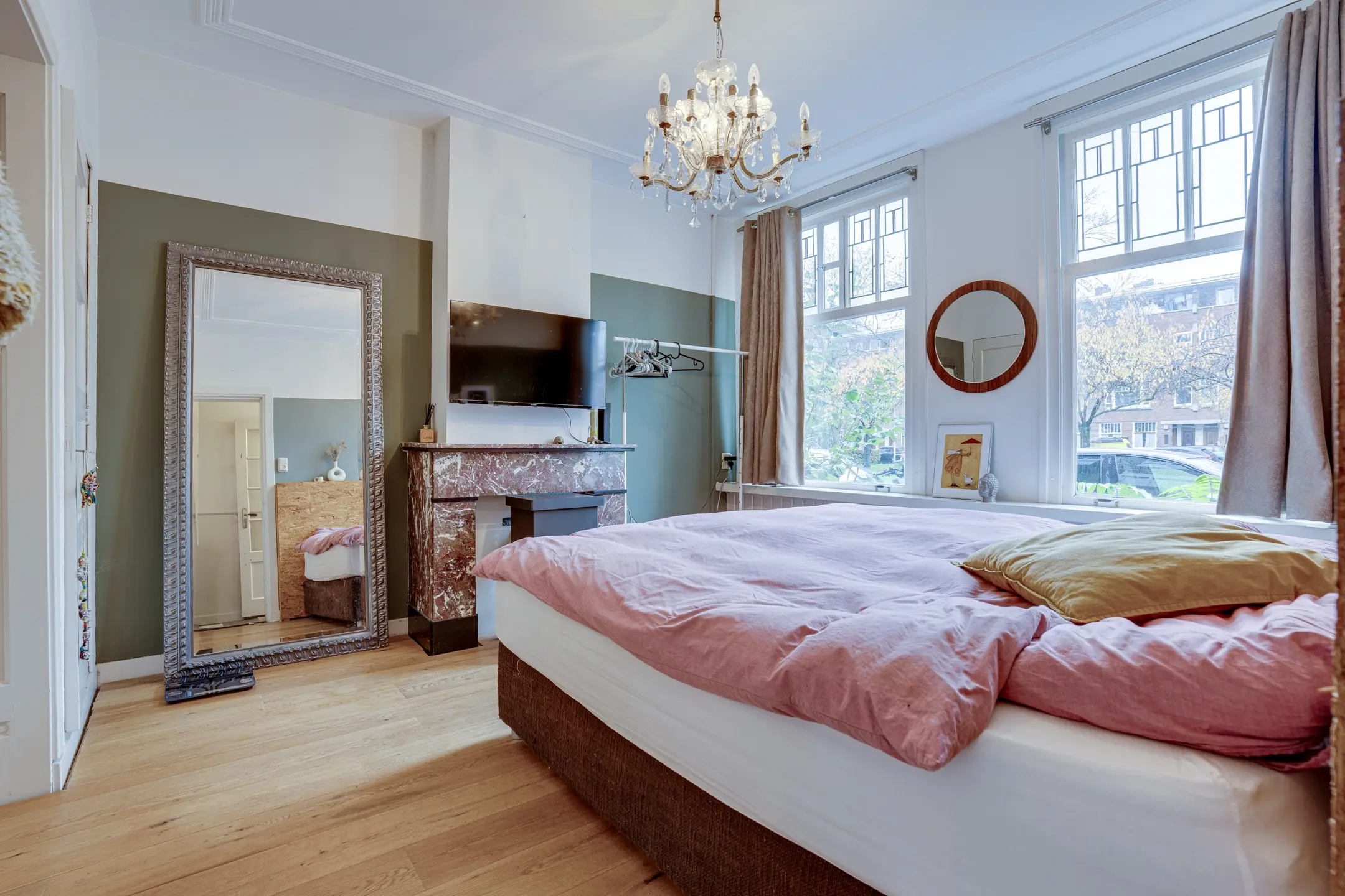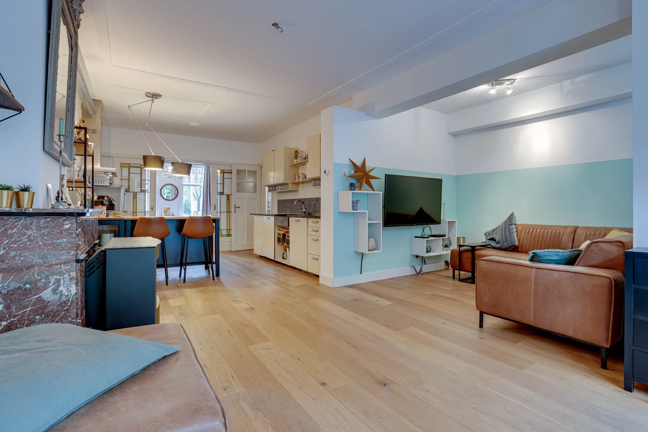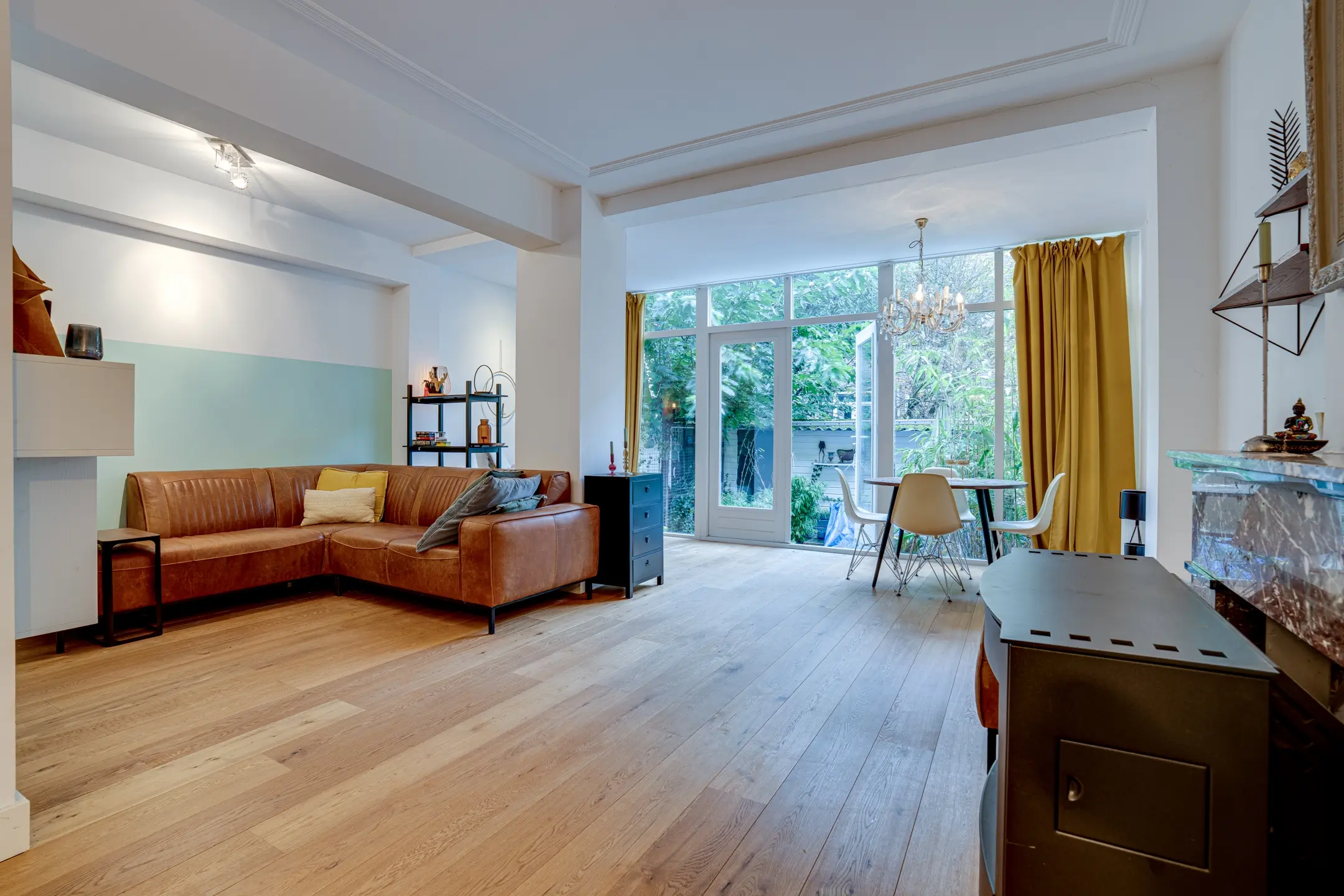 Authentieke details: twee marmeren schouwen met gashaard, glas-in-loodramen, paneeldeuren, schuifseparatie, plafondlijsten